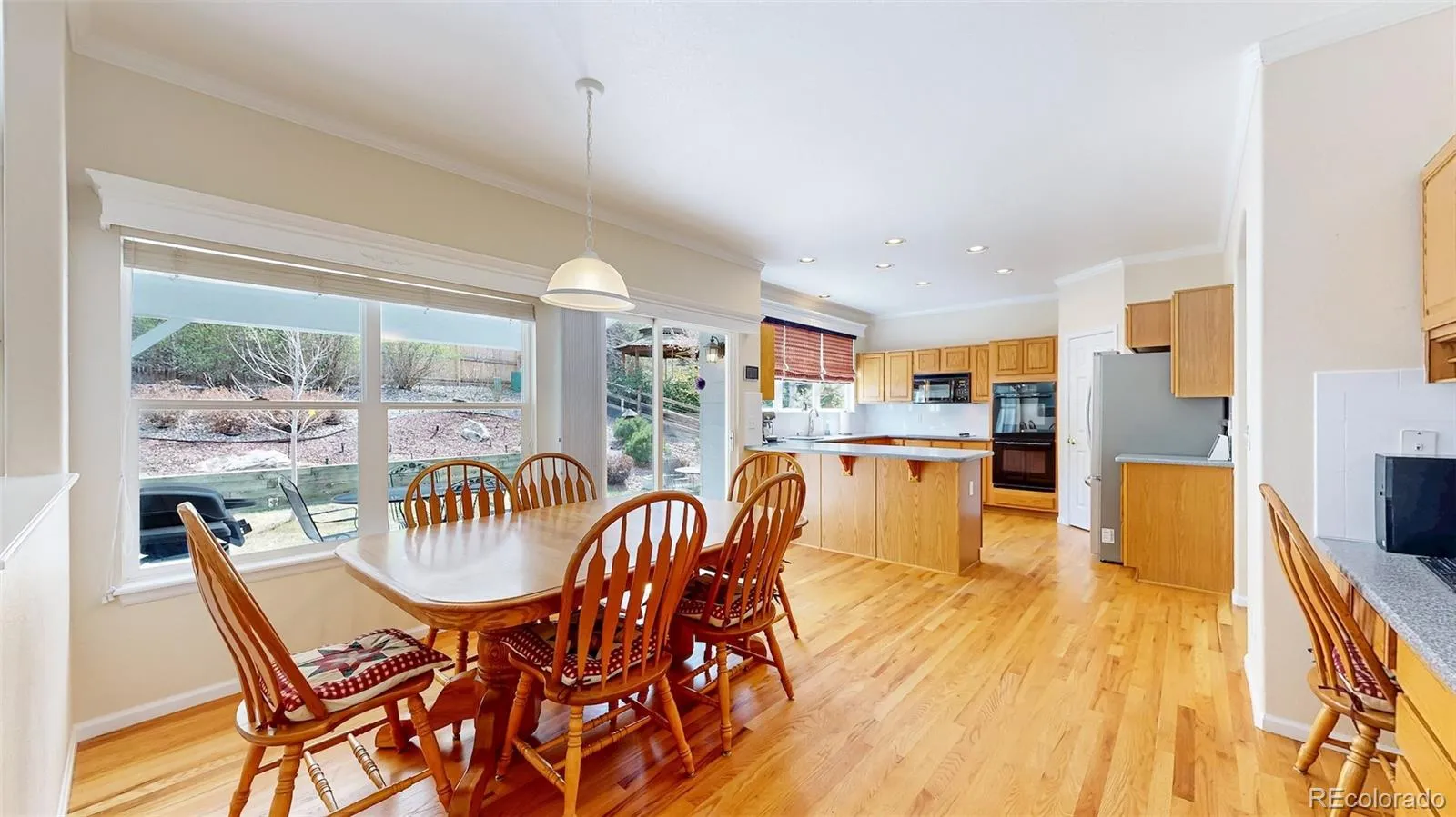 Inside, you’ll find warm hardwood floors, an inviting entry with open staircase, and multiple living areas ideal for both relaxing and entertaining. The bright kitchen features abundant cabinetry, generous counter space, double ovens, and a peninsula that opens to the dining area with large backyard-facing windows for excellent natural light.