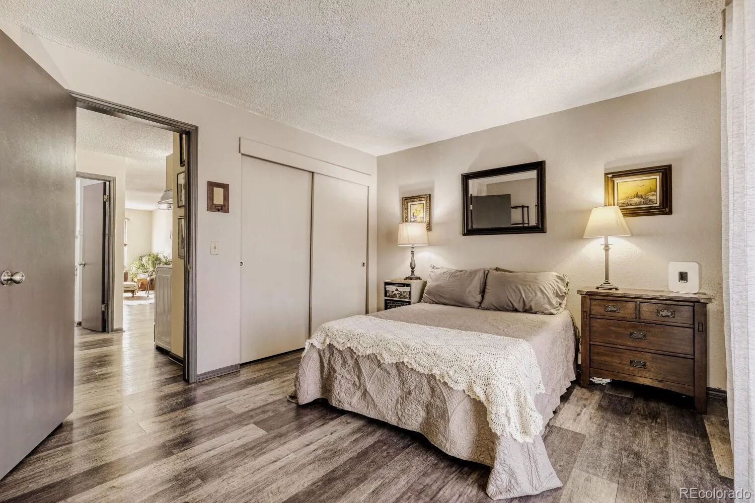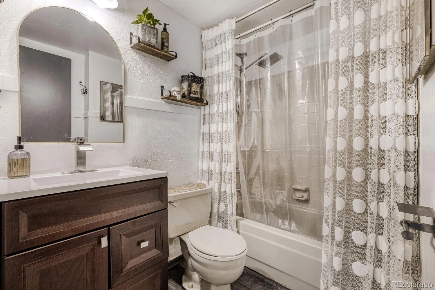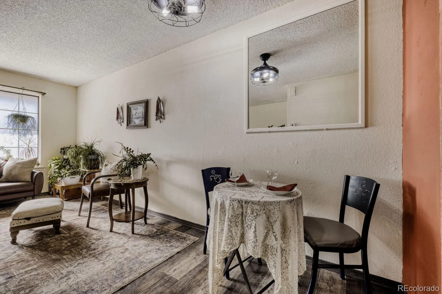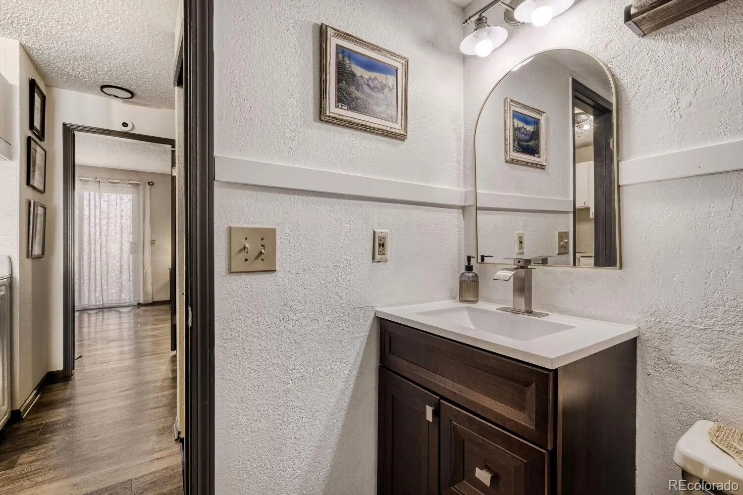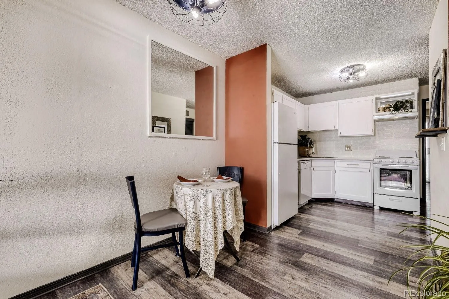 It may be small, but it is mighty! This thoughtfully updated condo packs incredible style and functionality into its efficient footprint. The home features new LVP flooring (Bradbury Hill Oak) throughout and a beautifully refreshed kitchen with updated cabinet doors, hardware, countertops (2022), backsplash, dishwasher, and vent hood. Additional upgrades include new light fixtures in the kitchen, dining area, and bathroom, plus updated register covers and an electronic door lock with a changeable entry code for added convenience and security. The bathroom has also been refreshed with a new vanity, faucet, and shower head, while the living space is enhanced by a modern electric fireplace with hearth—perfect for cozy Colorado evenings. Major appliances including the stove and washing machine were replaced in 2022, and the home is equipped with two 10-year smoke/carbon monoxide detectors for peace of mind. This condo proves that great things truly come in small packages, offering stylish upgrades, smart improvements, and comfortable living in a compact space.