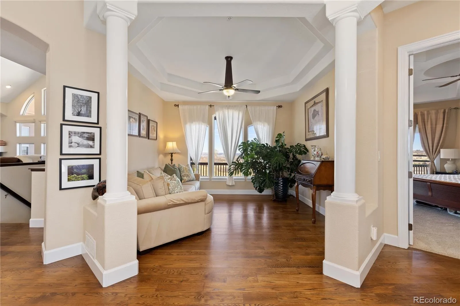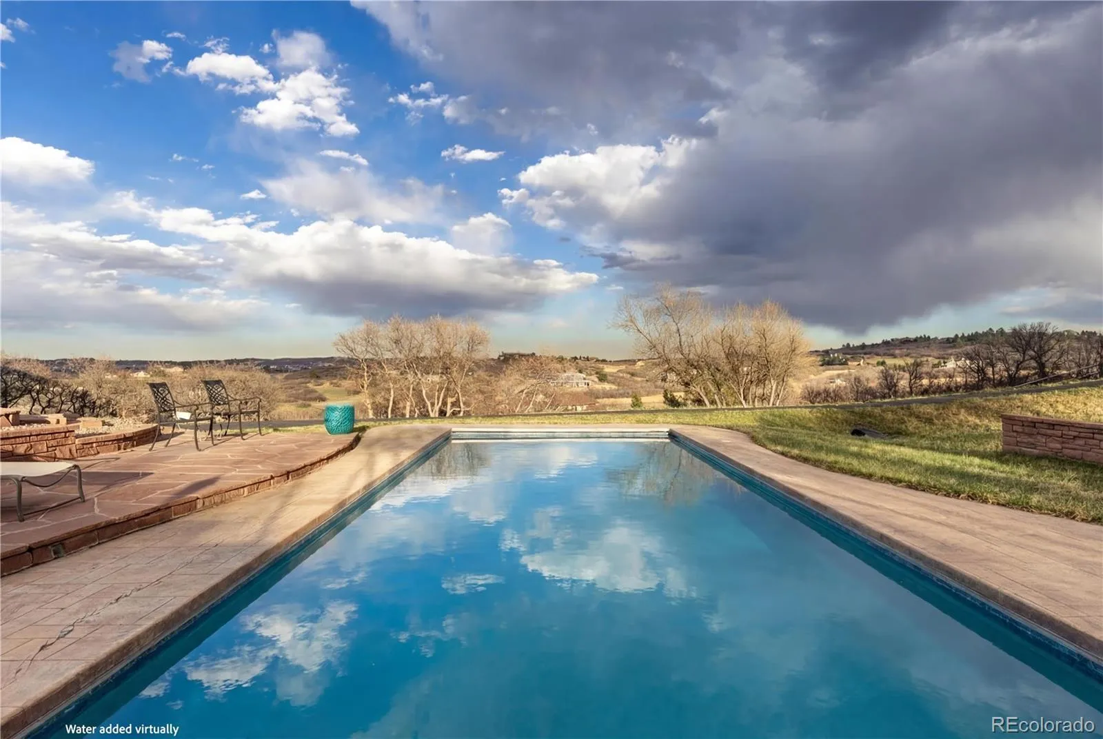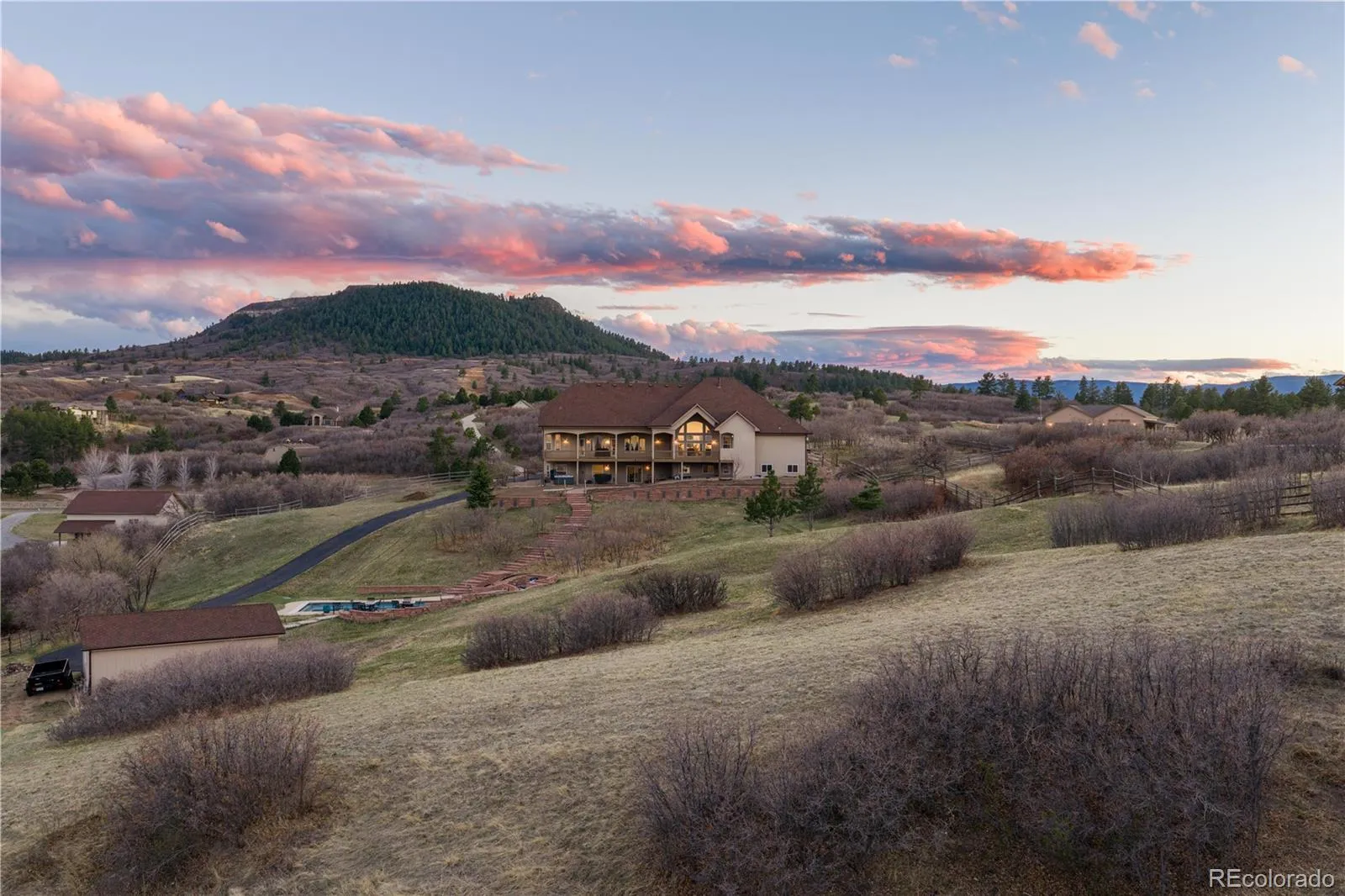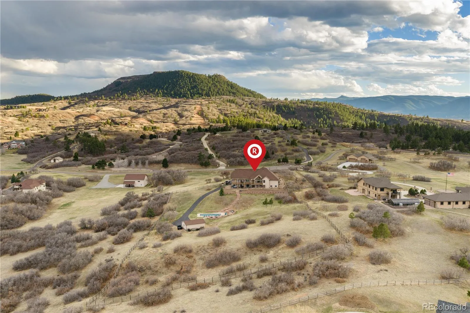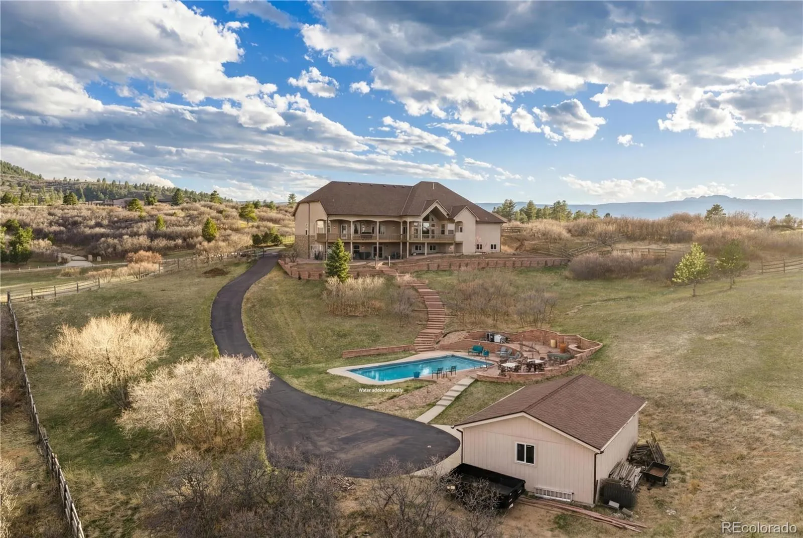 Welcome to your private Colorado sanctuary in the prestigious Keene Ranch community of Castle Rock. Situated on a gated, 7-acre lot with breathtaking mountain and valley views, this estate perfectly blends sophisticated design with the serene beauty of the Front Range. Your experience begins at the front gardens, where a custom fountain provides a soothing backdrop for your morning coffee. Inside, the grand entryway is flanked by a formal dining room and a stately sitting room. The home opens into a spectacular main living space with soaring vaulted ceilings and wood flooring. The chef’s kitchen is a masterpiece, boasting dual islands, marble countertops, high-end stainless appliances, and a walk-in pantry. This flows into the family room, where a gas fireplace, sound system, and large sliding doors lead to an expansive deck designed for seamless indoor-outdoor living. The main-floor primary suite is a true retreat, tucked away for privacy with deck access and a spa-like 5-piece en-suite bath featuring dual vanities, a soaking tub, and dual walk-in closets. Two additional bedrooms share a Jack-and-Jill bath, while a laundry room with a utility sink and a powder room round out the main floor. The walkout basement is an entertainer’s dream with a second family room opening to the lower patio. This level includes a media room with a wet bar, game room, exercise room, and a bedroom with a walk-in closet. Step outside to the lower private pool patio that offers a resort like feel to relax while taking in endless vistas. This estate offers unparalleled storage: a 2-car attached garage, an additional 3-car detached garage by the pool, and a guest house with a full bath connected by a breezeway with its own 1-car garage. Every detail of this lifestyle property has been crafted for luxury and peace.