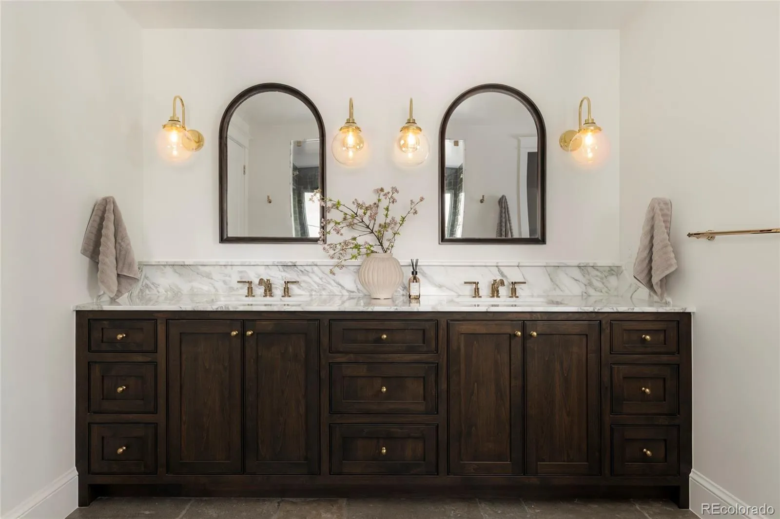 The main level unfolds with effortless elegance, connecting a gracious living room with a custom Calcutta viola marble fireplace, formal dining area, and an inviting breakfast nook featuring a custom built-in bench. At the heart of the home, the chef’s kitchen is a true showpiece, appointed with bespoke cabinetry, Calcutta Monet marble backsplash, a baker’s block and a one-of-a-kind Bluestar range. Expansive windows, European white oak flooring, a newel post featuring a brass finial and thoughtfully designed lighting enhance the home’s warm yet sophisticated ambiance. A private office, enclosed by glass French doors, provides a serene and stylish retreat. Upstairs, the primary suite serves as a tranquil sanctuary, highlighted by soaring ceilings, a custom fireplace, and a spa-inspired bath with limestone flooring. The expansive walk-in closet includes a convenient second washer/dryer hookup. Three additional bedrooms offer exceptional comfort and privacy. The finished lower level is designed for elevated entertaining and wellness, complete with a home gym, additional bedrooms, and a sophisticated bar and lounge area. Situated on an oversized corner lot, the property offers a seamless balance of luxurious indoor living and inviting outdoor spaces. Both classic and contemporary, this Observatory Park residence embodies sophisticated design, premier amenities, and an elevated lifestyle in one of Denver’s most prestigious neighborhoods.