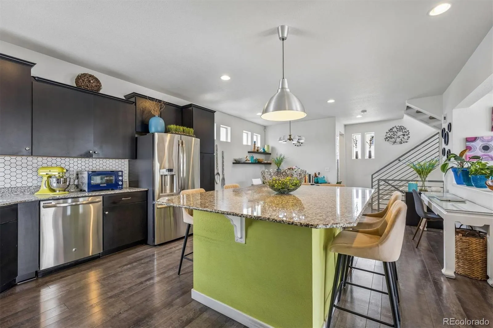 It’s so easy to fall in love with this four-bedroom home. A wrap-around porch and paver stone driveway welcome you as you approach the property. The main level features an open-concept kitchen, dining area, and living room. The kitchen is appointed with high-end amenities including stainless steel appliances, a tiled backsplash, wood cabinetry with crown molding, and a spacious granite island. The living room extends onto a balcony, providing an ideal space for evening relaxation. The back deck overlooks a landscaped yard and shades the extended patio below. The ground floor comprises an additional bedroom and a full bathroom, suitable for overnight guests. A versatile room with a sliding door opens out to a covered patio area. Ascending to the upper level, two generously sized landings offer opportunities for personal creativity. The main bedroom has an ensuite with dual sinks and a walk-in closet, and the laundry room is next to the bedrooms. Within walking distance, residents have access to the Green Valley Ranch Recreation Center, which features a group fitness studio, locker rooms, a weight room, cardio room, a new aquatic center, gymnasium, game room, classrooms, and multipurpose spaces for rent. Adjacent to the recreation center is the Green Valley Ranch Towne Center Park, boasting soccer fields, a baseball field, basketball court, skate park, and pond. Community events like a farmers market and concerts, are held every Wednesday throughout the summer. Green Valley Ranch Golf Club which is home to them award-winning 18-hole Championship course is also nearby. This property is conveniently located near Denver International Airport, I-70, E-470, Pena Blvd, and light rail, with shopping, sporting venues, and restaurants just minutes away. This home is a perfect mix of Saturday night and the rest of your life.