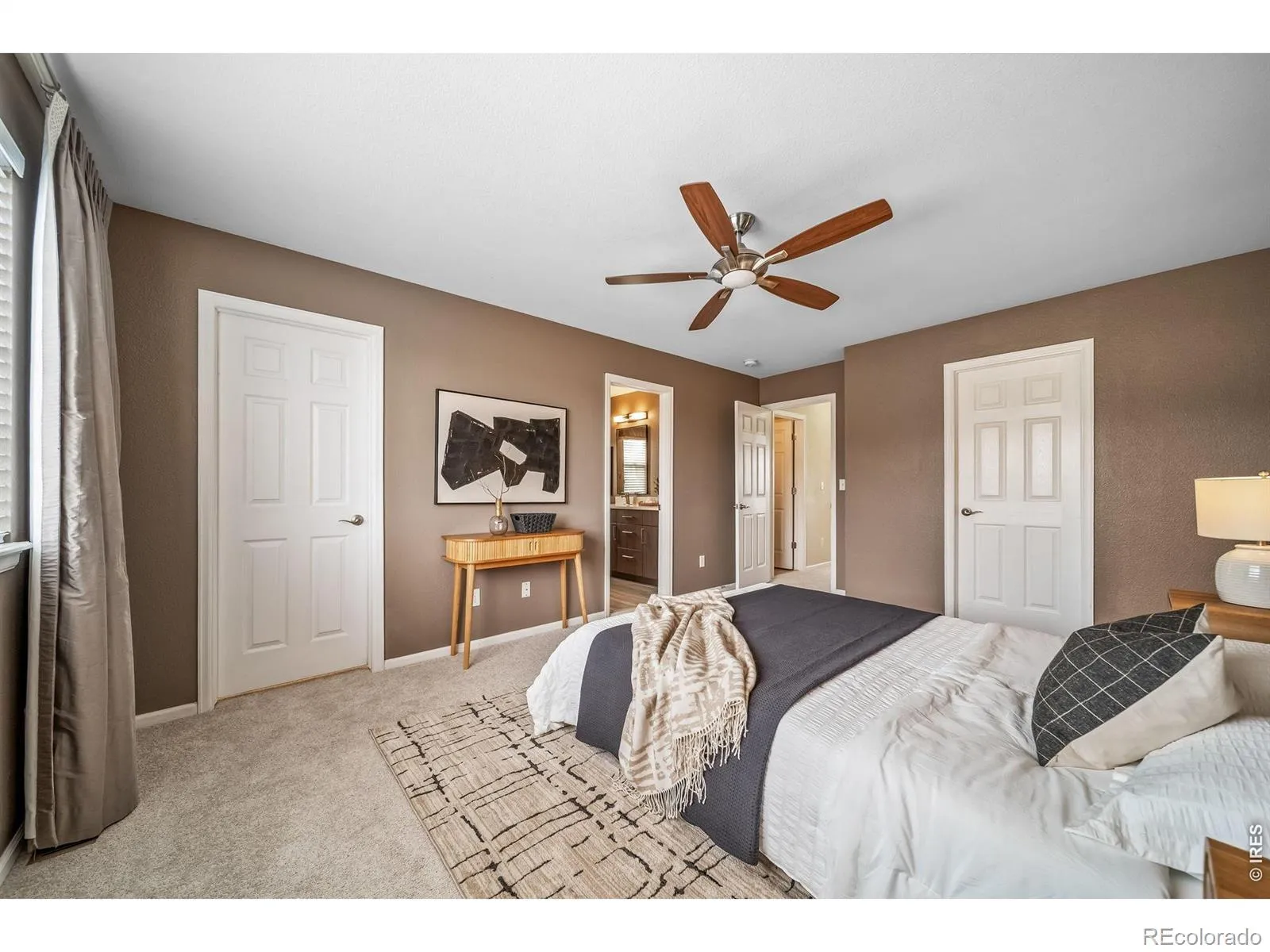 Immaculate updated Rock Creek 2-story on a quiet cul-de-sac! Original owner!. Major updates in the past 4 years includes new roof, exterior paint, interior paint, and carpet throughout. Remodeled kitchen (2022) with quartz counters and high end stainless appliances (all included, plus washer and dryer). All baths updated with quartz counters (2022) and custom surrounds.Spacious 26×13 timber tech deck with motorized retactable awning. Finished daylight basement features rec room with curved glass block wall, reading nook with built ins, 5th bedroom, 3/4 bath and 2 large storage areas.Beautifully landscaped yard with mature trees and smart phone controlled sprinkler system. Heated floor in primary bath. Central air, newer 96% efficient furnace and water heater. Finished insulated, drywalled garage. Pre-wired for whole-house generator.Close to open space, parks, schools and shopping.