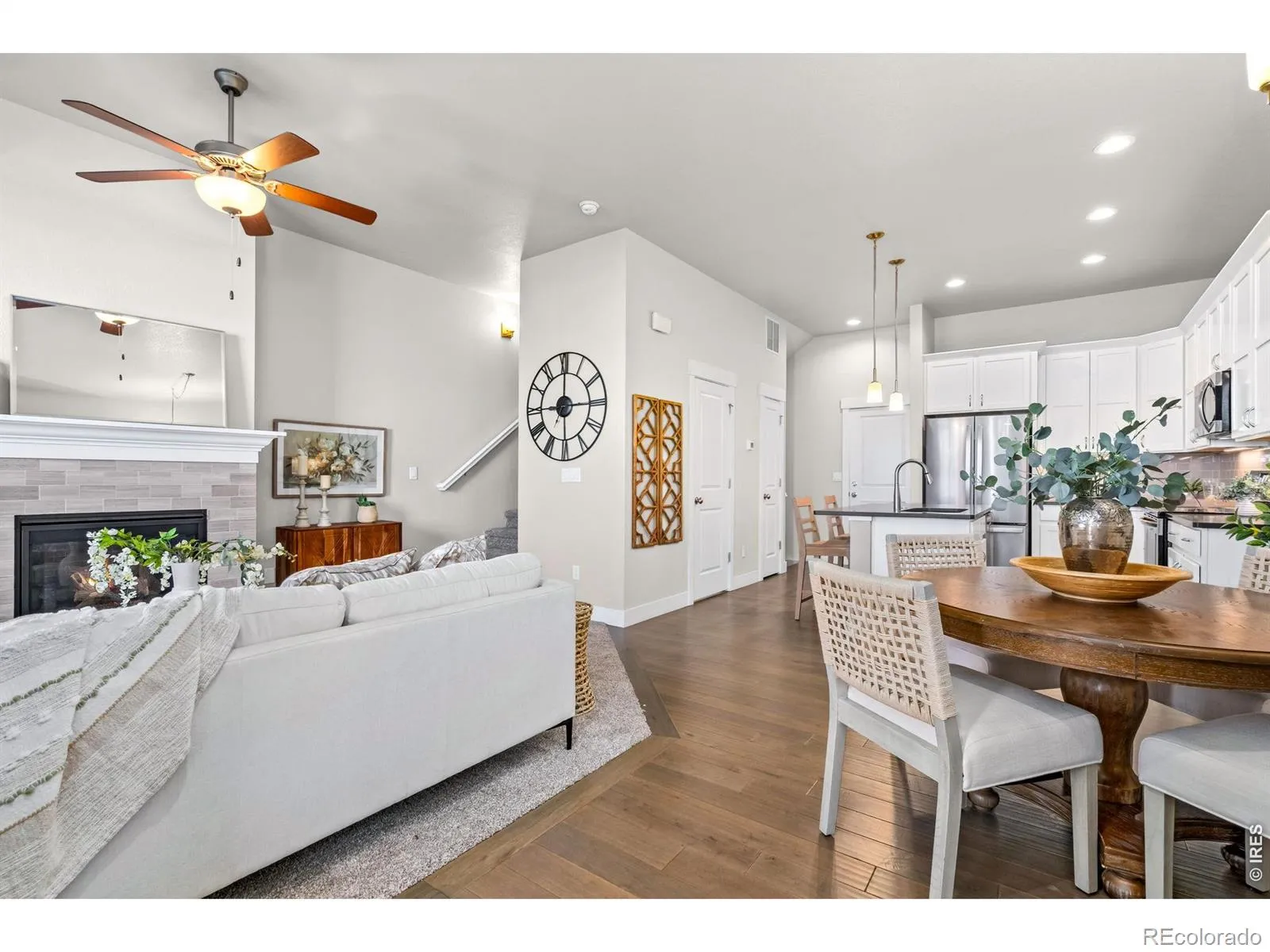 Mountain views! This pristine Landmark townhome offers better value than new construction, featuring a full basement for future expansion, storage, or a play area. This Barrington model includes designer finishes, white cabinets, pantry, wood floors, quartz counters, large island, and a cozy fireplace. Each bedroom can function as a primary suite due to its large size and ensuite bathrooms. One bedroom has a luxury 5-piece bathroom and both have walk-in closets. Upstairs also has a separate loft space perfect for a desk or reading nook. All appliances are included and the home features an attached 2-car garage. The basement includes an egress window and rough-in for bathroom. Enjoy the low maintenance lifestyle and amenities in Timnath Ranch. Pool season is almost here!