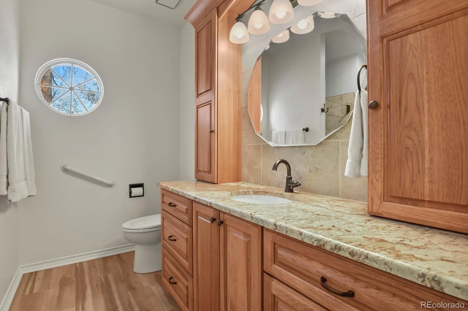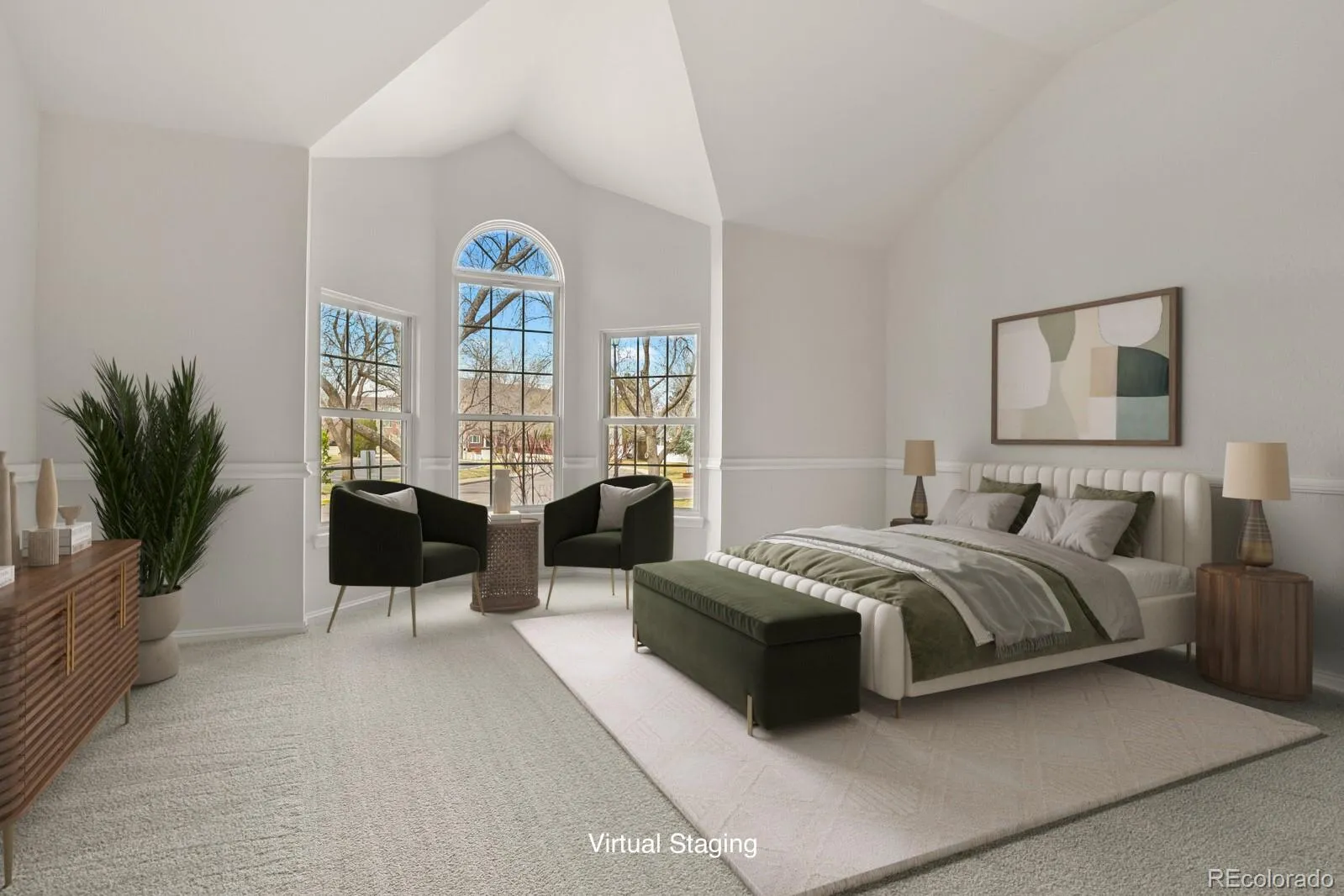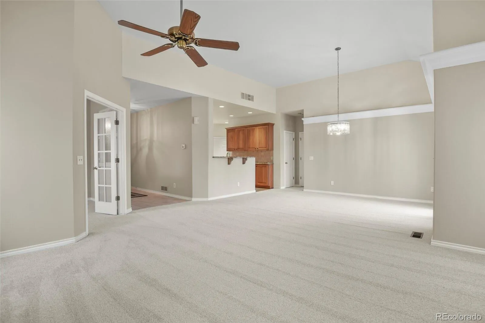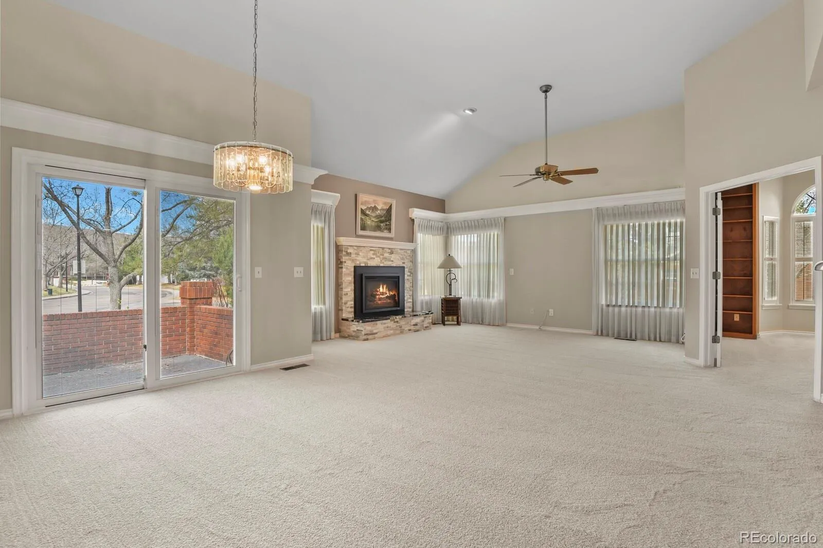 Great low-maintenance living in the highly sought-after Riverwalk Community in Littleton! This beautiful spacious end unit, ranch-style patio home has an open layout filled with natural light, highlighted by vaulted ceilings throughout and large windows on 3 sides! Bedrooms in separate wings for great privacy with an office in between. The sunny and airy living room has a beautiful gas fireplace and is open to a dining area with access to a private patio. The kitchen with eat-in area is thoughtfully remodeled with custom Pecan cabinets, solid granite countertops, reverse osmosis water, all appliances including two ovens, as the microwave also serves as the second convection oven, induction cooktop with retractable fan and kitchen opens seamlessly to the dining and living areas—ideal for entertaining. The spacious primary suite features a walk-in closet and luxurious five-piece ensuite with a soaking tub and sun tube for natural light. Updated 3/4 bathroom with laundry conveniently located on the main floor. The office space has French doors and built-ins. A finished basement provides additional flex space for various uses or another potential bedroom, along with ample storage. Freshly painted with new carpet everywhere and new foyer tile plus many extras – electric awnings and curtains, set up for backlighting in the crown moulding and kitchen, whole house fan, high efficiency furnace and new water heater. Residents enjoy resort-style amenities including a large clubhouse very nearby with outdoor pool, hot tub, sauna, fitness center, billiards room, and social spaces—all without the hassle of yard work or snow removal. Not in the path of golf balls! Located minutes from downtown Littleton, light rail, shopping, dining, and more, this move-in ready home truly combines comfort, convenience, and lifestyle in one exceptional package.