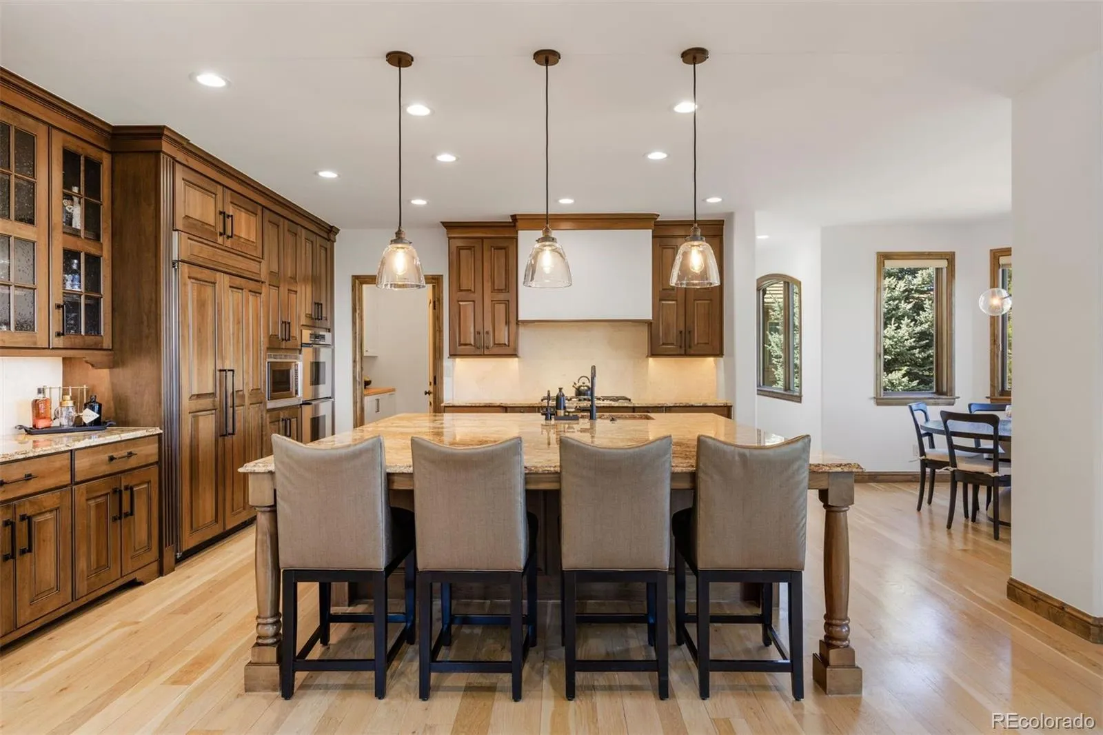 Set within the coveted Amber Ridge community, this 6 bedroom | 5 bathroom residence is a rare combination of thoughtful updates, inviting gathering spaces, and one of the largest flat back yards in the neighborhood – offering TRUE Colorado indoor-outdoor living. From the moment you arrive, you feel a sense of refinement with updated paint throughout, wide-plank hardwood floors, and new carpet. Creating a fresh, cohesive aesthetic, natural light flows across all interior rooms, enhancing both the scale and warmth of each space. The main level unfolds with well-balanced living and entertaining options, including a great room with fireplace, large dining room, and a spacious kitchen with updated tile backsplash, Dacor appliances, center island, and 2 walk-in pantries – one fully customized. A stately private office with additional fireplace, laundry room, mud room, powder room, and 3-car garage complete the well-planned main level. Upstairs, the primary suite features vaulted ceilings, a sitting area, 5-piece bathroom, and sizable closet. Four additional bedrooms include two connected by a shared bathroom, one currently used as a playroom, and another served by a full bathroom, creating a flexible and functional layout. The walkout basement is simply fantastic, extending the living space with a rec room anchored by a full bar featuring a coffered tray ceiling, as well as a refrigerator, ice maker, dishwasher, and microwave. A separate built-in dining area, family room, and game room make this level perfect for entertaining, while the guest suite and 3/4 bathroom offer room for all. A bonus, outdoor living is showcased by a covered deck with cozy stone fireplace and a built-in stainless steel gas grill. The huge back yard with integrated trampoline offers exceptional space for all day play. Positioned within a sought-after gated setting near top-rated schools, trails, and everyday conveniences, this home checks every box for those seeking to live in Castle Pines.