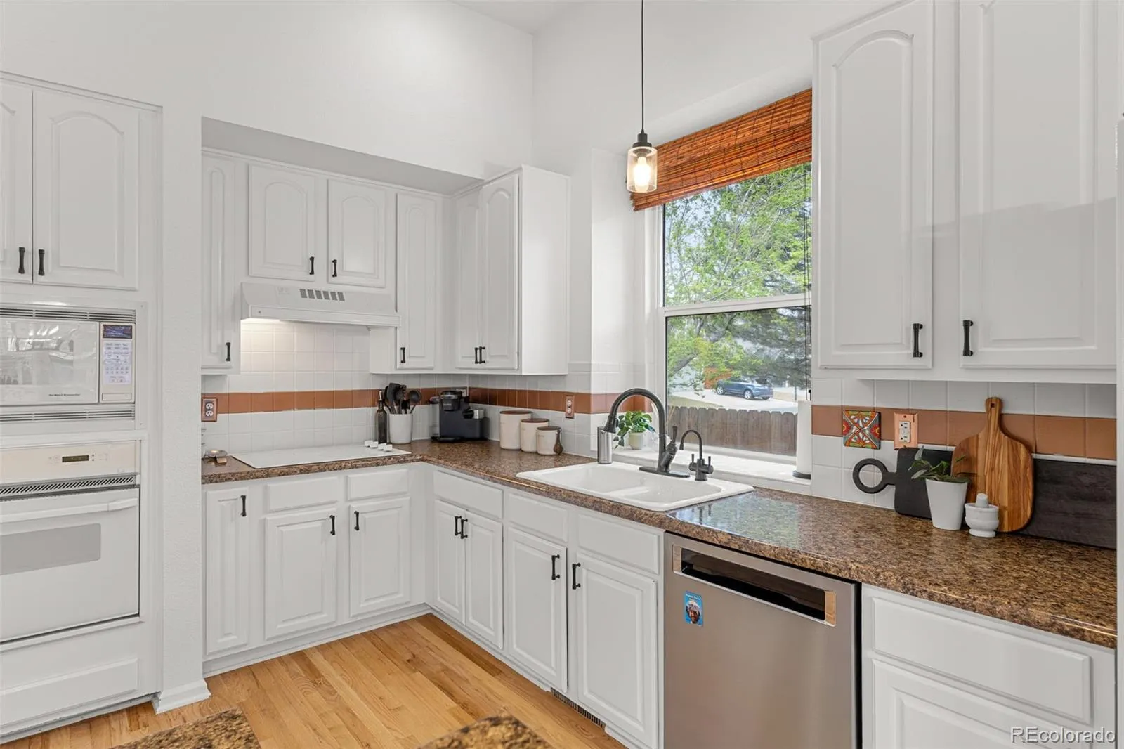 Step inside to discover an open floor plan with vaulted ceilings and timeless details like solid wood six-panel doors and bright sunny windows throughout. The heart of the home opens to a park-like backyard oasis, complete with a sprawling patio, low-voltage lighting, mature landscaping, and a sprinkler system—perfect for unwinding or entertaining.
