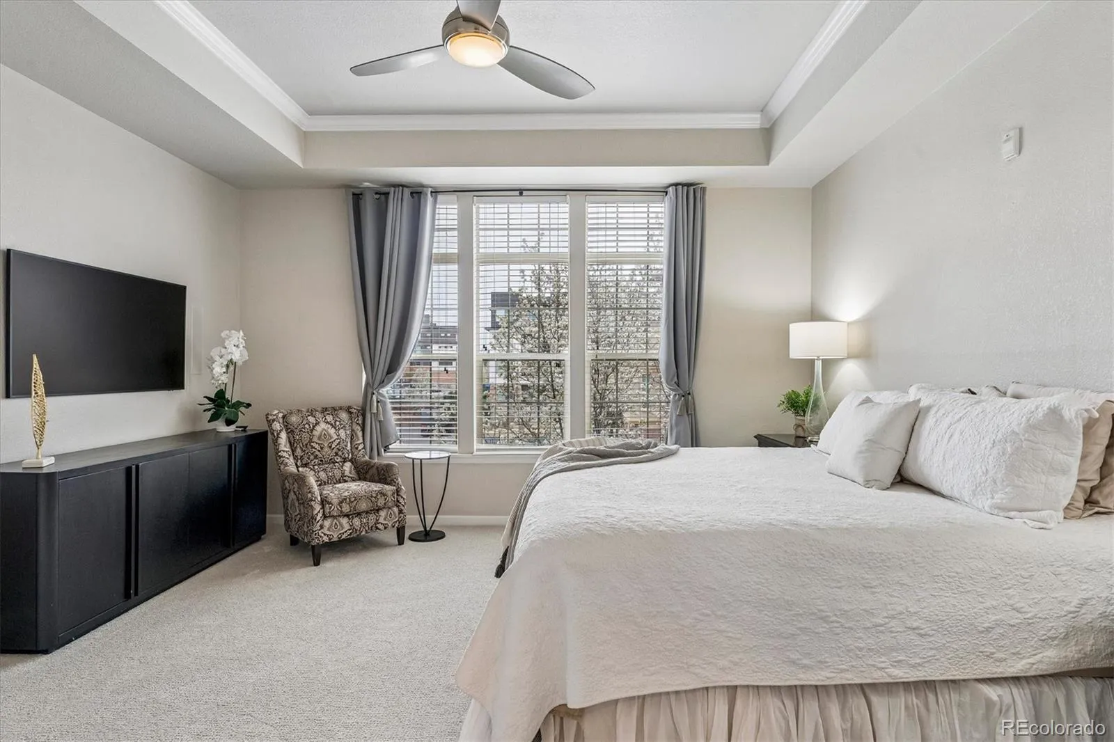 Welcome to an exceptional opportunity in the highly sought-after secure building in Vallagio at Inverness—this rare southwest corner-unit, 3-bedroom luxury condo offers the perfect blend of privacy, natural light, and upscale finishes in one of the Denver Tech Center’s most vibrant communities. Positioned on a premium corner, this residence features 10′ ceilings, hardwood floors and new carpeting. This spectacular unit is filled with expansive windows that flood the home with sunlight and showcase beautiful views. The open-concept layout is ideal for both everyday living and entertaining, featuring a spacious great room, elegant dining area, and seamless flow into a thoughtfully designed kitchen complete with spacious granite island and newer stainless steel appliances. The living area is generously sized and includes a gas fireplace with updated split stone surround with mantle. The living room opens to a spacious balcony with room for a table plus additional seating and a gas connection for a BBQ grill.