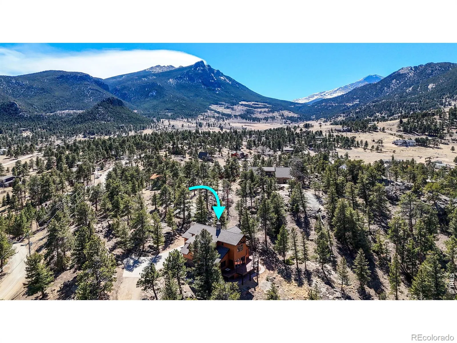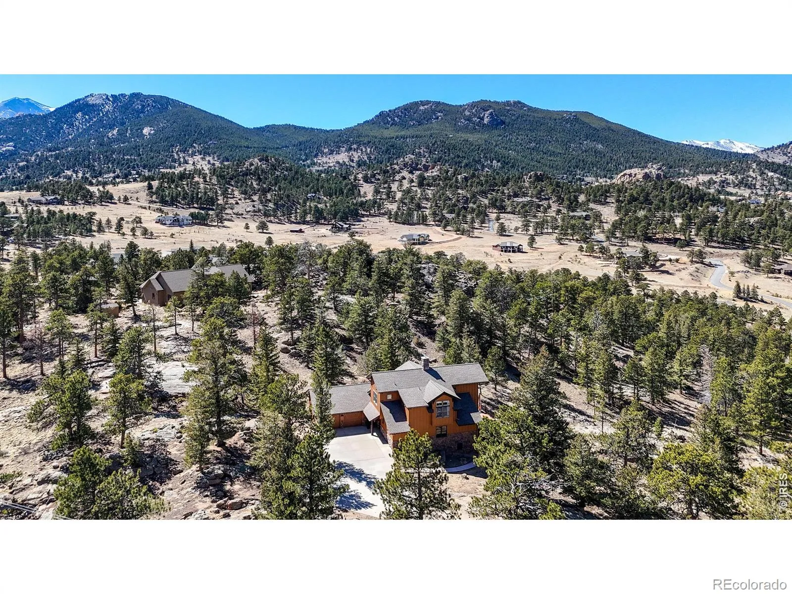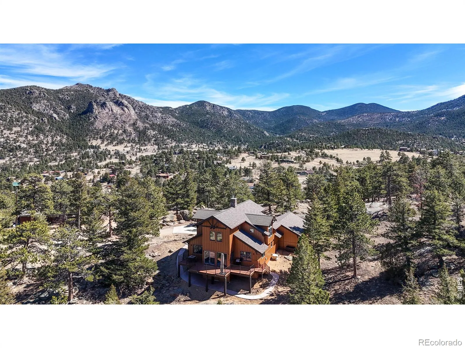 Tucked away on 2.78 private mountain-view acres surrounded by rock outcroppings and mature trees, this beautifully updated main-level living home (no steps from the front door and garage to the main floor) offers privacy, space, and modern comfort just minutes from downtown Estes Park and Rocky Mountain National Park. Enjoy stunning Mummy Range views and frequent wildlife sightings, all with year-round access via county-maintained roads. The open floor plan features 3 bedrooms, 2.5 bathrooms, and a spacious loft-style family room, highlighted by soaring cathedral ceilings and a striking fireplace in the main living area. A formal dining area and breakfast bar offer flexibility for entertaining and everyday living. The updated kitchen includes Knotty Hickory cabinetry with slide-out shelving, quartz countertops, upgraded sinks, and a high-end LG and Frigidaire appliance package with air fryer ovens. New flooring throughout blends carpet and Knotty Hickory engineered wood, complemented by fresh interior paint for a move-in ready feel. Comfort is enhanced by a new Heil natural gas furnace and A/C system, a smart 55-gallon Rheem water heater with hot water circulation, and a Mendota 35K BTU gas fireplace. Exterior upgrades include fresh paint, a 2022 Class 4 impact-resistant roof with potential insurance savings, and extensive fire mitigation for added safety and defensible space. The refinished deck with gas hookups is ideal for outdoor living. The oversized, flat two-car garage features MotoFloor tiles, built-in cabinetry, and an extra fridge/freezer, while a fully finished and heated crawlspace offers excellent storage or workshop space. Additional highlights include motorized living room blinds, improved sightlines from tree mitigation, and a private setting not visible from the street. Turn-key potential with negotiable 2023 furnishings completes this exceptional property.