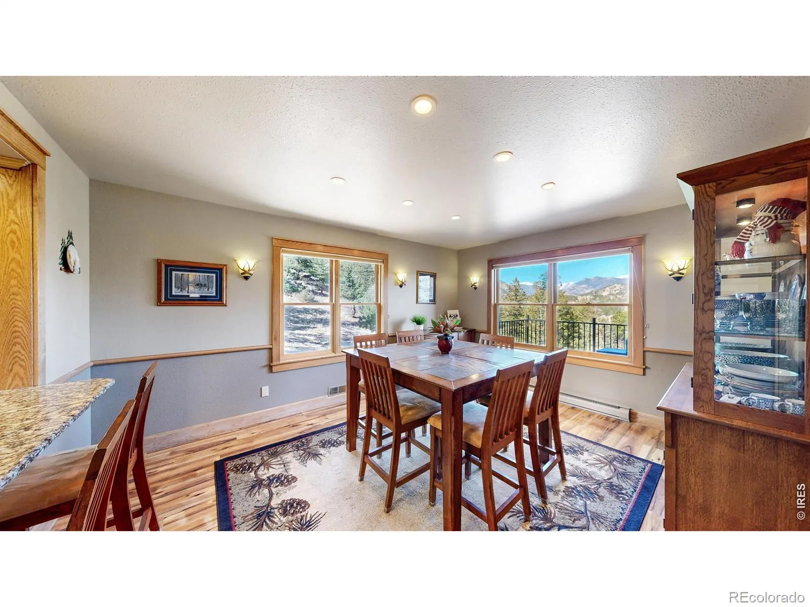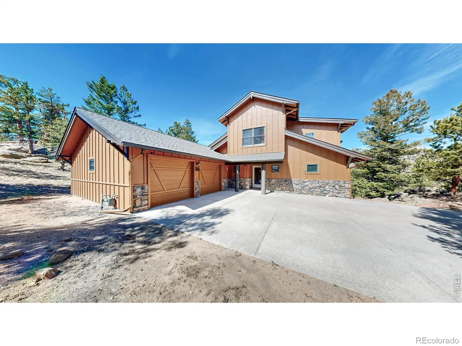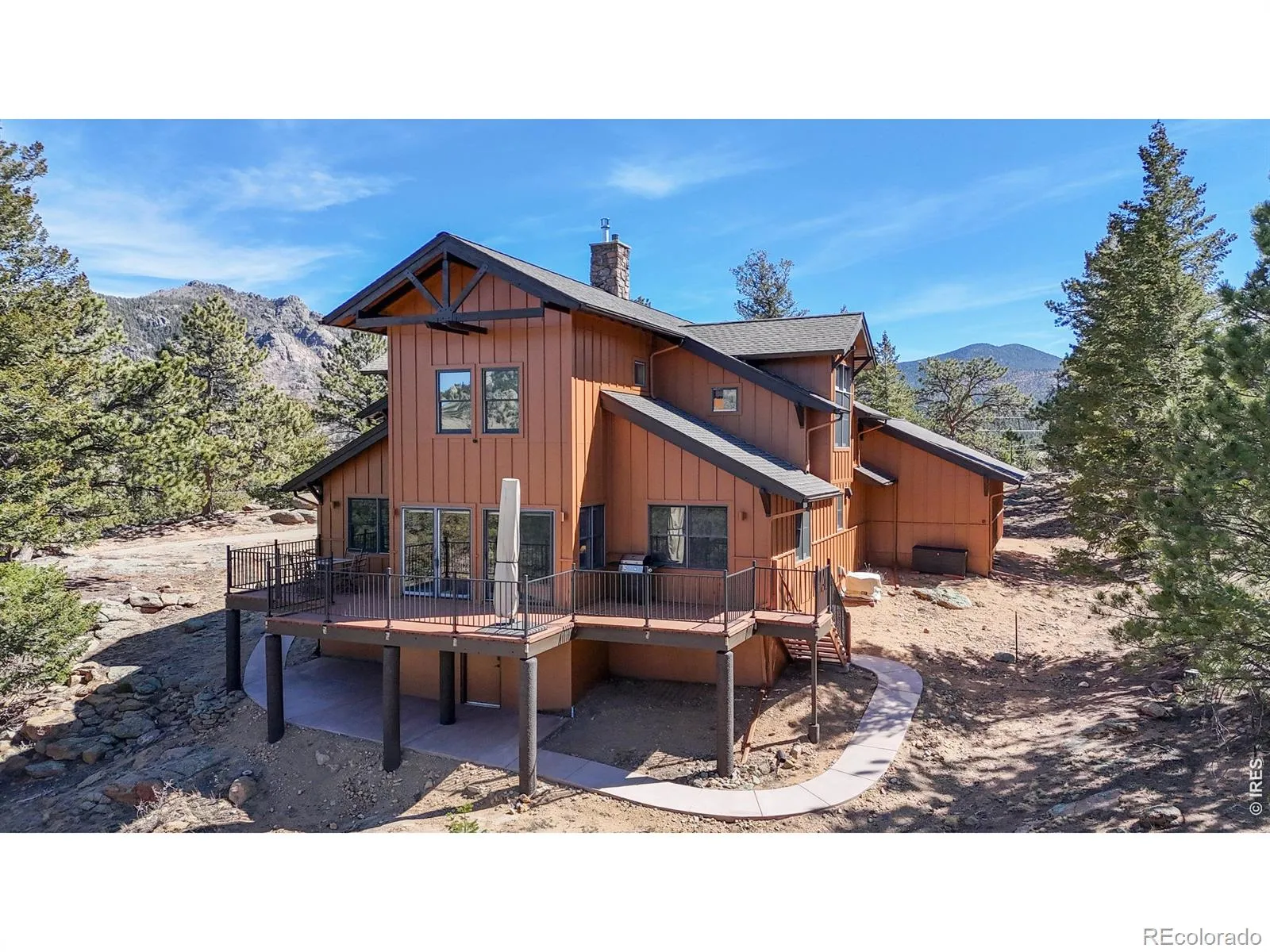 Tucked away on 2.78 private mountain-view acres surrounded by rock outcroppings and mature trees, this beautifully updated main-level living home (no steps from the front door and garage to the main floor) offers privacy, space, and modern comfort just minutes from downtown Estes Park and Rocky Mountain National Park. Enjoy stunning Mummy Range views and frequent wildlife sightings, all with year-round access via county-maintained roads. The open floor plan features 3 bedrooms, 2.5 bathrooms, and a spacious loft-style family room, highlighted by soaring cathedral ceilings and a striking fireplace in the main living area. A formal dining area and breakfast bar offer flexibility for entertaining and everyday living. The updated kitchen includes Knotty Hickory cabinetry with slide-out shelving, quartz countertops, upgraded sinks, and a high-end LG and Frigidaire appliance package with air fryer ovens. New flooring throughout blends carpet and Knotty Hickory engineered wood, complemented by fresh interior paint for a move-in ready feel. Comfort is enhanced by a new Heil natural gas furnace and A/C system, a smart 55-gallon Rheem water heater with hot water circulation, and a Mendota 35K BTU gas fireplace. Exterior upgrades include fresh paint, a 2022 Class 4 impact-resistant roof with potential insurance savings, and extensive fire mitigation for added safety and defensible space. The refinished deck with gas hookups is ideal for outdoor living. The oversized, flat two-car garage features MotoFloor tiles, built-in cabinetry, and an extra fridge/freezer, while a fully finished and heated crawlspace offers excellent storage or workshop space. Additional highlights include motorized living room blinds, improved sightlines from tree mitigation, and a private setting not visible from the street. Turn-key potential with negotiable 2023 furnishings completes this exceptional property.