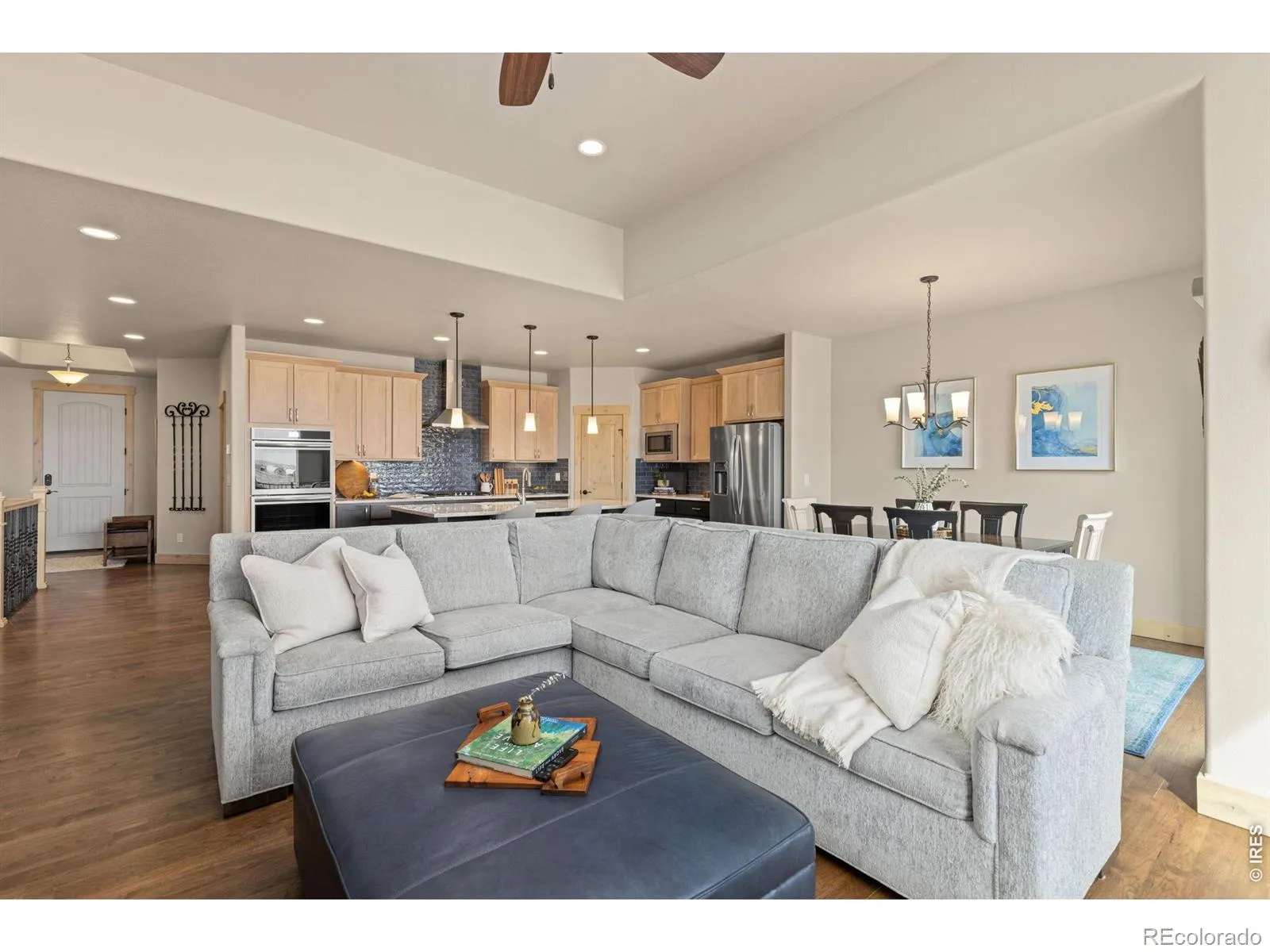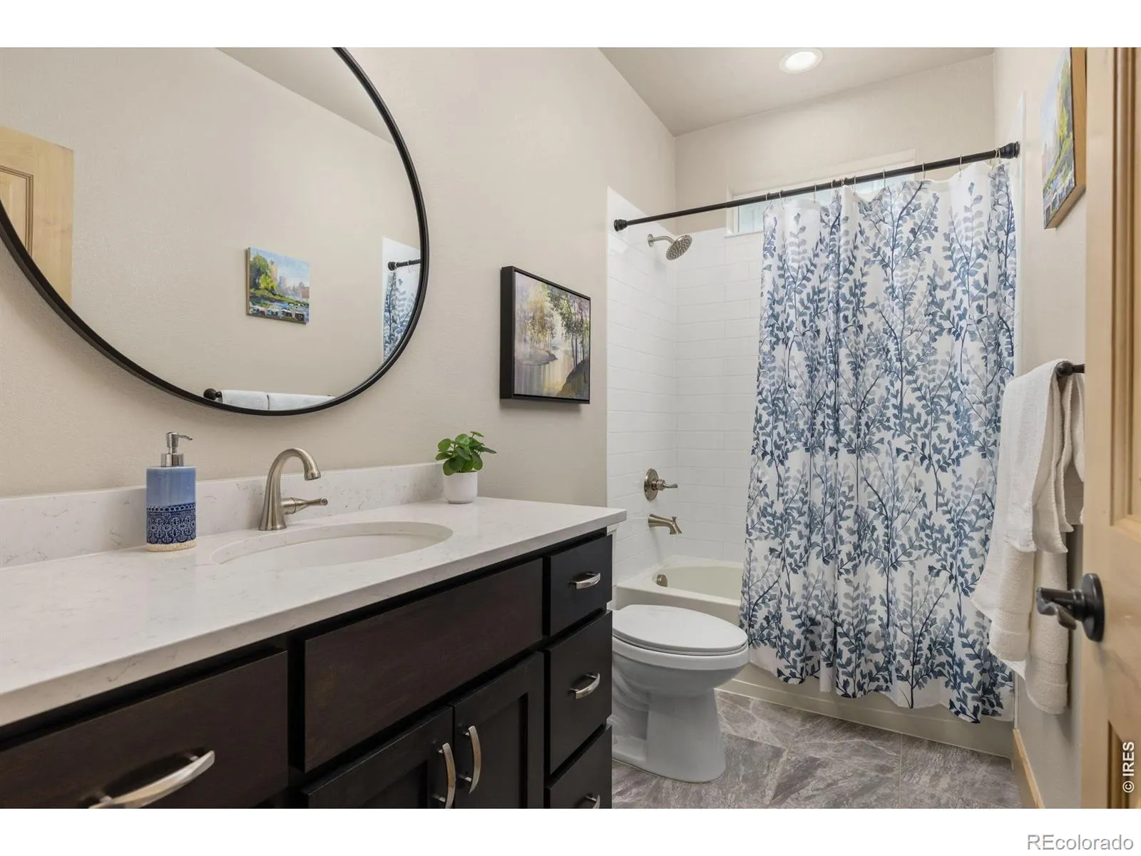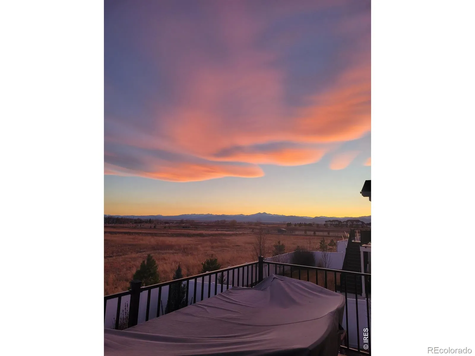 This beautifully built Bridgewater walkout ranch home in The Ridge at Harmony is move in ready! The lot faces south for unobstructed views of the mountains with a fully fenced and landscaped yard. Enjoy the beautiful sunsets while dining on the walkout patio off the dining/living area. Amazing upgrades have been done throughout the home like oak wood floors on the main floor. Tharp hickory cabinets in kitchen. Gourmet kitchen with quartz slab countertops and large island perfect for entertaining. Gas range/hood plus double ovens, refrigerator, dishwasher all in stainless steel making it a chef’s dream kitchen. And don’t forget the large walk-in pantry! Upstairs has a spacious master suite with a luxury 5 piece bathroom and walk-in closet. Located on first floor is another bedroom and/or office, and full bathroom. Hunter Douglas blinds with top down bottom up throughout the home. Laundry is on the first floor with an additional sink. There is also a sink in the garage for easy clean up! Downstairs is light and bright with 2 more bedrooms plus a large gathering space and bar area. Sliding glass doors for convenient access to the backyard. There is also a large storage area downstairs for all your extra stuff! Home has a humidifier, tankless water heater, and A/C.