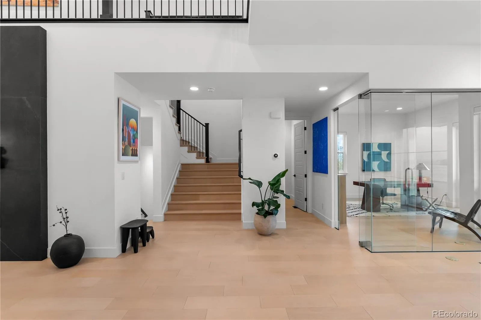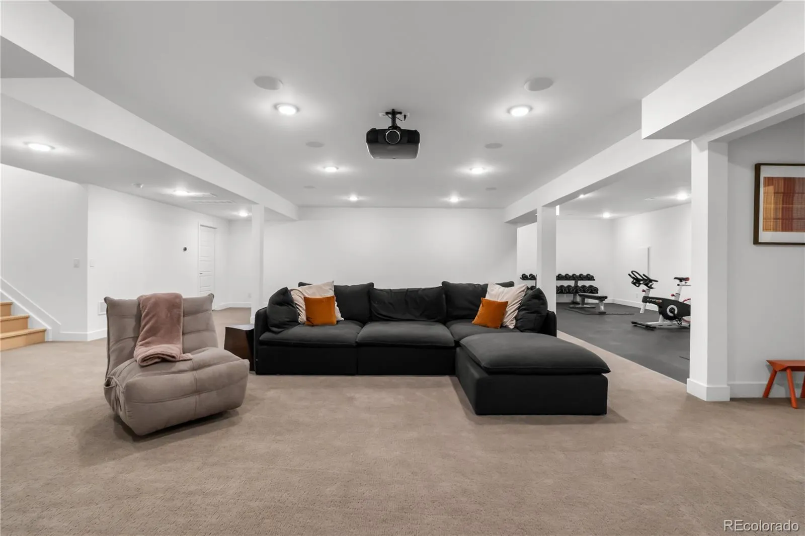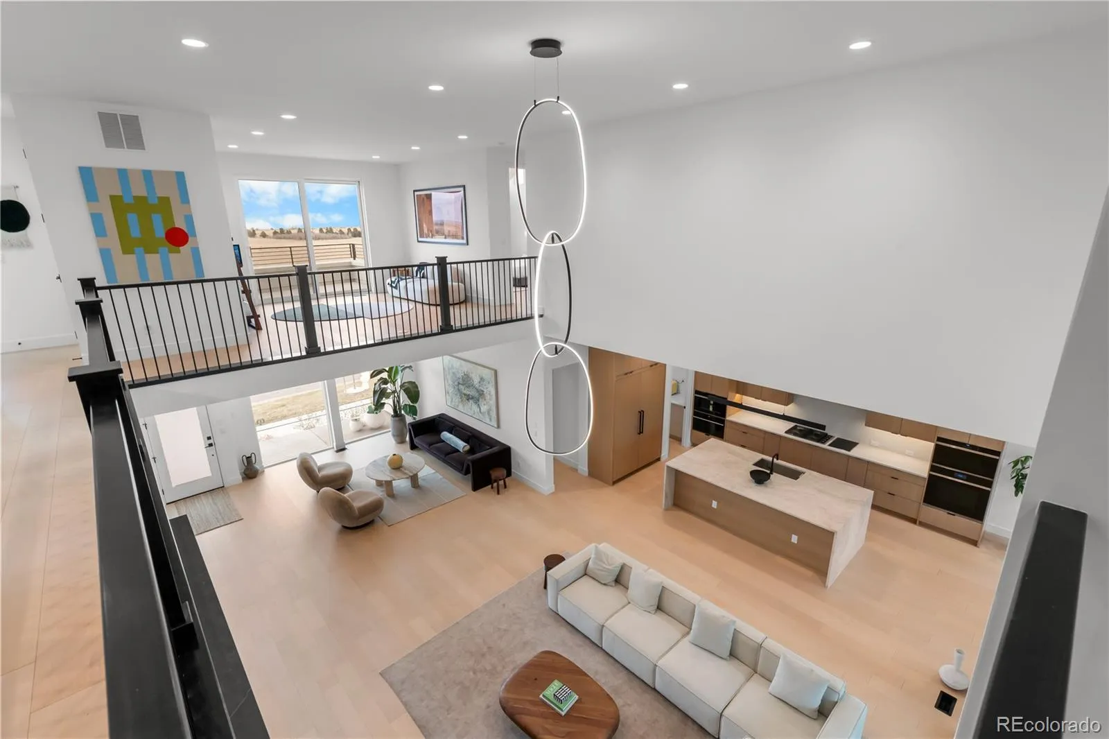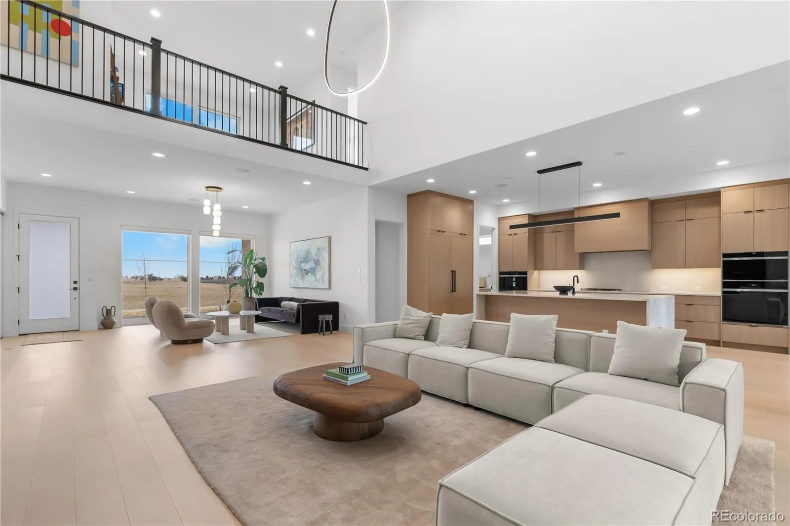 Upstairs, the primary suite is a private sanctuary, mountain views, a custom walk-in closet with center island, floor-to-ceiling built-ins, and a spa bath with an oversized glass shower and soaking tub. A sprawling open loft opens to a private balcony overlooking the Rocky Mountain Arsenal National Wildlife Refuge. Five additional ensuite bedrooms, a generous upstairs laundry room, and a finished basement with cinema, dedicated gym, included equipment, and a private bedroom suite make every level of this home as functional as it is beautiful.
