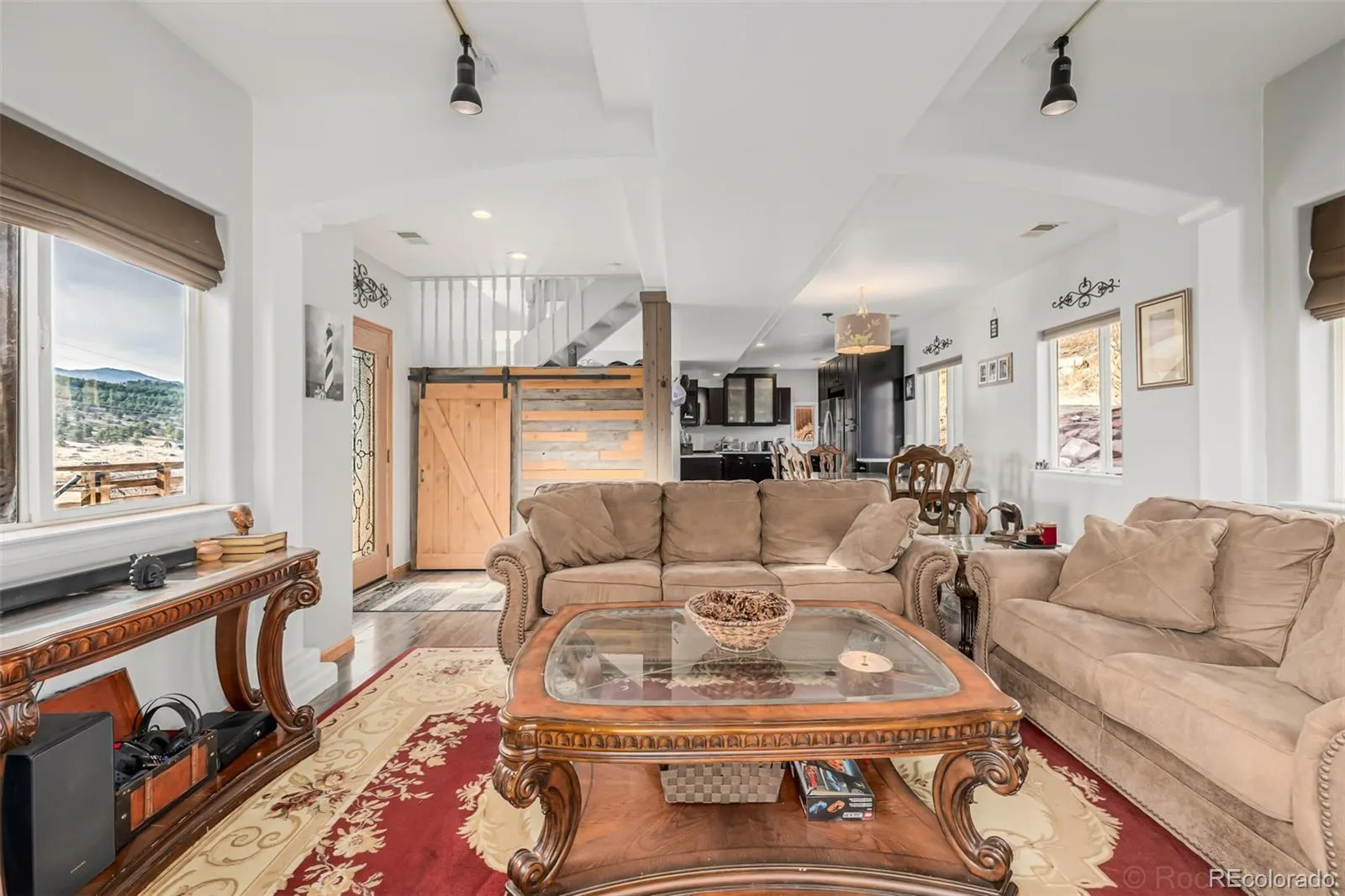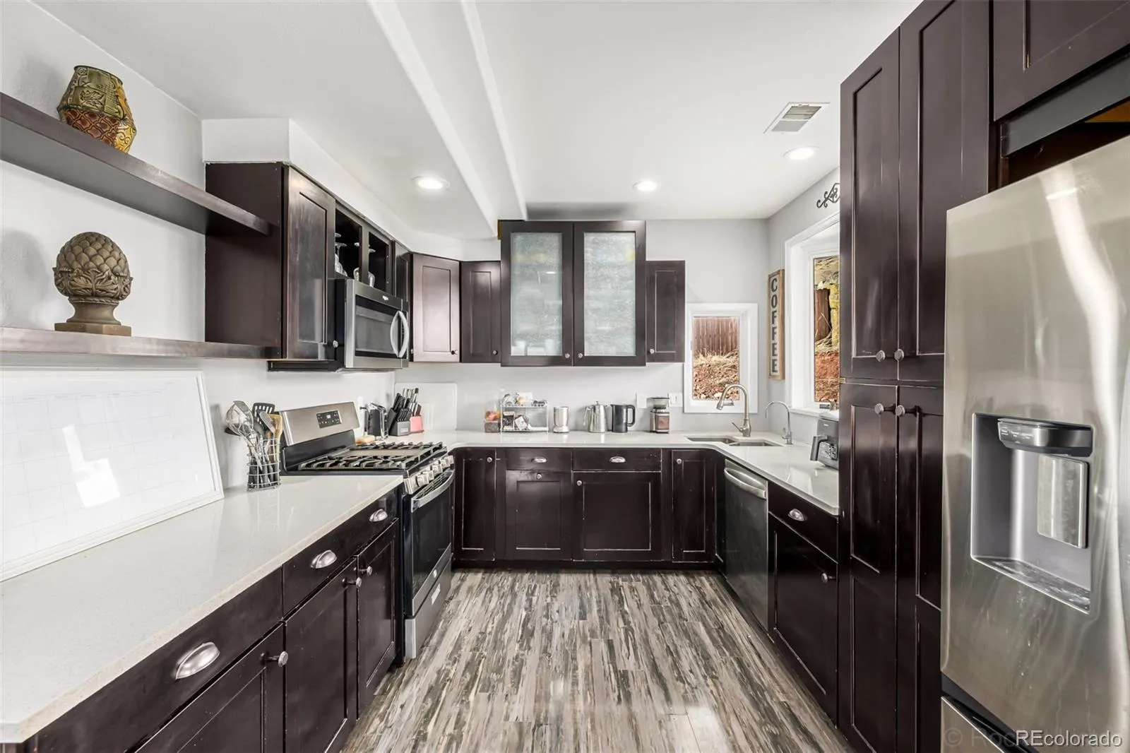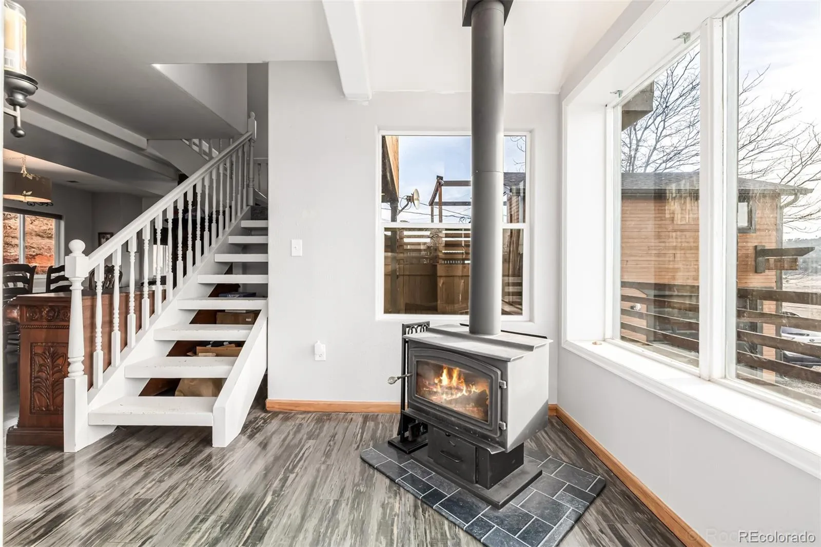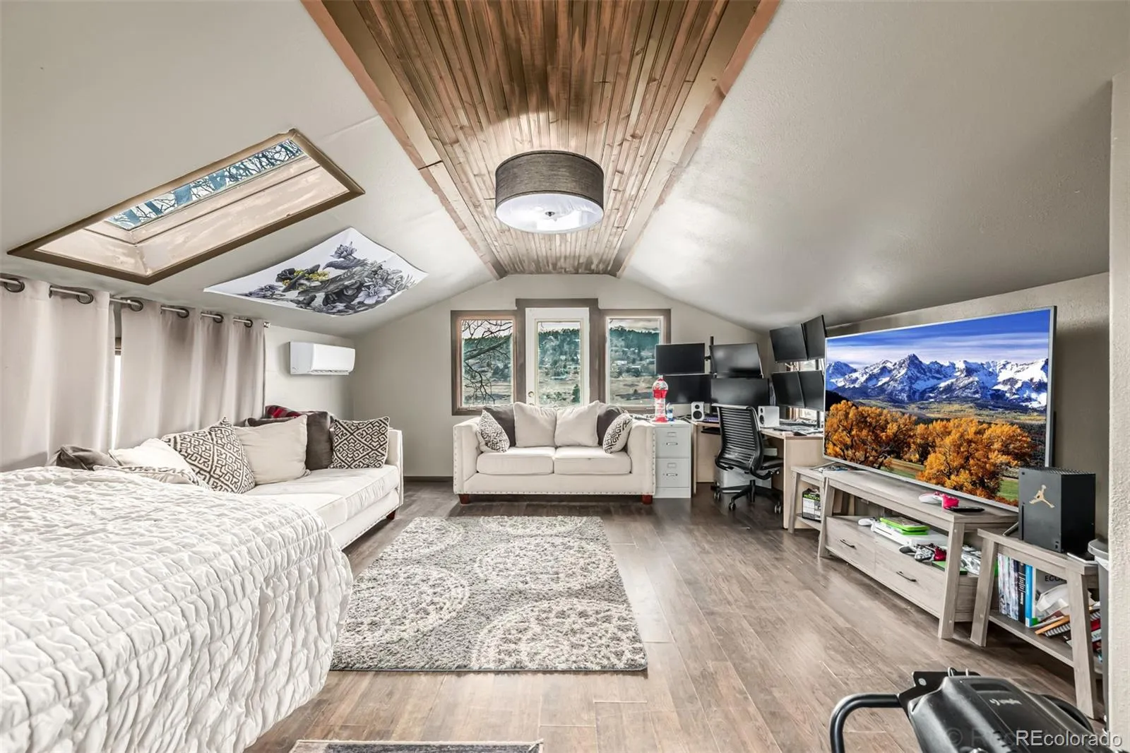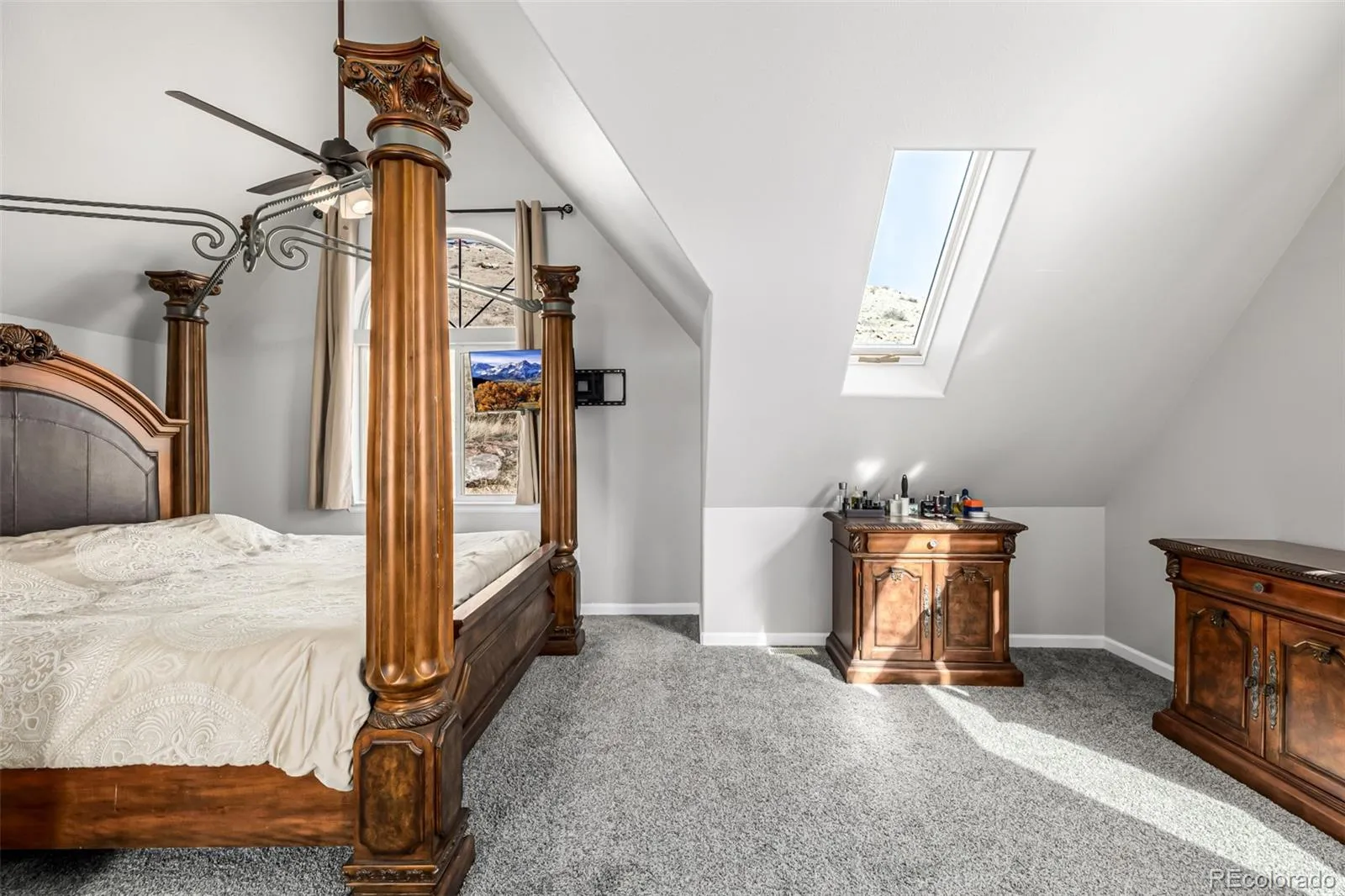 Discover this fantastic 3 bed, 3 bath residence now available in Carter Lake Valley, offering beautiful mountain views and a warm, inviting setting. The property features a charming front deck, a detached 1-car garage with a cozy loft, and a thoughtfully designed exterior. Inside, you will find spacious dining and living areas with elegant wood-look flooring, track and recessed lighting, a neutral palette, and a wood-burning stove that adds comfort and character during the winter months. The kitchen is well-appointed with espresso cabinetry, quartz countertops, and stainless steel appliances, ideal for everyday living and entertaining. Upstairs, the primary suite features plush carpet, vaulted ceilings with skylights, and a full bathroom with dual sinks. The backyard offers a private retreat with a hot tub, creating the perfect space to relax and unwind.