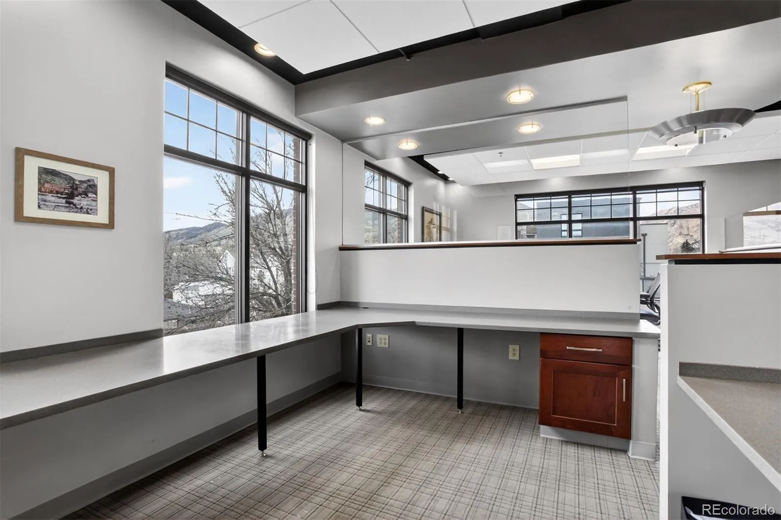 The space is filled with natural light from large windows showcasing mountain and downtown views, creating an inviting and productive work environment. High-quality finishes throughout, including modern cabinetry, updated lighting, and a clean, professional aesthetic, make this a turnkey opportunity.