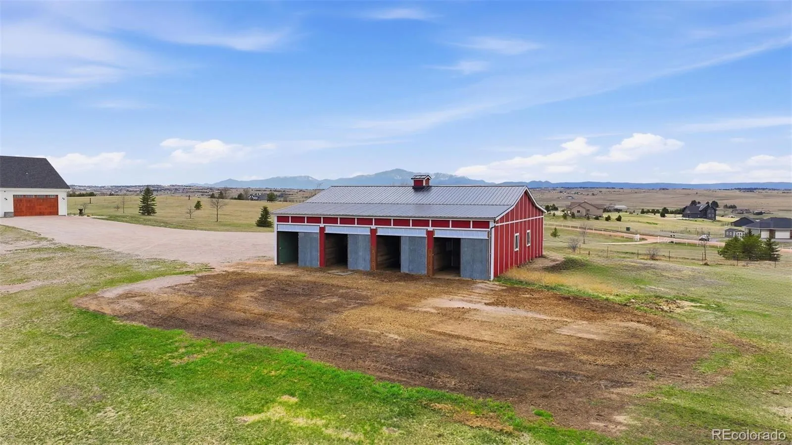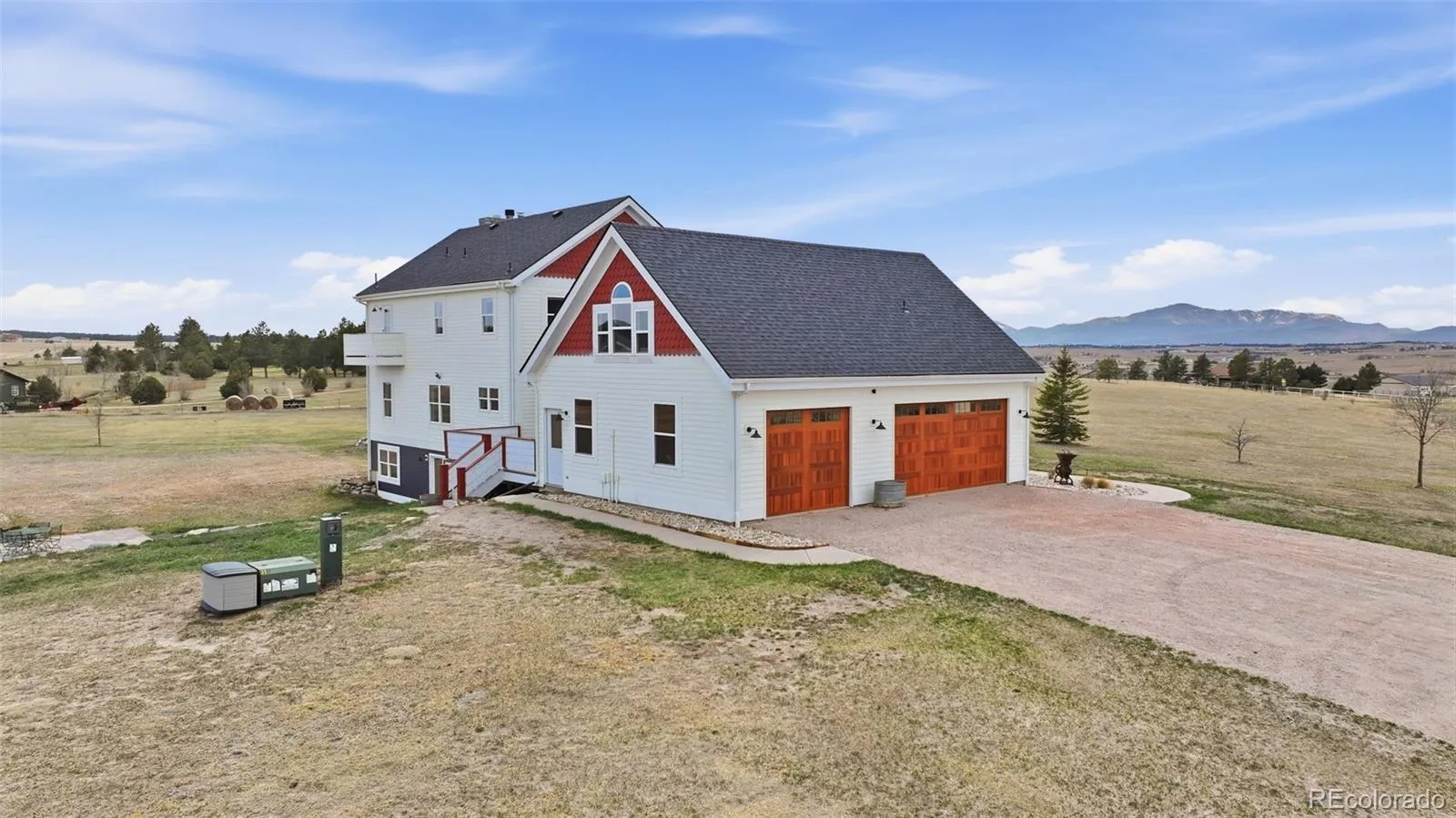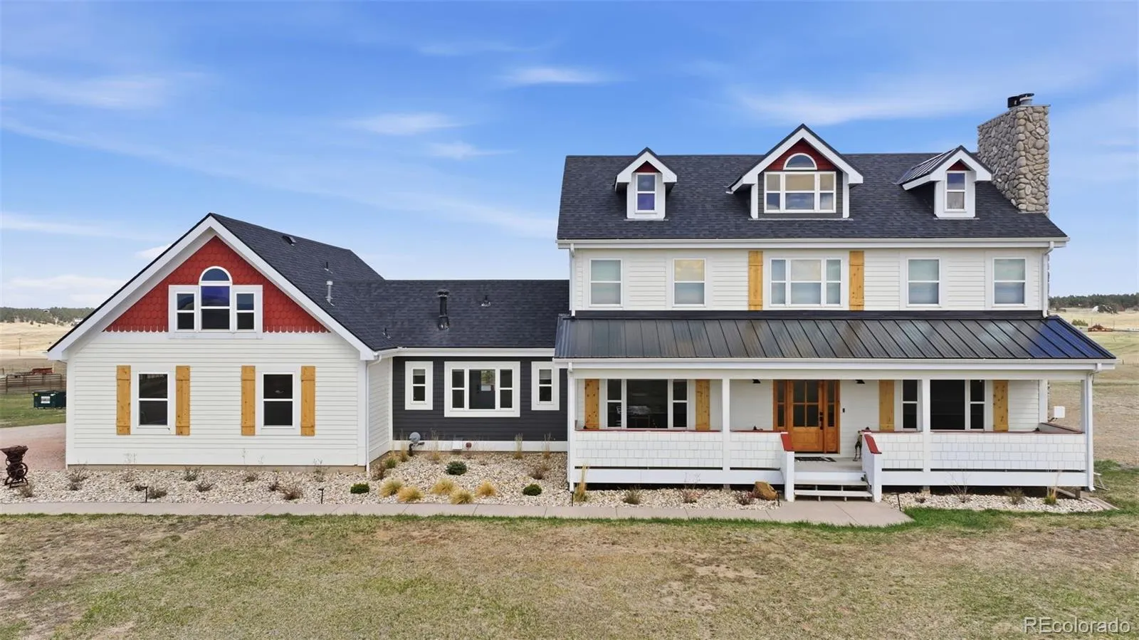 Your dream property awaits! Perched on one of the highest elevation points in Black Forest, this stunning farmhouse on 20 acres is framed by sweeping views of the front range and surrounding hills! Located in District 38, this property features a gorgeous 4100+ sq foot home plus a 30×50 barn for your animals or hobbies! Zoned for horses with no HOA, quick access to Highway 83 and I-25, this spacious and inviting home has been updated both inside and out to include paint, exterior touches and landscaping, brand new carpet, kitchen updates with butcher block island, appliances, and stone countertops. All bathrooms in the home have been updated. Enjoy spreading out- main level features a living area complete with a stone fireplace, breakfast nook, formal dining, and a room that is perfect for a home office. The oversized mudroom has plenty of space for smart storage, and laundry is thoughtfully connected. Spacious walk-in pantry is located in the perfect spot for easy grocery unloading. Upstairs, the primary suite features a fireplace, 5 piece bathroom complete with a clawfoot bathtub and even a private balcony! Two secondary bedrooms and a full bath complete the upstairs space. Downstairs in the basement, a large rec-room and full bathroom provide plenty of opportunity to relax, entertain, or use as additional homeschool or work from home setup. Walkout access to the backyard makes this an ideal space for enjoyment. The home also has a fabulous BONUS loft above the garage that is perfect for guests, or multi-generational living. The loft features a living space, wet bar with beverage fridge, 3/4 bathroom, and bedroom. Enjoy your incredible Pikes Peak views from the front porch, or find shade from the sun off of the back patio. New landscaping in both the front and back make this home enjoyable year-round. Steps from the house is a perfect space for animals or hobbies. The barn can be configured to house stalls, used as a workshop, or anything else you desire!
