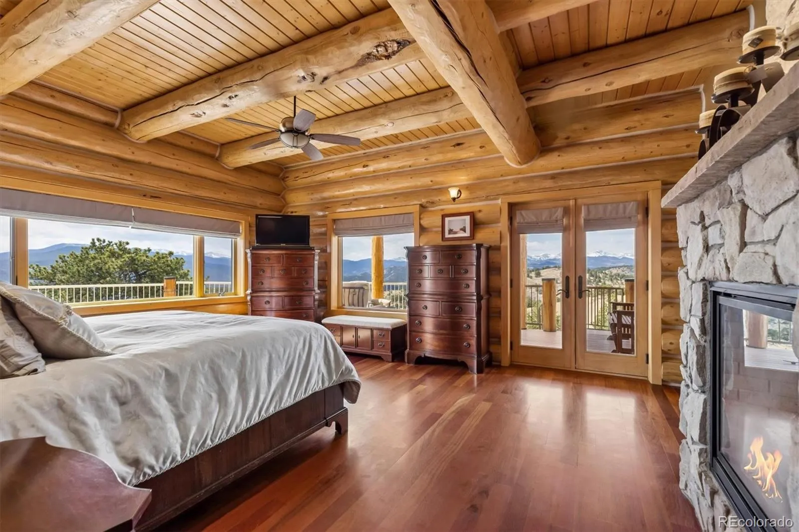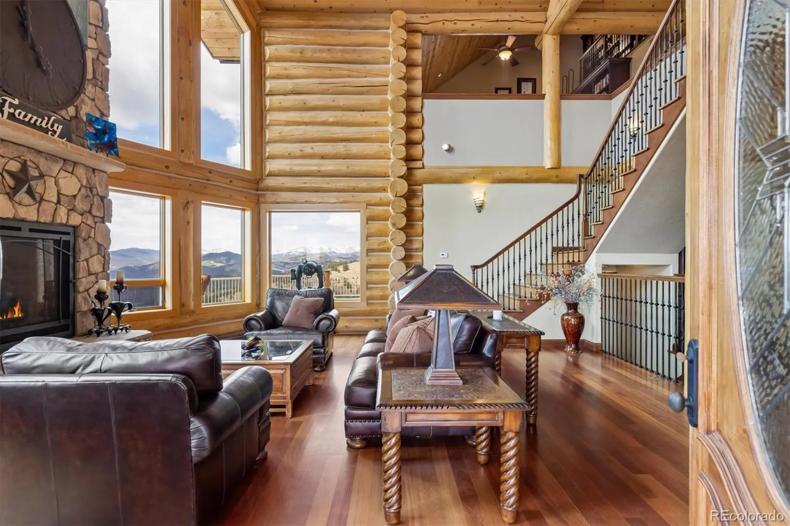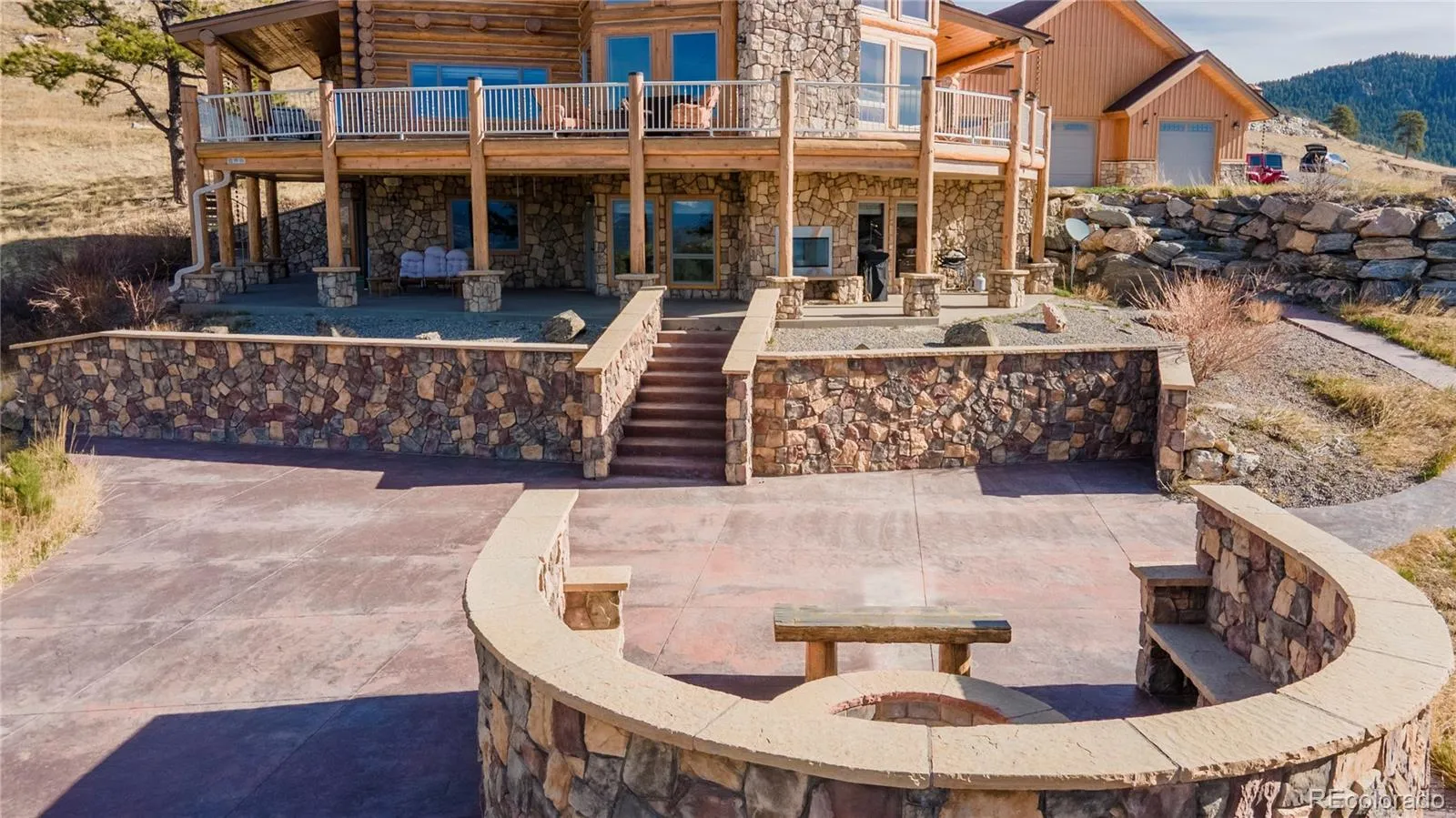 On 20 gentle acres in Golden Gate Canyon, this remarkable custom log home showcases expansive mountain views—from the Continental Divide to Pikes Peak, with Mt. Blue Sky anchoring the skyline and city lights shimmering to the east. The setting offers rare privacy and tranquility with easy access, just 30 minutes to Golden, and a short drive to Black Hawk and Central City. Inside, more than 5,400 square feet of thoughtfully designed living space blends mountain character with quality finishes. The great room impresses with soaring ceilings, exposed timbers, Brazilion cherry floors and a full wall of windows that capture the surrounding landscape and fill the home with natural light. The kitchen is built for everyday living and entertaining, featuring rich cherry cabinetry, generous granite counter space, a large island, polished slate flooring, and high-end stainless appliances—all opening to the main living area and its towering stone fireplace. A main-level primary suite offers comfort and convenience, complete with a spacious layout, gas fireplace, 5-piece bath with steam shower, a large walk-in closet, and direct access to outdoor living areas—perfect for quiet mornings with inspiring views. Four additional bedrooms provide ample space for guests and family, including two ensuite. A large loft adds flexibility for a home office, play space, or creative retreat. The lower-level family room features copper ceilings, a gas fireplace, and a gorgeous wet bar with an enclosed glass wine room. There’s also space for a pool table, pinball, and media viewing. Outdoor spaces maximize the setting, with a large wraparound deck, plus a lower patio with outdoor fireplace leading to an expansive patio with fire pit; ideal for evenings under the stars. Four-car garage and adjacent flex/exercise space. Whether a full-time residence, mountain escape, or private executive retreat, this property delivers accessibility, privacy, acreage, and unforgettable views in a true legacy home.