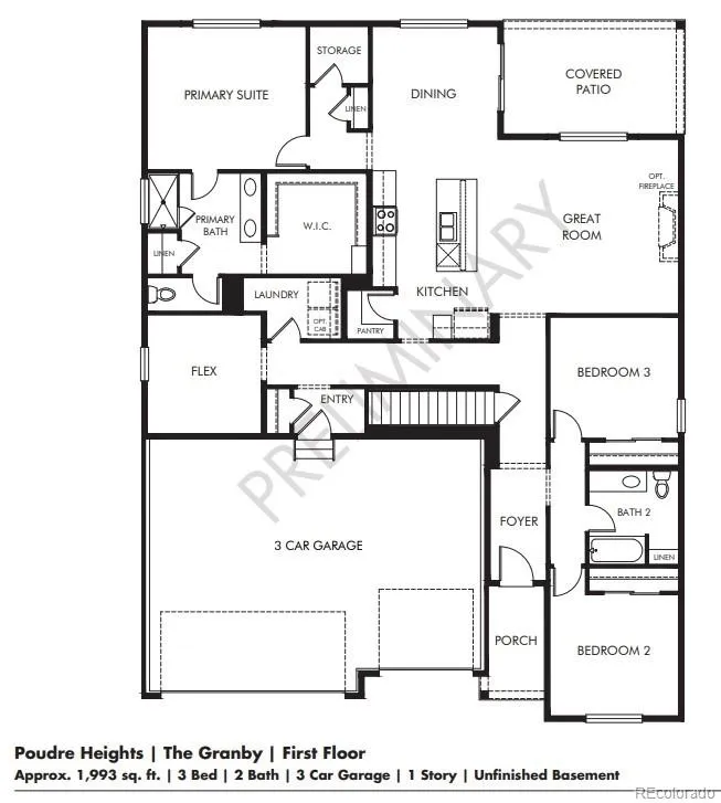 The Granby is a stylish ranch-style home featuring an open-concept kitchen and great room, plus a private flex space off the garage. With three bedrooms, two baths, and a three-bay garage across 1,993 sq. ft., this design offers comfort and versatility.