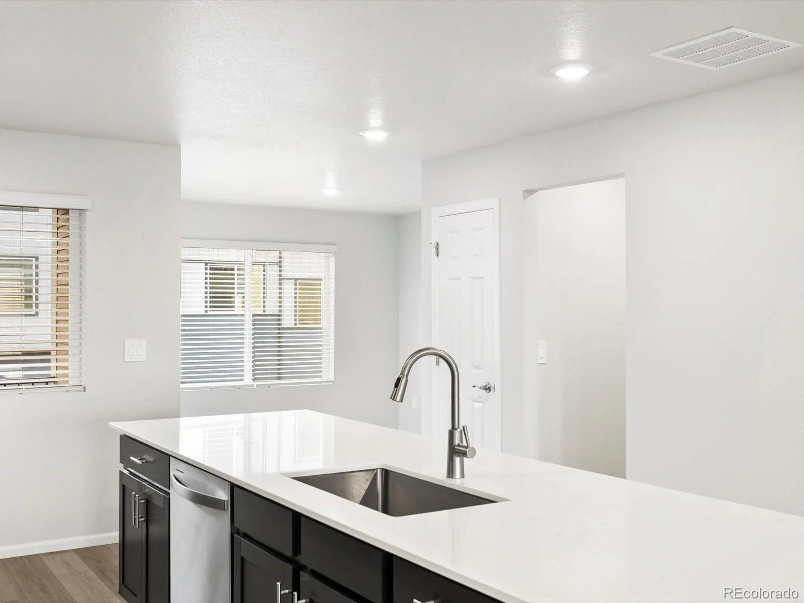 Open concept kitchen with quartz countertops and espresso cabinets!