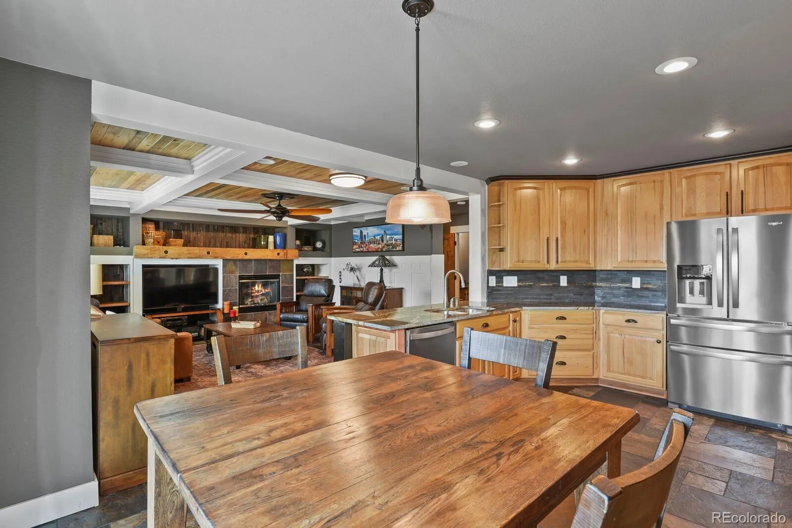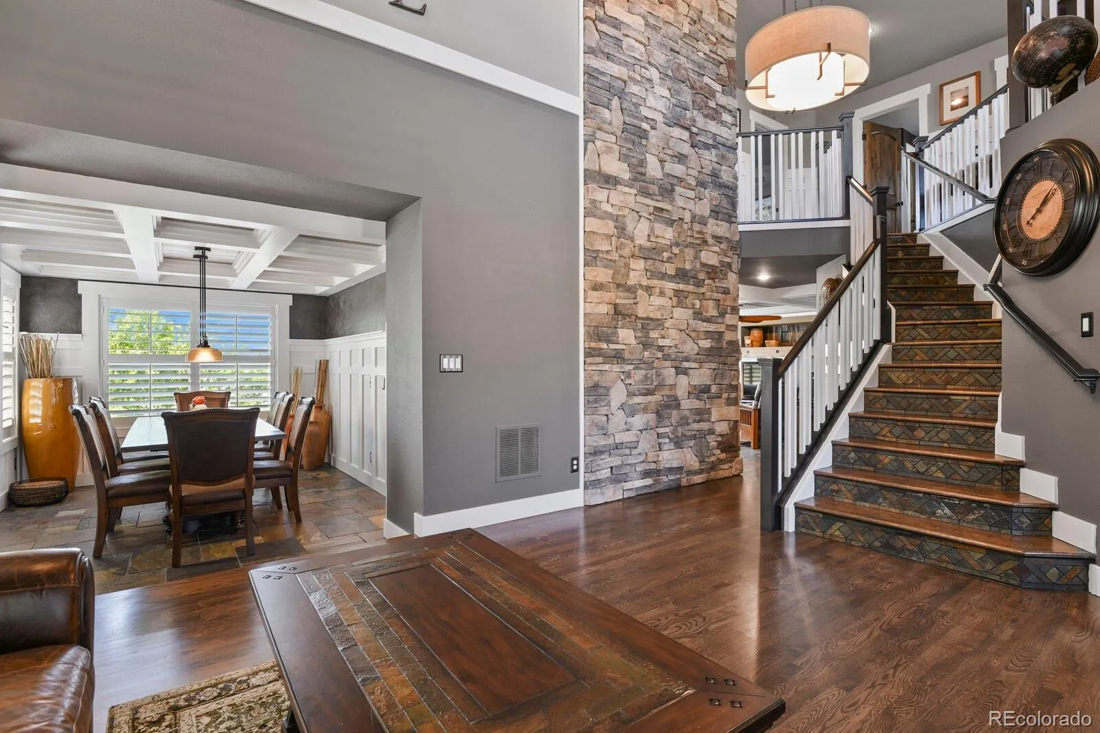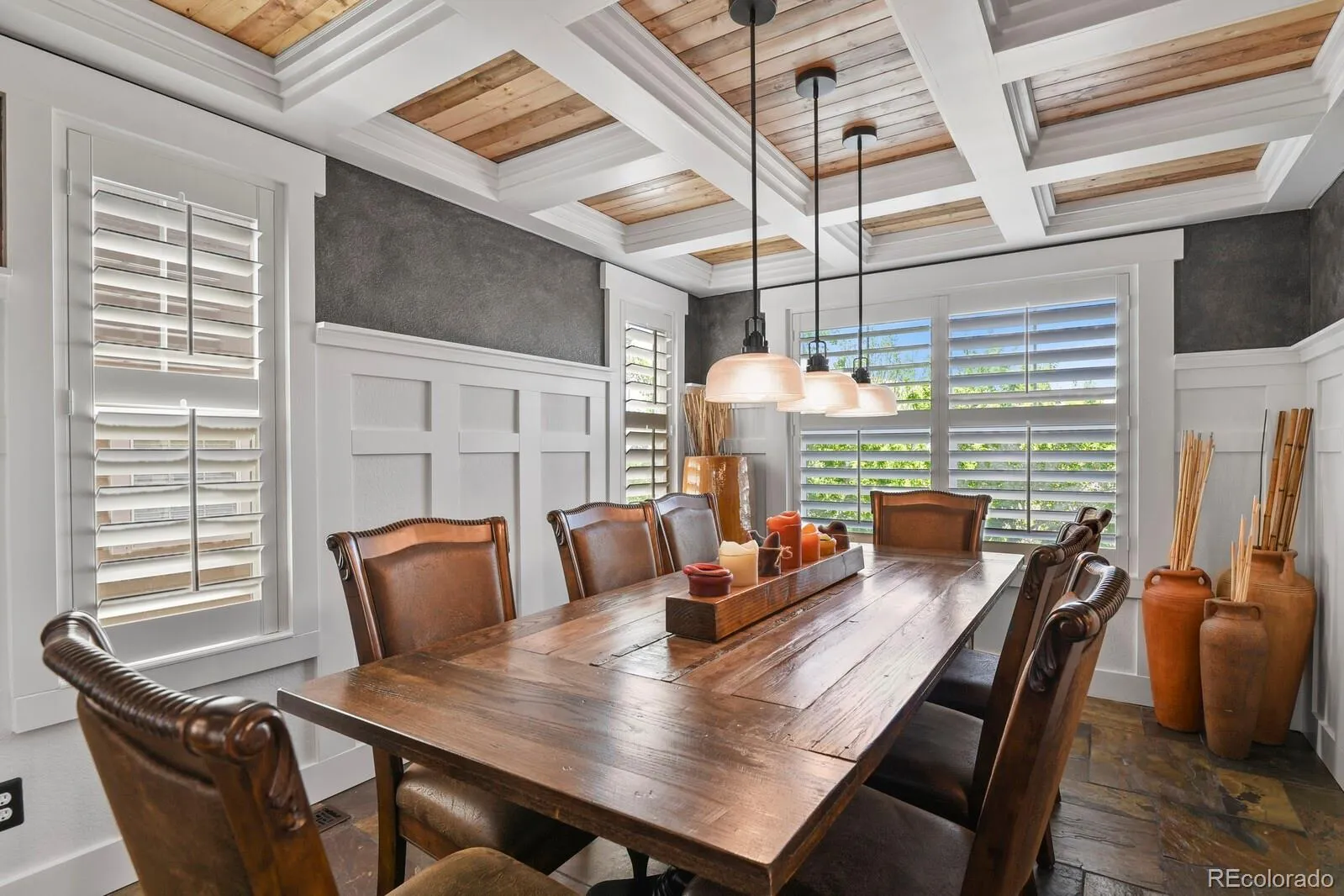 wainscoting, built ins, custom shelving, beamed & planked ceiling, coffered ceilings, white oak hardwood flooring, slate