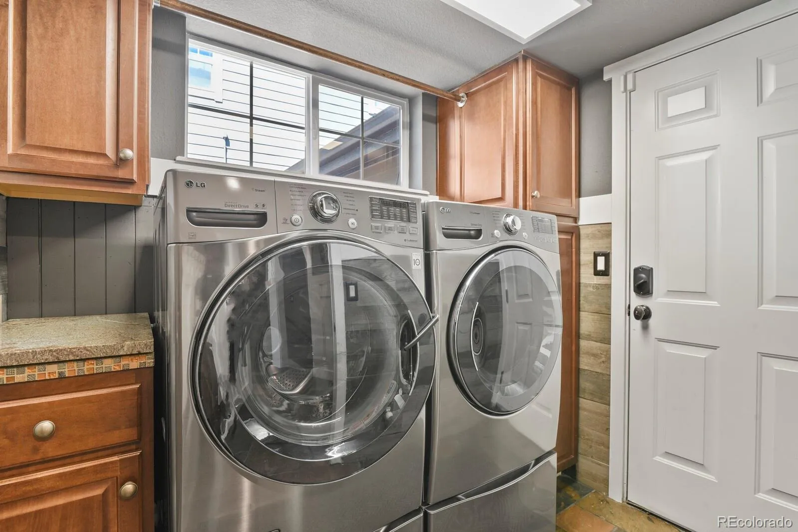 the wall and wood at ceiling. Washer/dryer is included. Upstairs you will find the bedrooms, loft space & 2 bathrooms.