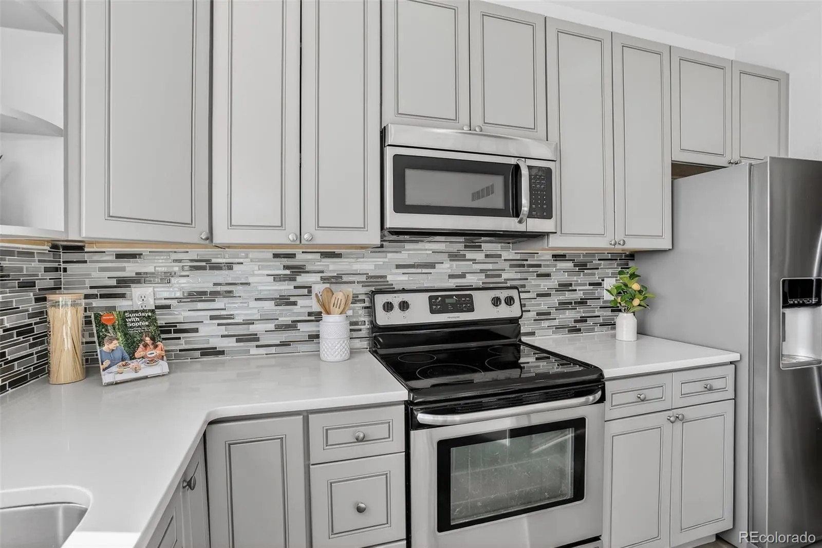 The open floor plan connects the kitchen and family room in a way that just works for everyday living and entertaining. The kitchen features sleek gray cabinetry, a large walk-in pantry, white quartz countertops, stainless steel appliances, and a glass tile backsplash that ties everything together with a fresh, updated look.