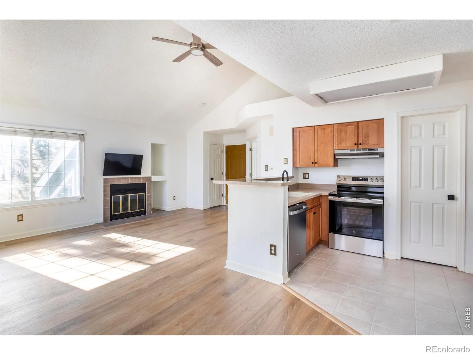 Fresh, modern updates make this top-floor condo truly stand out. Brand new paint, carpet, and stainless steel appliances give the home a crisp, sophisticated feel. Vaulted ceilings and expansive windows fill the space with natural light, while treetop views create a peaceful, tucked-away retreat. The open-concept layout seamlessly connects the kitchen, dining, and living areas – ideal for working from home, cozy evenings by the fireplace, or gathering with friends around the breakfast bar. Everyday living is easy with thoughtful features including a full-size washer and dryer, attic and balcony storage, central A/C, and permit parking. Located just blocks from Belmar’s shops, restaurants, and parks, this home offers the perfect balance of serenity and convenience. Start your morning with coffee on the private balcony, enjoy a stroll along Weir Gulch or a loop around Belmar Park. Later, head to Lady Nomada for a bite or pick up essentials at Whole Foods and Target – all before returning home to your quiet, light-filled escape. Outdoor enthusiasts will appreciate how this Lakewood location puts adventure within easy reach, whether strolling around Bear Creek Lake Park, hiking in the nearby foothills, SUPing on Evergreen Lake, or heading to the slopes for a day of skiing. A great fit for anyone seeking a low-maintenance lifestyle and a balance of convenience, style, and comfort.