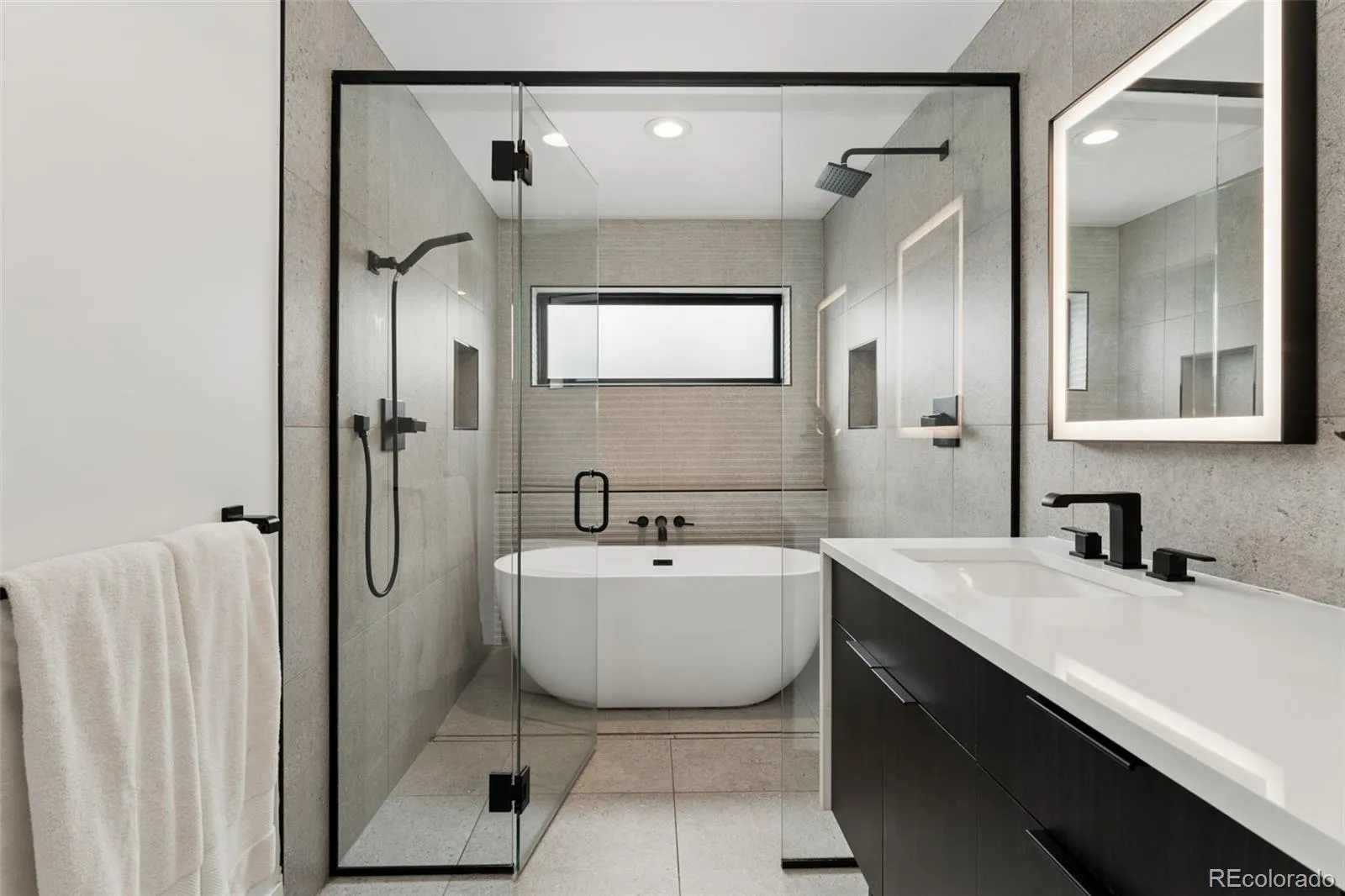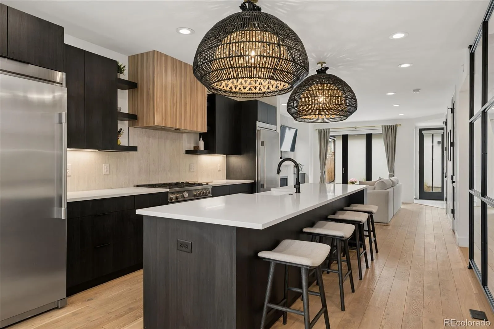 Built in 2021, this coveted south-facing duplex exudes a classic yet contemporary style, pairing a lovely brick exterior with striking black metal windows. Cross the threshold to find a home defined by fine finishes: wide-plank white oak flooring, designer lighting, and a dramatic wood floating stairway with a steel and glass partition wall. The open-concept main floor is perfectly designed for entertaining. A spacious dining room leads into the chef’s kitchen, featuring custom cabinetry, high-end stainless appliances, and a generous quartz island. The gracious family room is anchored by a gas fireplace and flows effortlessly toward the mudroom. Throughout the home, thoughtful design is on full display with excellent closet space and integrated storage solutions to keep the modern aesthetic clutter-free. Travel up the signature staircase to the romantic primary suite, a true sanctuary with a private balcony and a spa-like five-piece bath featuring a massive shower with a standing tub inside. This level also offers a second bedroom suite and a convenient laundry room. The third floor is an entertainer’s dream, featuring a second family room with a wet bar, beverage fridge and a large deck—the perfect spot for a glass of wine while enjoying the sunset. The lower level completes the home with a fourth bedroom, a full bath, and a cool glass-walled office/flex space. The private backyard leads to an oversized detached 2-car garage, finished with drywall and shelving for ample storage. The location is simply unbeatable: you are just two blocks from neighborhood favorites like Blue Pan Pizza, Bamboo Sushi, and Sienna Wine Bar. Nature is at your doorstep with City Park (1/2 mile), Congress Park (3/4 mile), and Cheesman Park (1 mile) all within reach, and the premier shopping of Cherry Creek is just a 5-minute drive away. This is urban living at its finest!