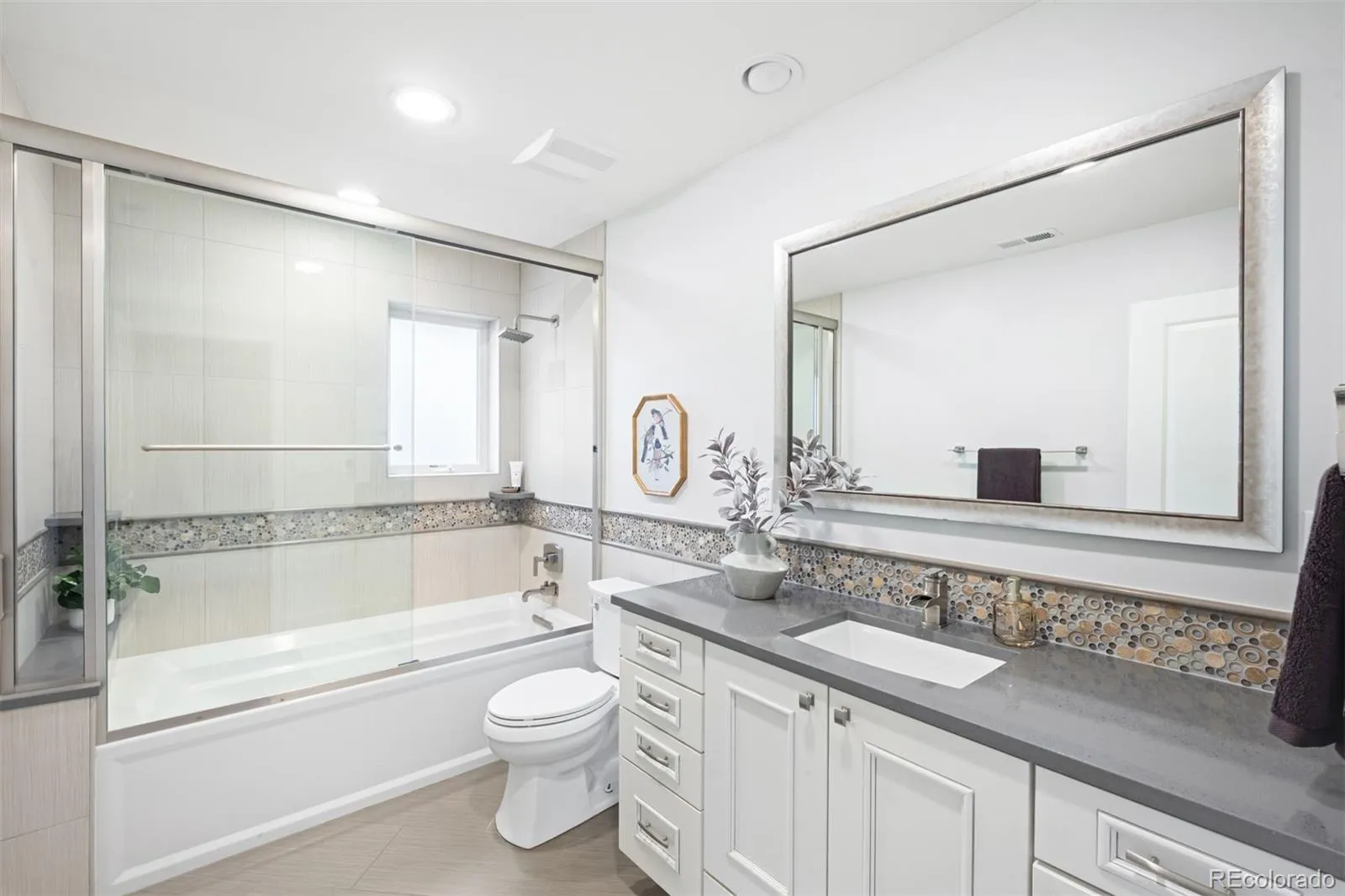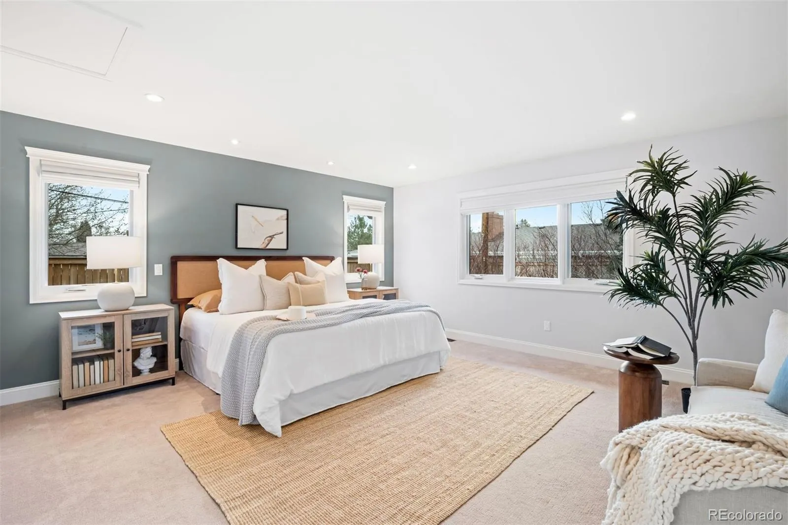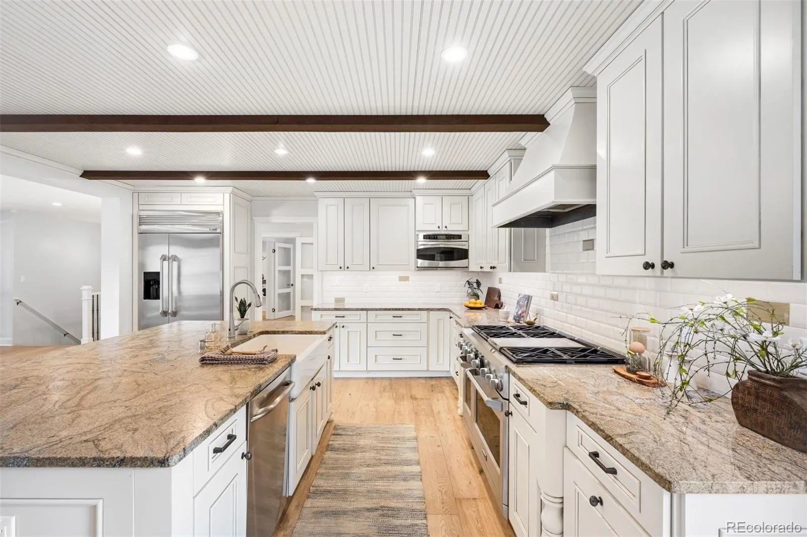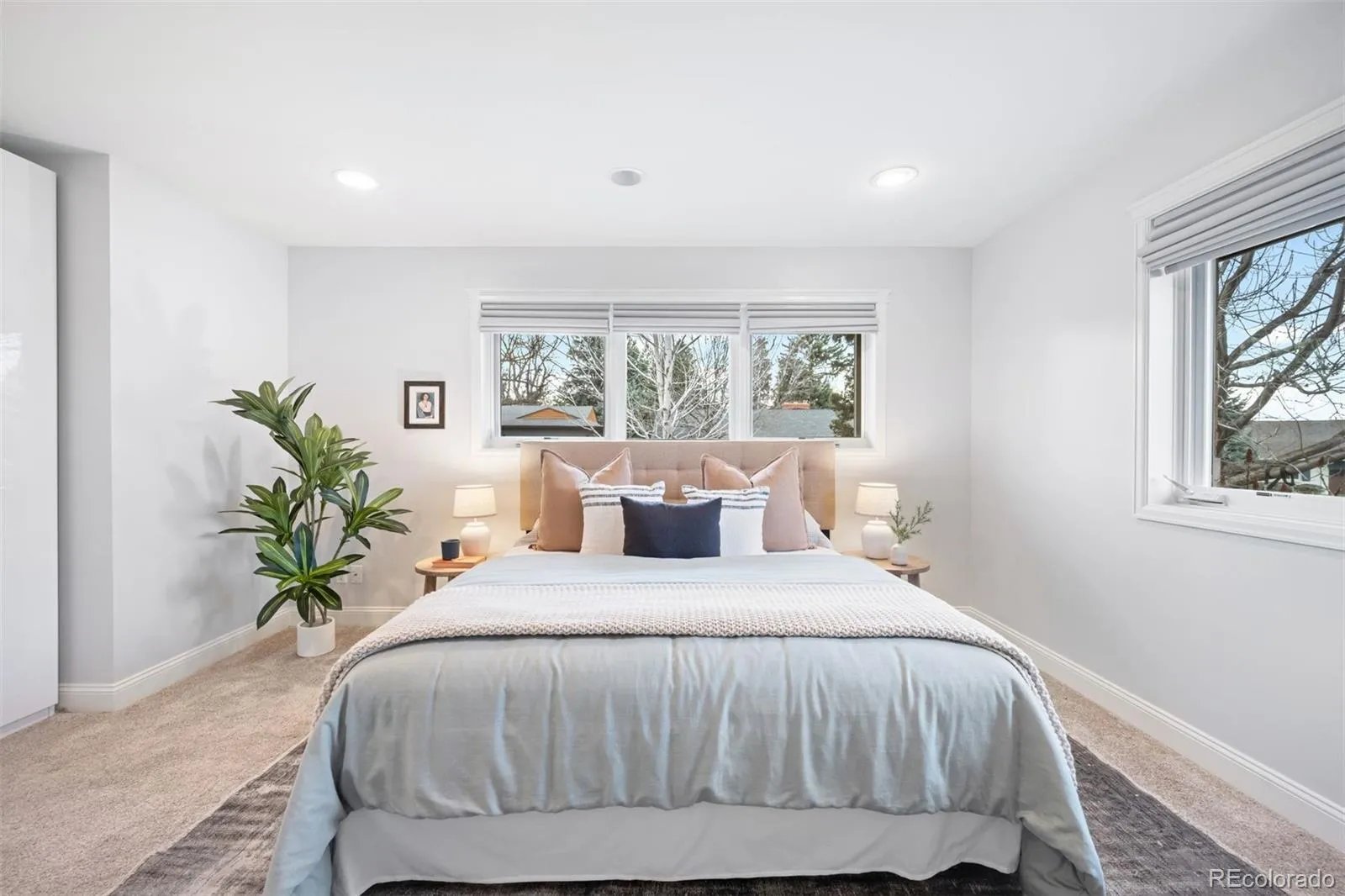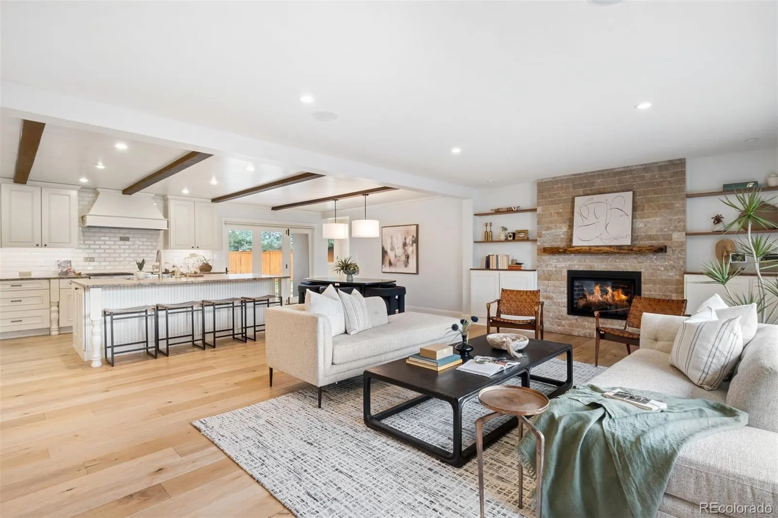 Spanning 4,047 total sqft and a short 4-minute walk to Slavens, this ranch-style home on an extensive lot offers five bedrooms and a dedicated office, capturing the essence of Wellshire living: quiet streets, generous space, and lasting character. Ascend the layered front path to an inviting front patio. Upon entering the main living area, a full wall of west-facing windows brings in natural light, capturing evening sunsets. A statement stone fireplace & custom built-ins anchor the room. The kitchen & dining areas carry the same character forward. Exposed wood beams & intricate detail add texture, while leathered granite countertops, a farmhouse sink, custom hood, and oversized island create a kitchen balancing form & function. The adjacent walk-in pantry & coffee bar are thoughtfully incorporated, adding additional prep space. A dedicated dining area sits alongside the centerpiece island, positioned to connect directly to the backyard. The large rectangular lawn is ideal for outdoor play & recreation. Whether it’s a game of soccer or a friendly badminton match, there’s space for it all! A pergola-covered patio offers shade, while an elevated deck creates additional gathering space, complete with a hot tub. The main level is anchored by a true primary suite with deck access, a five-piece bath featuring dual vanities, a walk-in shower, a soaking tub, and an oversized walk-in closet. Two additional bedrooms & a full bath sit on this level, along with a private office behind dramatic French doors. The finished basement provides expansive additional living space with flexibility for media or hosting, and is pre-plumbed for a future wet bar. Two additional bedrooms with egress windows and a ¾ bathroom offer comfortable guest accommodations. Moments to Wellshire Golf Course, this is a rare offering in one of Denver’s most sought-after neighborhoods.