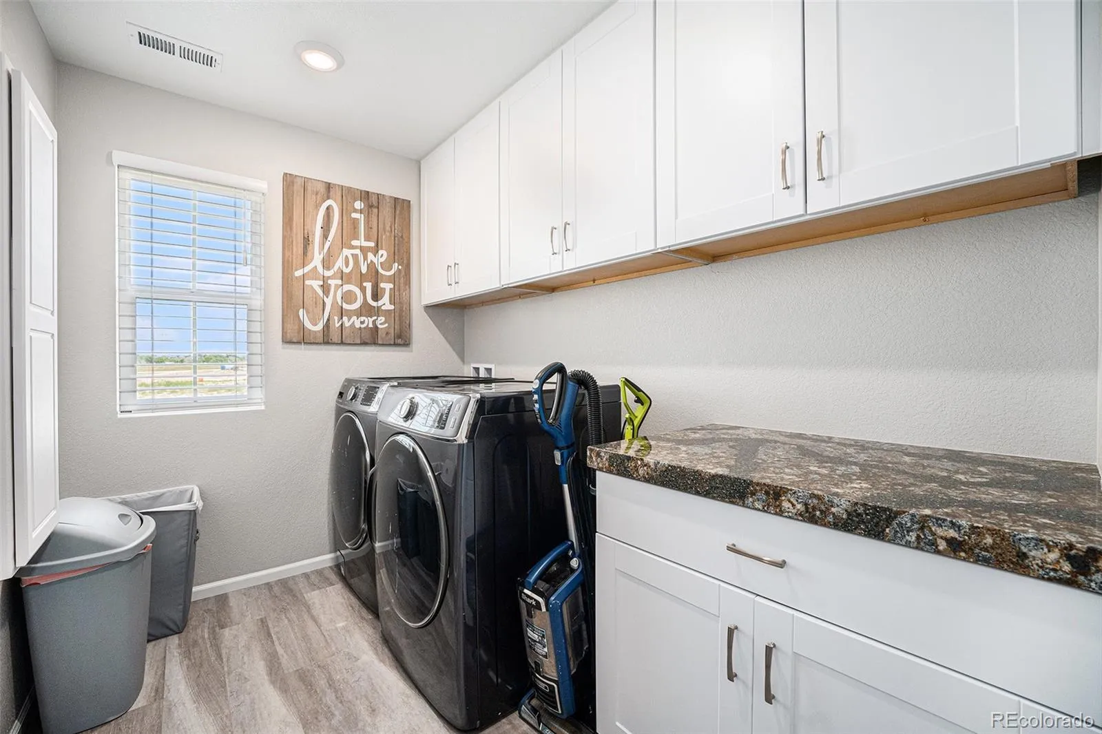 laundry room with added cabinetry and quartz counters. The master retreat feels like you are living on a spa vacation with
