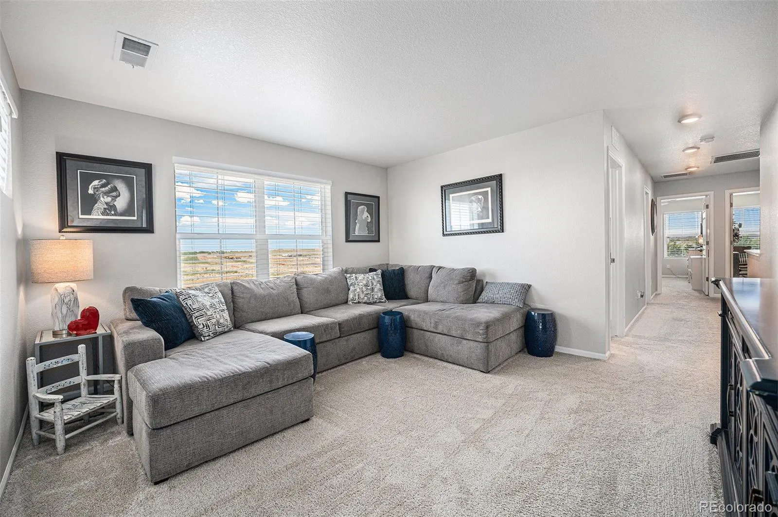 the spacious living area with an open floor plan that connects the large living room to the gourmet kitchen with a granite