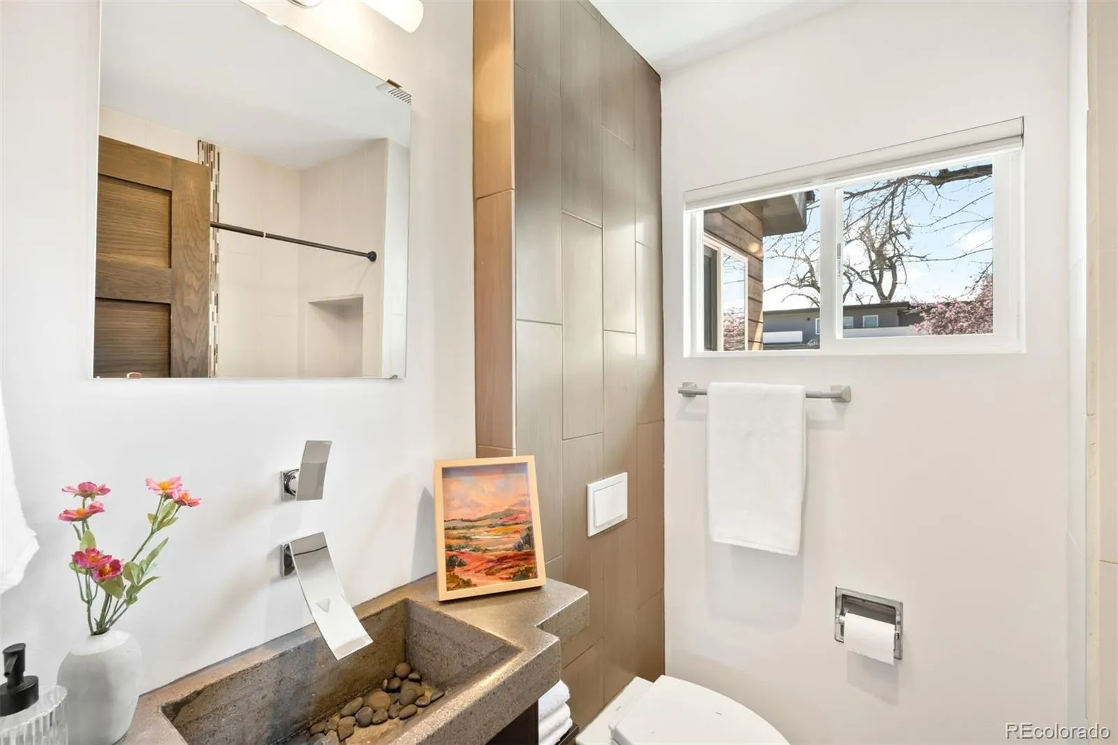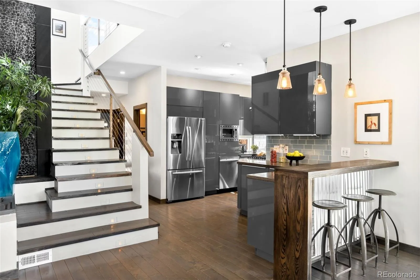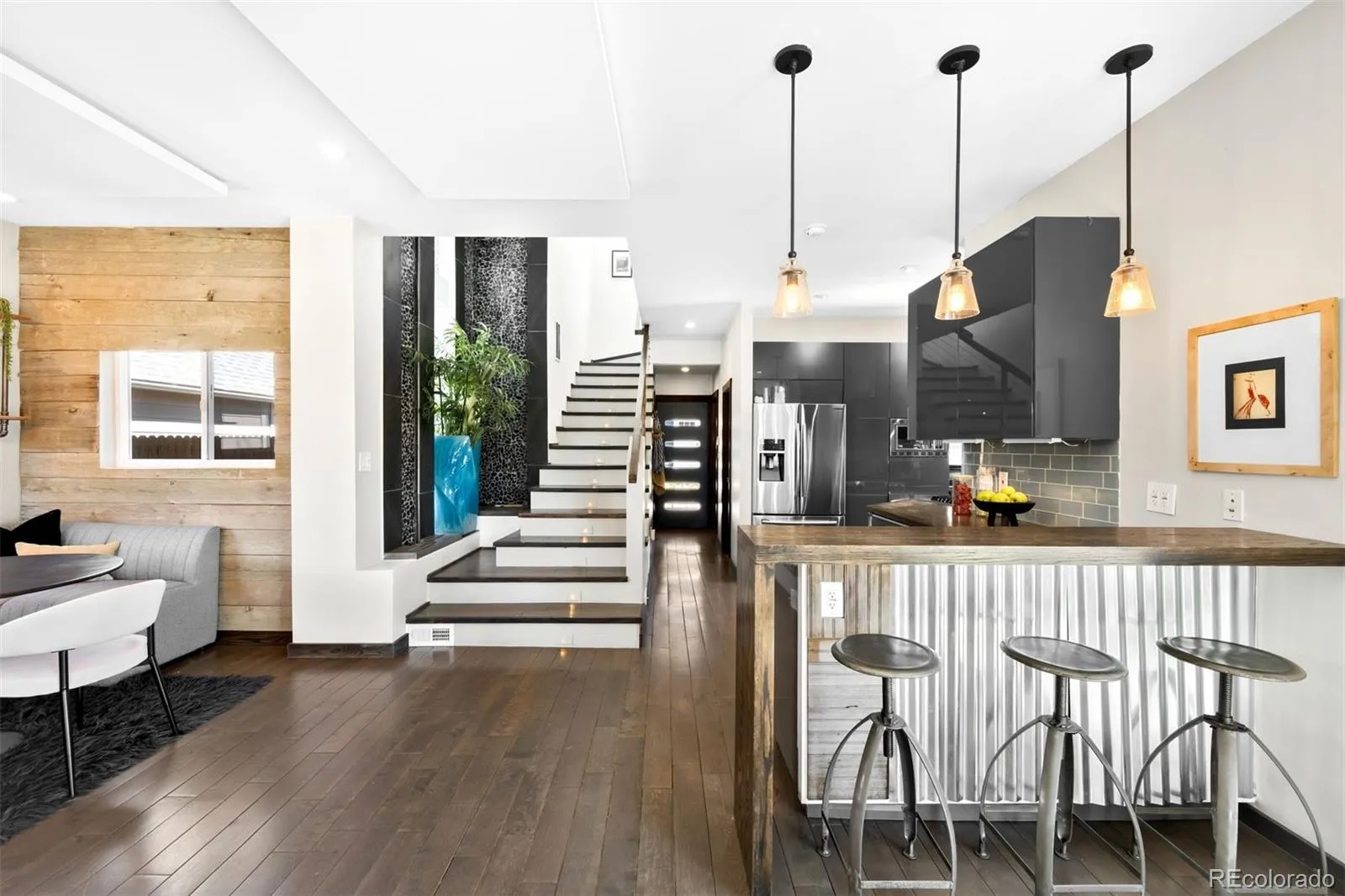 A modern zen-inspired home where smooth concrete finishes and a two-story wall of cascading water create a sense of flow upon entry. A front deck welcomes, wrapping the side of the home. Hardwood floors lead into the main living space, where a gas fireplace-framed in stainless steel -anchors the room. Surrounded by expansive windows, the space feels grounded in natural light. Beyond the main living area, sliding glass doors open to the wraparound deck, reinforcing indoor-outdoor connection. The main living space opens into a dining area with sculptural lighting. An eat-in wet bar elevates the space with open shelving and windows flooding the nook with natural light. The kitchen continues the same design language with a wood eat-in counter, sleek glossy cabinetry, concrete countertops, bold blue tile backsplash, + stainless steel appliances. At the center of the home, a striking interior water feature runs alongside the staircase, framed by a full-height window wall that draws in light. A powder bath and laundry complete the main level. Outdoors is a layered experience, featuring a covered patio extending to multiple elevated decks, a fully fenced backyard + raised garden beds. A paved walkway leads to a secondary entertaining space and detached two-car garage. Upstairs, two secondary bedrooms share a well-appointed full bath, while the primary suite offers a more expansive retreat. The walk-in closet is customized with built-in storage, while the en-suite bath features dual vanities, a full-body integrated mirror, and a spacious walk-in shower with waterfall-style fixtures. A detached residence defined by natural materials + flow, ideally positioned on a corner lot near the highly sought-after South Broadway corridor. Blocks from Harvard Gulch Park/ Golf Course, moments to neighborhood favorite Osteria Alberico, and 3 minutes to the Gothic Theatre, this location offers effortless access to parks, dining, and entertainment.