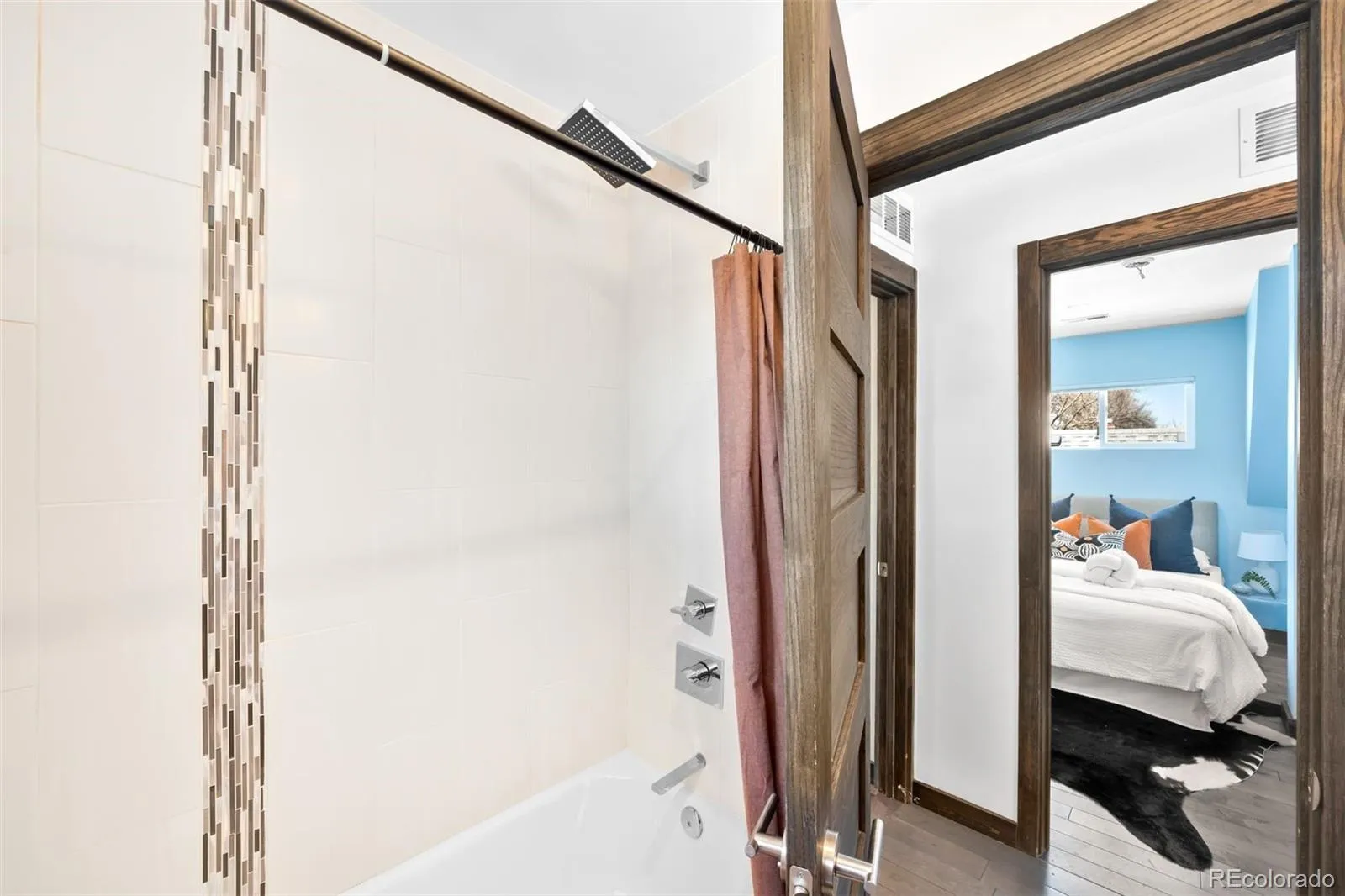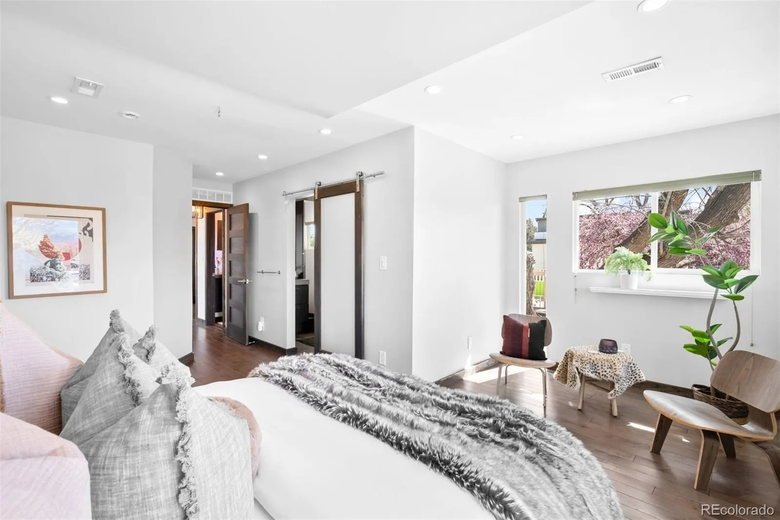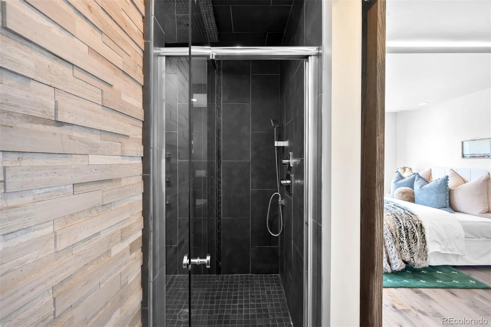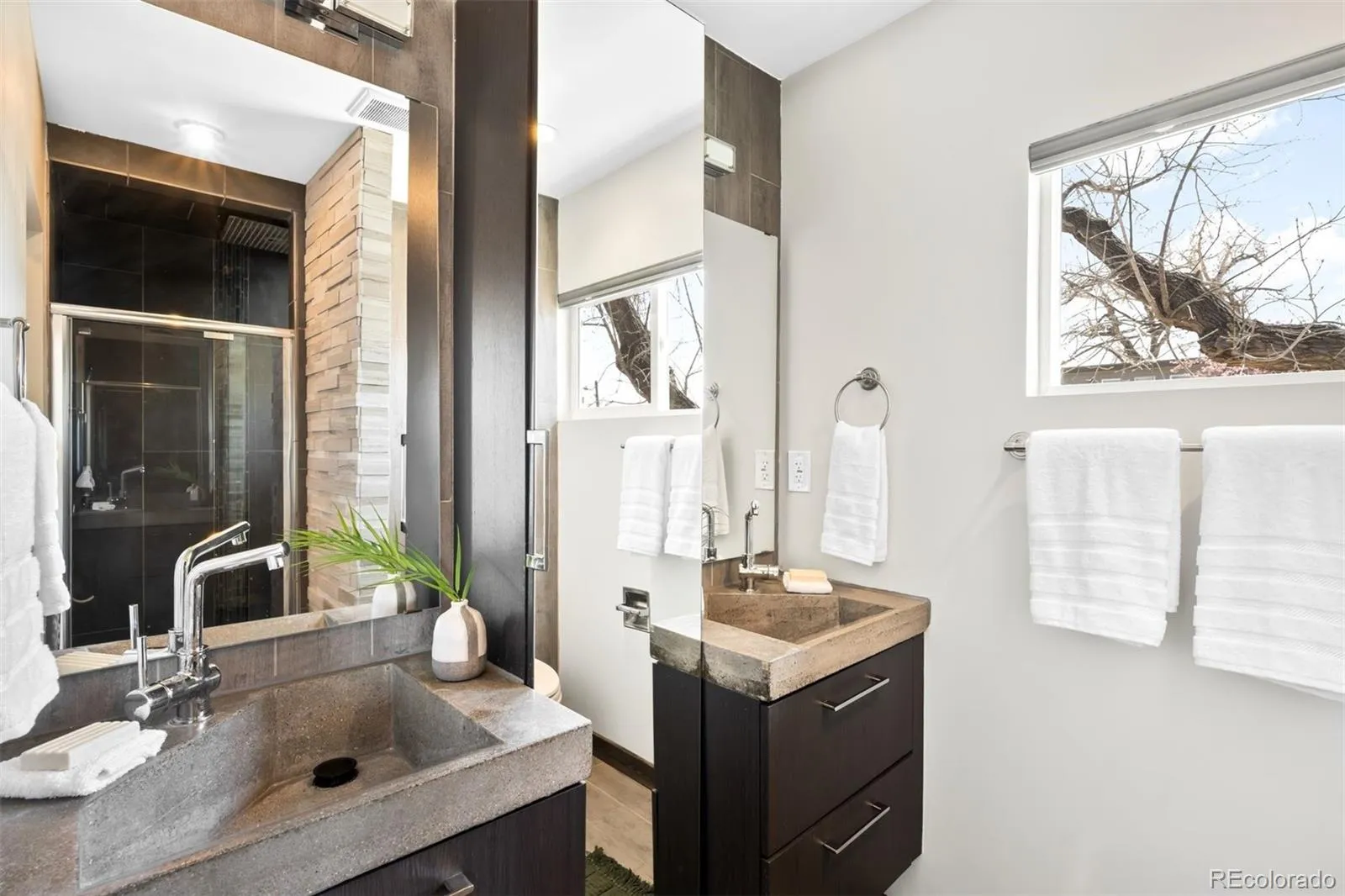 A modern zen-inspired home where smooth concrete finishes and a two-story wall of cascading water create a sense of flow upon entry. A front deck welcomes, wrapping the side of the home. Hardwood floors lead into the main living space, where a gas fireplace-framed in stainless steel -anchors the room. Surrounded by expansive windows, the space feels grounded in natural light. Beyond the main living area, sliding glass doors open to the wraparound deck, reinforcing indoor-outdoor connection. The main living space opens into a dining area with sculptural lighting. An eat-in wet bar elevates the space with open shelving and windows flooding the nook with natural light. The kitchen continues the same design language with a wood eat-in counter, sleek glossy cabinetry, concrete countertops, bold blue tile backsplash, + stainless steel appliances. At the center of the home, a striking interior water feature runs alongside the staircase, framed by a full-height window wall that draws in light. A powder bath and laundry complete the main level. Outdoors is a layered experience, featuring a covered patio extending to multiple elevated decks, a fully fenced backyard + raised garden beds. A paved walkway leads to a secondary entertaining space and detached two-car garage. Upstairs, two secondary bedrooms share a well-appointed full bath, while the primary suite offers a more expansive retreat. The walk-in closet is customized with built-in storage, while the en-suite bath features dual vanities, a full-body integrated mirror, and a spacious walk-in shower with waterfall-style fixtures. A detached residence defined by natural materials + flow, ideally positioned on a corner lot near the highly sought-after South Broadway corridor. Blocks from Harvard Gulch Park/ Golf Course, moments to neighborhood favorite Osteria Alberico, and 3 minutes to the Gothic Theatre, this location offers effortless access to parks, dining, and entertainment.