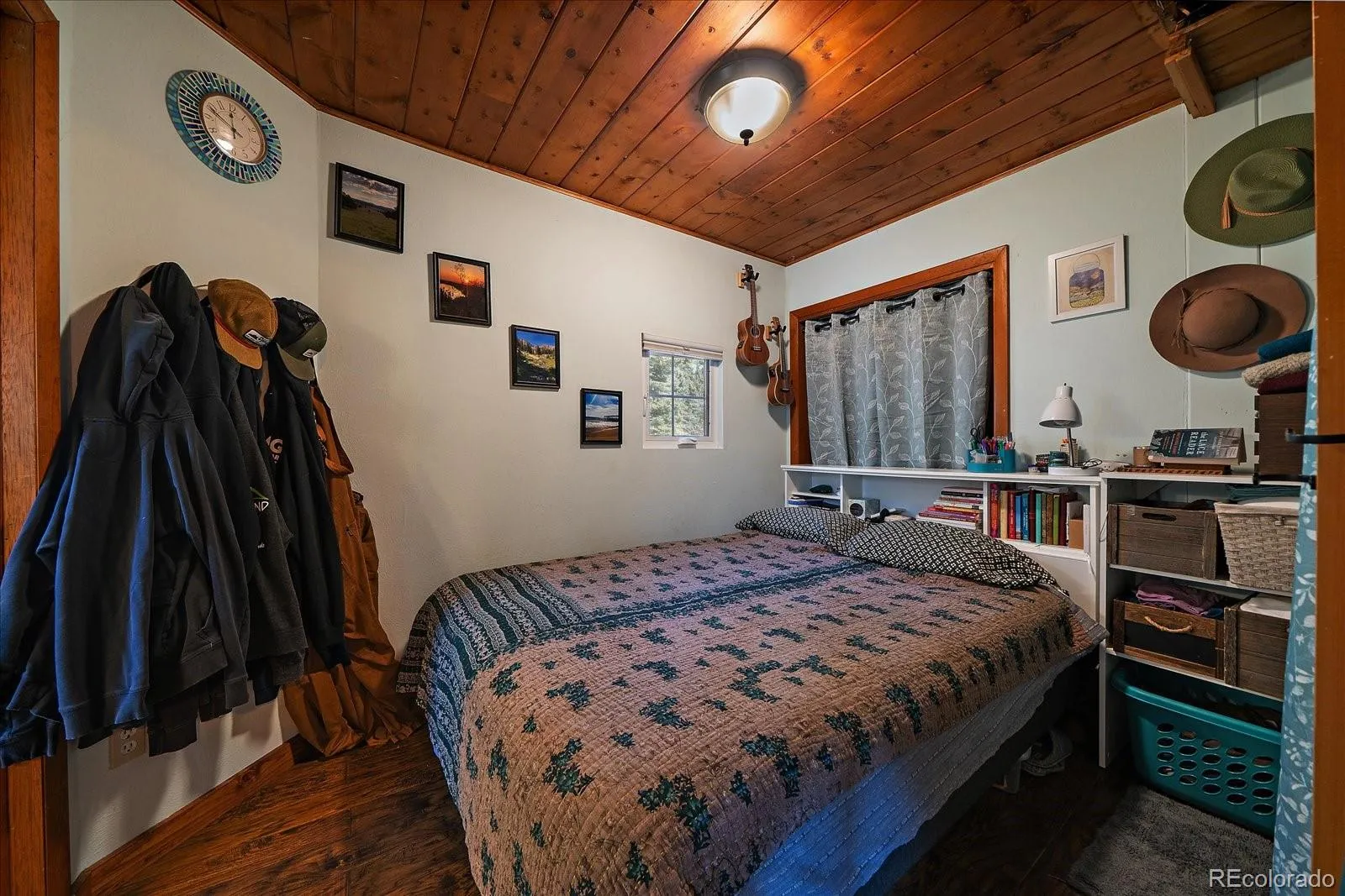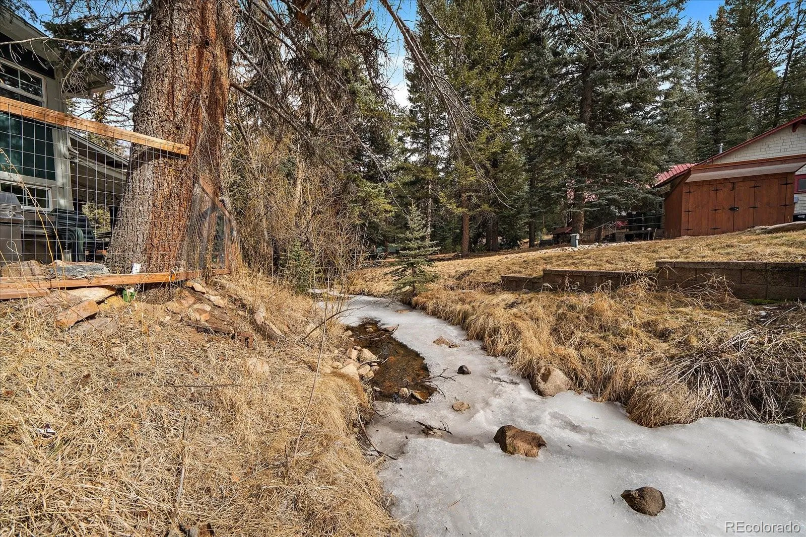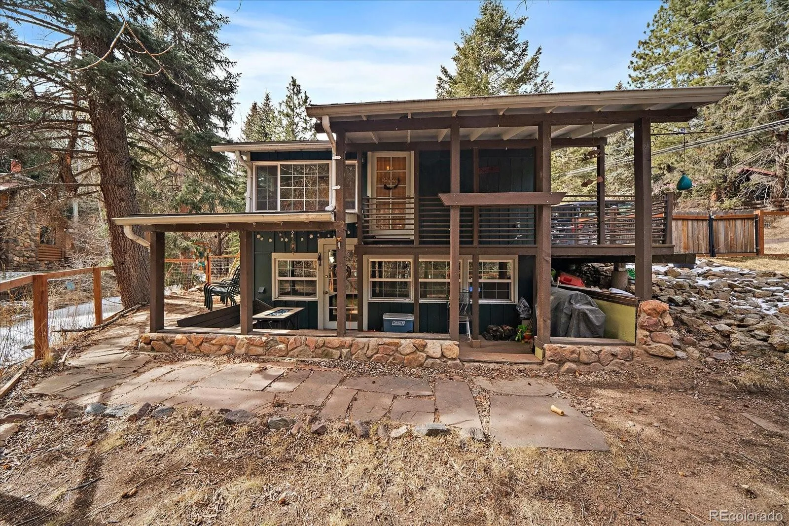 Creekside cabin offering the perfect getaway or year-round living. The fairytale-setting offers fenced yard, sights and sounds of the creek and level driveway. The cabin offers a remodeled greatroom wtih a coffered pine-paneled ceiling. You can enjoy watching the creek, or TV from this charming room. A den was a 2nd bedroom and can easily be segregated off for more privacy. Could also be an office space. The primary bedroom has storage space and en-suite bath. The bath has been remodeled with a walk-in shower. The above-ground lower level offers a second great room with kitchen, dining and sitting room space. The kitchen is well designed for the space, and the flexible area can be home to a secondary living space. The laundry is also located on this level. This level walks out onto the covered patio. Ideal for grilling, hosting backyard gatherings or just reading a book by the creek. The area flows into a flagstone patio and fenced yard. The upper level deck gives additional sights/sounds of the creek. There is ample hidden storage in the home as well as a shed. Short walk (under 10 minutes) to Maxwell Falls open space area and property is locted less than 50 feet from Arapahoe National Forest. Great location for enjoying the nightlife in Downtown Evergreen or enjoying the solitude of 1000s of acres of national forest.