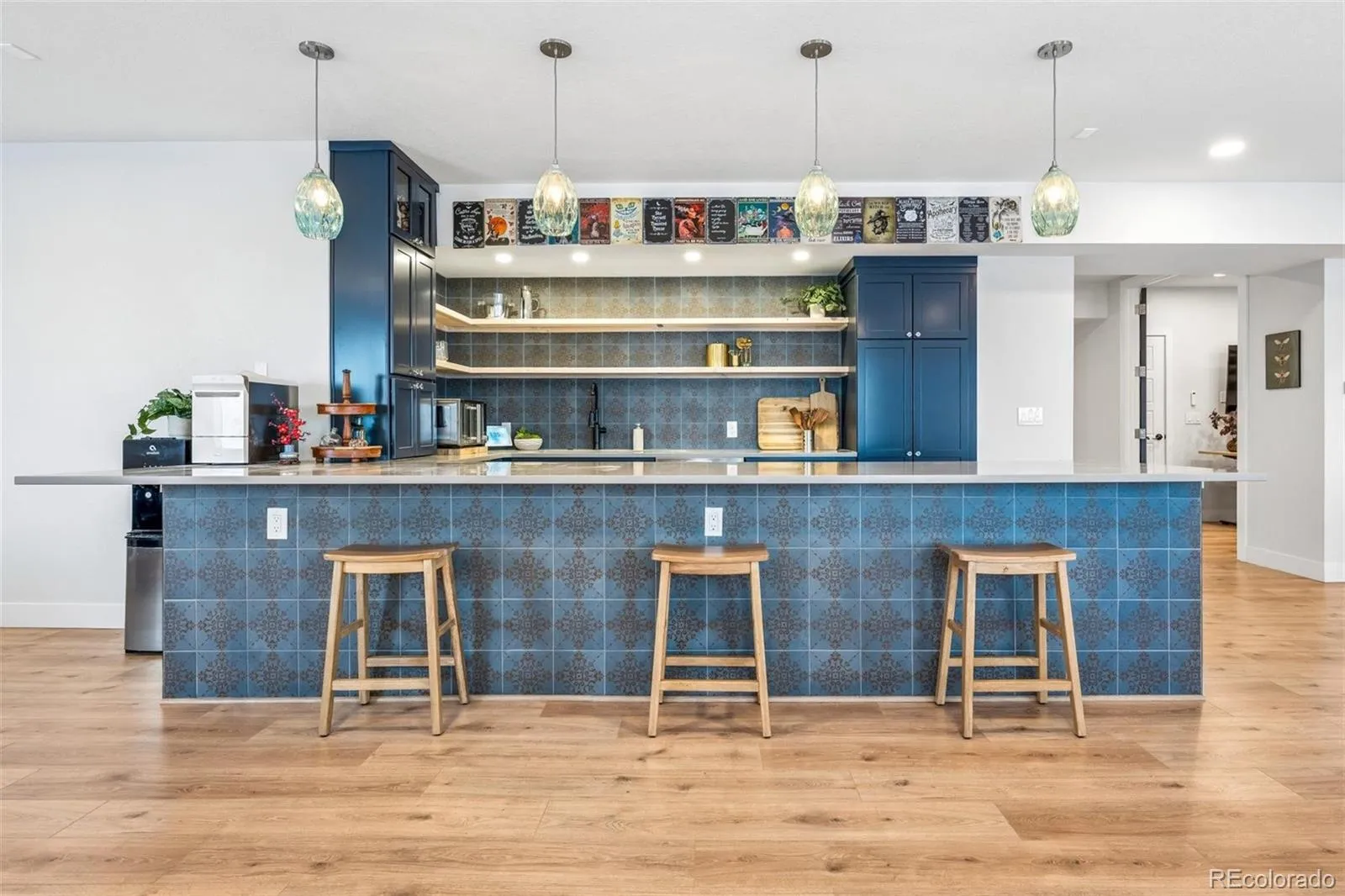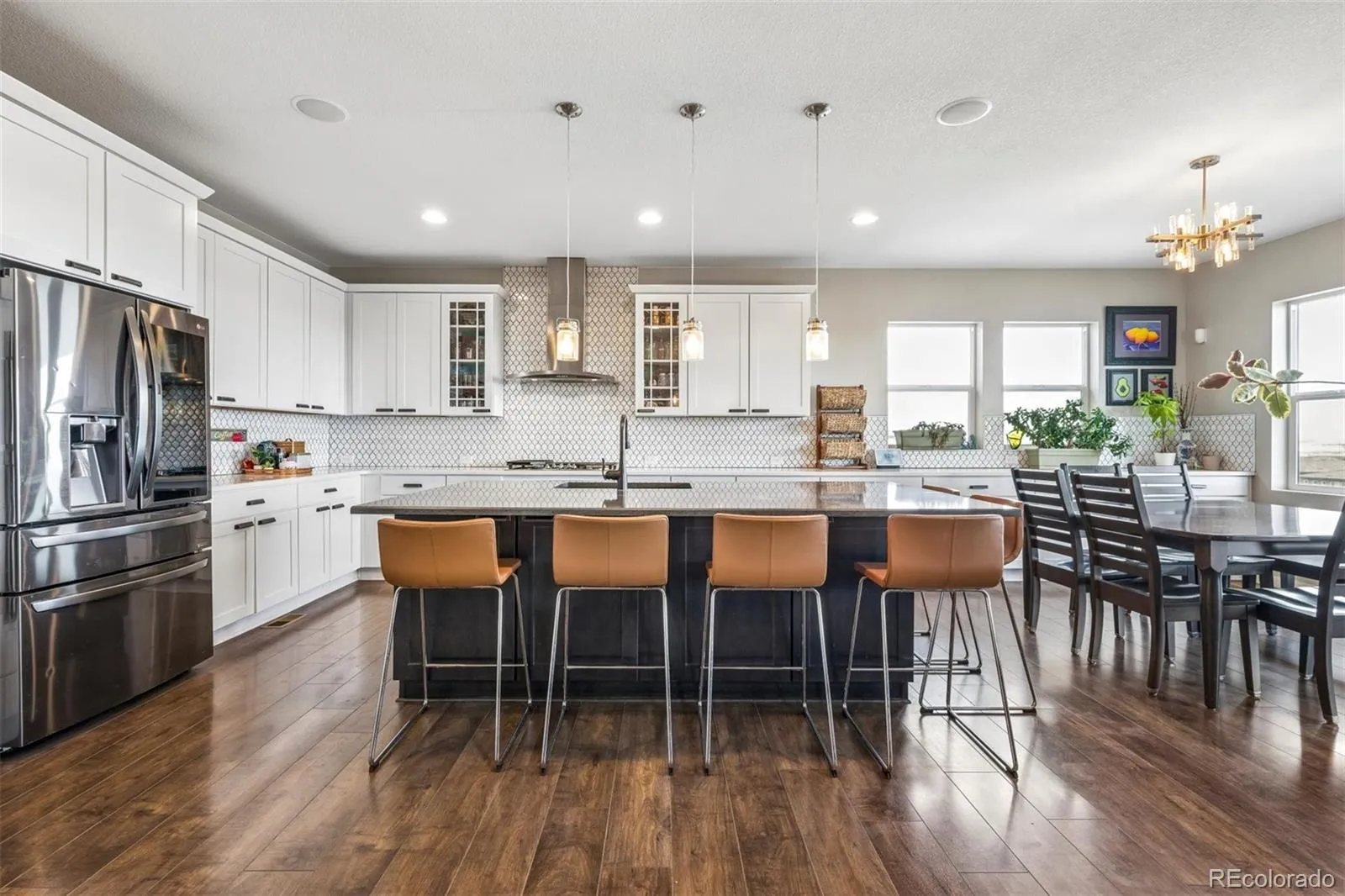 Rare opportunity to own a 6 bed/5 bath, 3-car, walk-out ranch backing to open space in the coveted Stepping Stone neighborhood. You will immediately fall in love with this bright, upgraded gourmet kitchen featuring an oversized quartz island, extended cabinetry into the breakfast nook and beneath the island for added storage, a walk-in pantry, dual ovens, and a 5-burner gas stove. The kitchen opens to an oversized great room with a cozy tile-surround gas fireplace and large windows that flood the space with natural light. Just off the kitchen, enjoy easy access to the covered Trex deck—perfect for breathtaking sunrise views overlooking open space and much of Parker—an ideal setting for morning coffee or evening relaxation. The primary bedroom includes a luxurious 5-piece bath, dual closets, and direct access to the laundry room. Two additional bedrooms with an adjoining full bathroom, a large study with French doors, and a powder bath complete the main level. An open stairwell leads to a spectacular finished walk-out basement featuring a custom kitchenette bar with a large quartz peninsula, full-size sink, dishwasher, built-in microwave, double beverage fridges, and open shelving. A generous entertainment room with custom ceiling beams offers great flexibility for a variety of uses. The basement also includes two additional bedrooms with en suites, a second laundry room, and a study or 6th bedroom with French doors and a closet. Two separate unfinished storage areas provide ample extra space. Additional highlights include 8-foot doors throughout, a newer separate high-efficiency furnace for the basement climate control, new fans with remotes, and pre-wired CAT6 and RG6 in nearly all rooms. Enjoy Colorado evenings in the backyard with a custom gas fire pit. This home is perfect for entertaining inside and out. Take advantage of all that Stepping Stone has to offer, including a pool, community events, parks, and trails. Don’t miss this one.