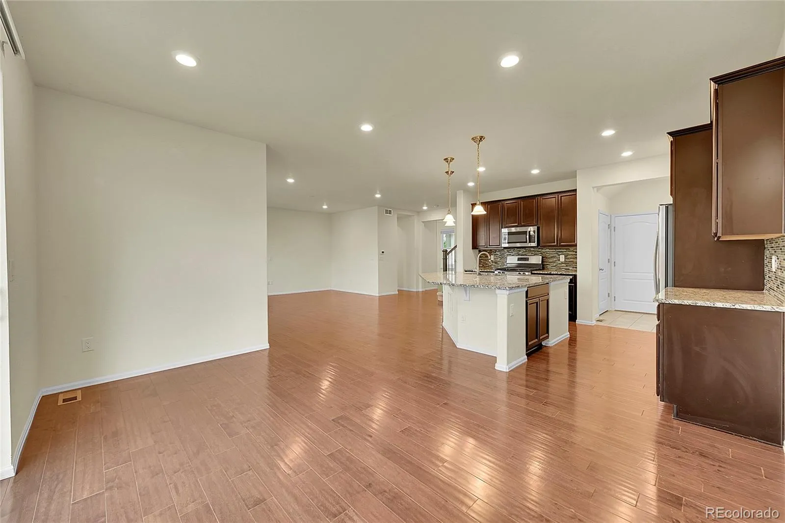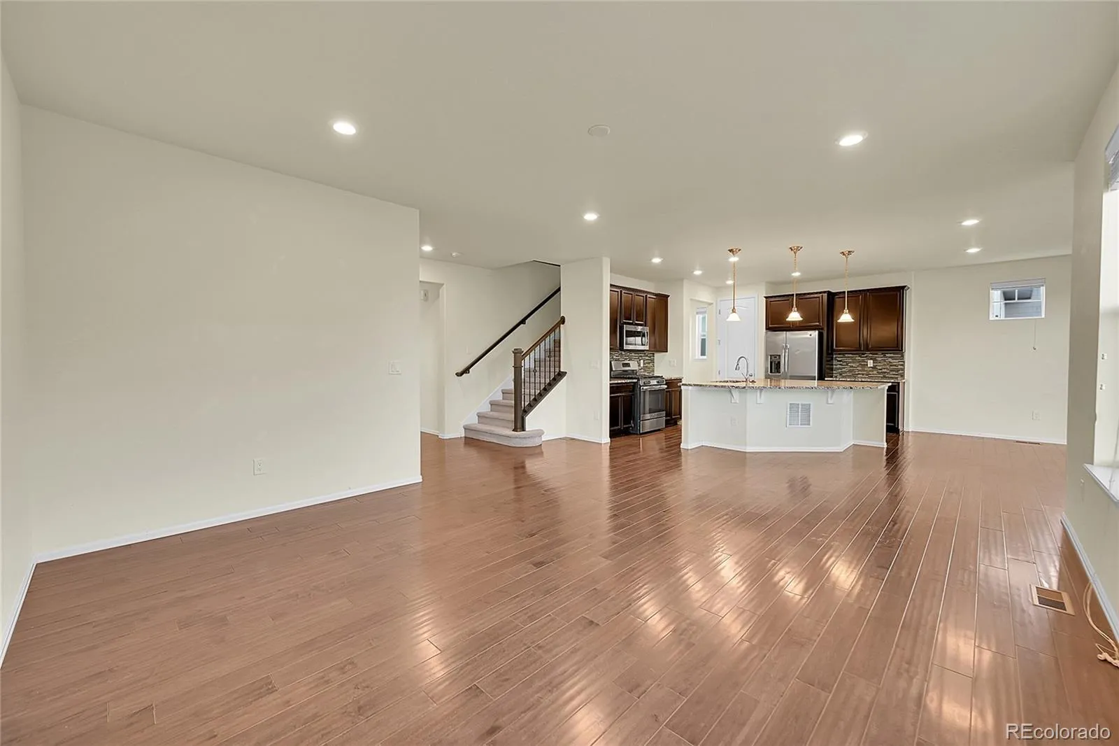 Inside features 4 bedrooms, 3.5 bathrooms, a main-floor office, and an open-concept layout. The gourmet kitchen is the centerpiece, showcasing granite countertops, a large island, stainless steel appliances with a gas range, a pantry, and rich walnut cabinetry.