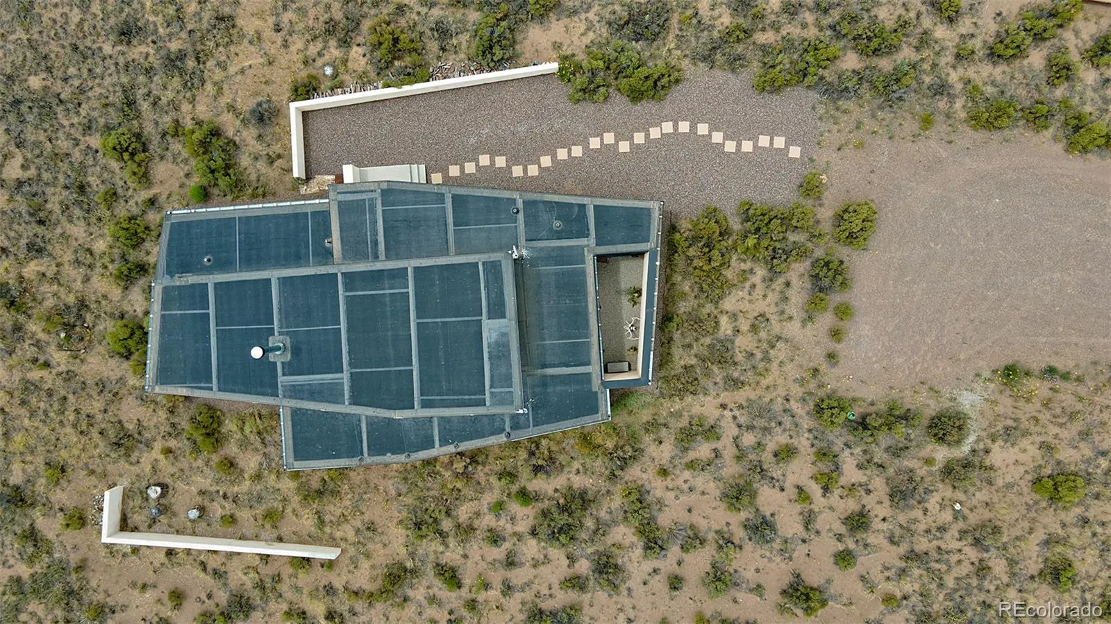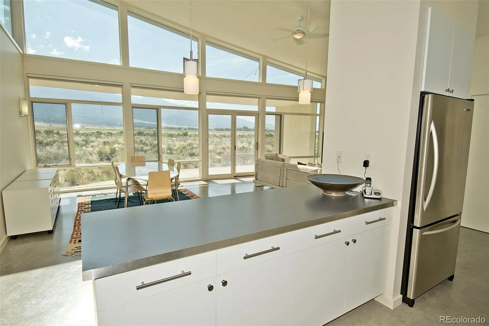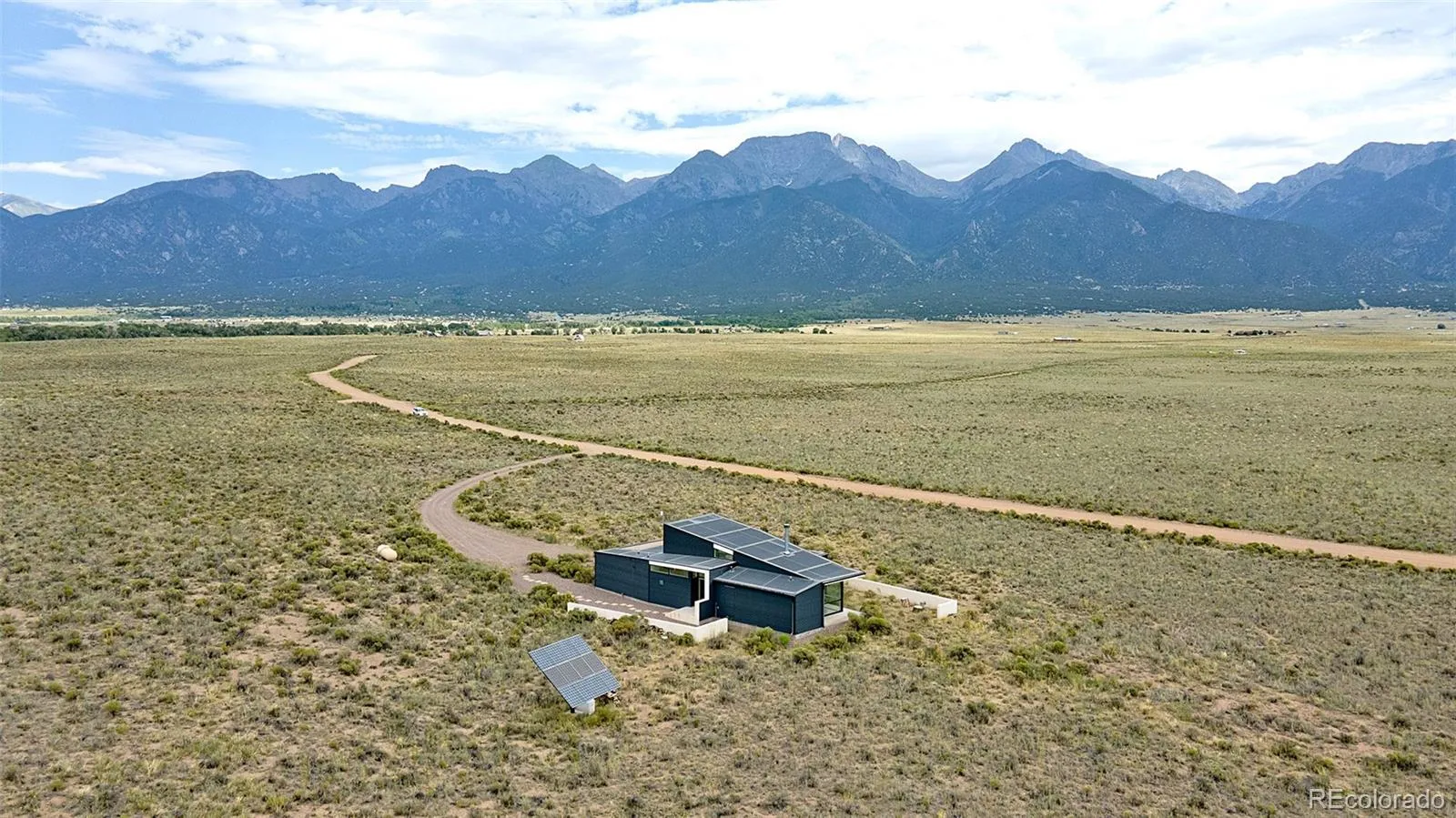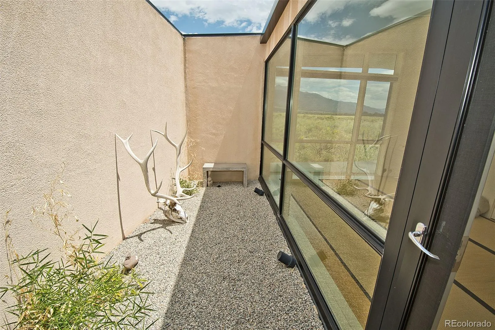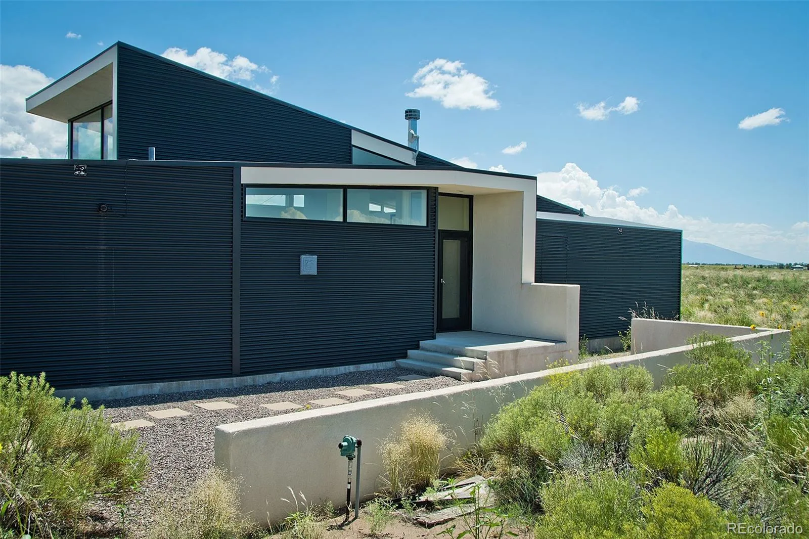 Welcome to the “Zen Garden House”, a showcase in sleek Japanese aesthetic, by contemporary New York architect David Jay Weiner. Concrete, steel and glass are folded together in perfect harmony, to mimic the delicate folds in classic Japanese Origami, culminating in a work of art that showcases the spectacular beauty of the Sangre de Cristo Mountains. Situated on 20 contiguous acres, with an additional 10 across the street to protect privacy and view. Entering the house through the west into the Great Room, you are greeted with floor to ceiling windows, dominating the east and south faces of the home. The white and steel clad kitchen has ample cabinet space for most home chefs, and the huge island is the ideal counter for playing host, along with the flexible space in the Great Room. Designed to allow natural cooling with constant airflow, large stucco and metal awnings protect the windows from direct weather and cover the 315 sq ft deck. In-floor radiant heat through polished concrete floors and high R-value insulation maintains the warm interior winter temperature, while a fireplace provides additional cozy warmth. To the north of the house, the namesake of the house provides tranquility and a private view of nature in the glass and concrete enclosed Zen garden. Inside, the floor has been inlaid with Japanese Tatami mats, perfect for yoga, sitting, and even sleeping. A full bath adjacent includes beautiful custom teal tiles and handy wall insets, as well as a deep closet for storage. On the south side of the home, the primary bedroom opens up with dramatic views of the mountains and sand dunes, as both of the entire walls on the corner are fully comprised of windows. The primary bathroom features stunning custom tile work and a luxurious soaking tub with an exterior viewing window, and a large walk in closet rounds out the primary suite. Form and function blend in this must see home, visible in the virtual tour.