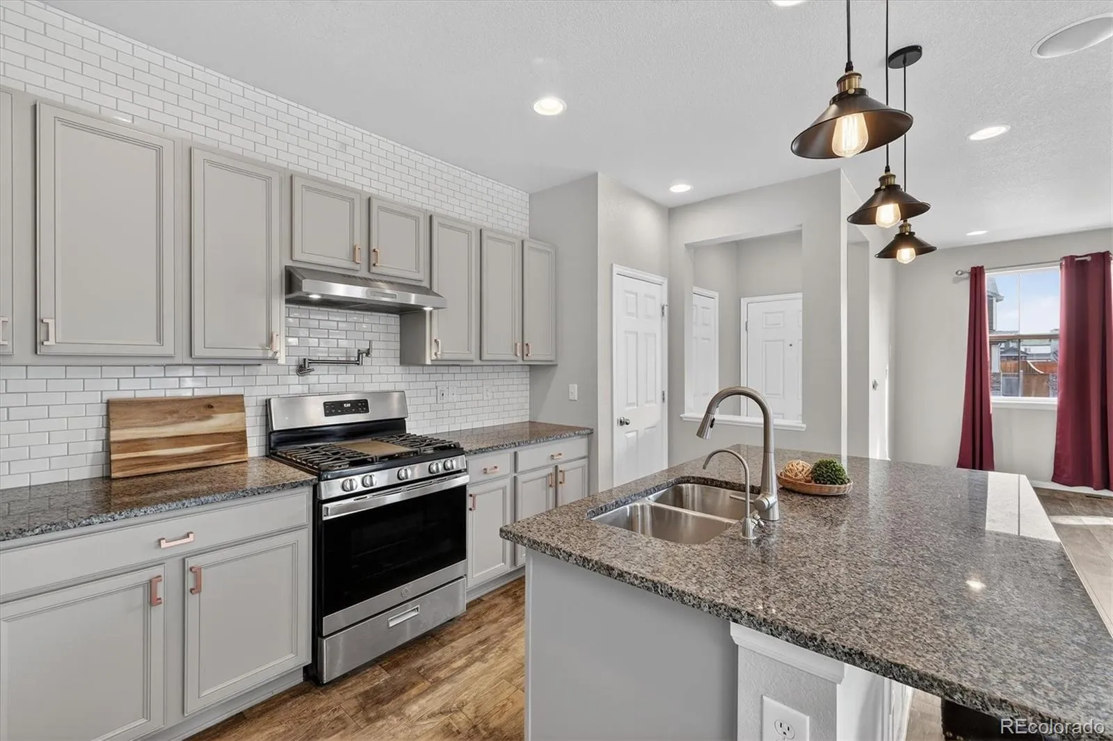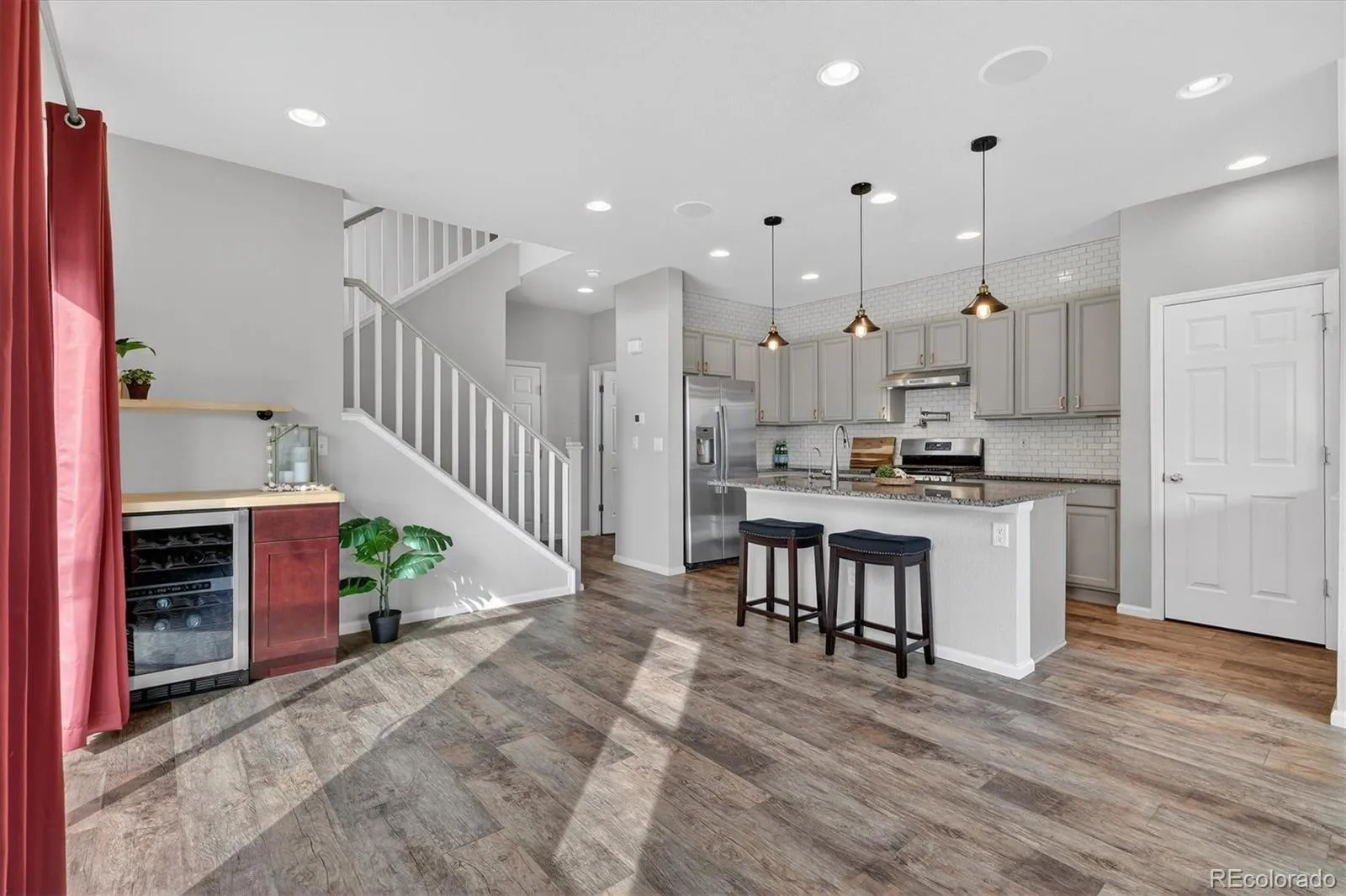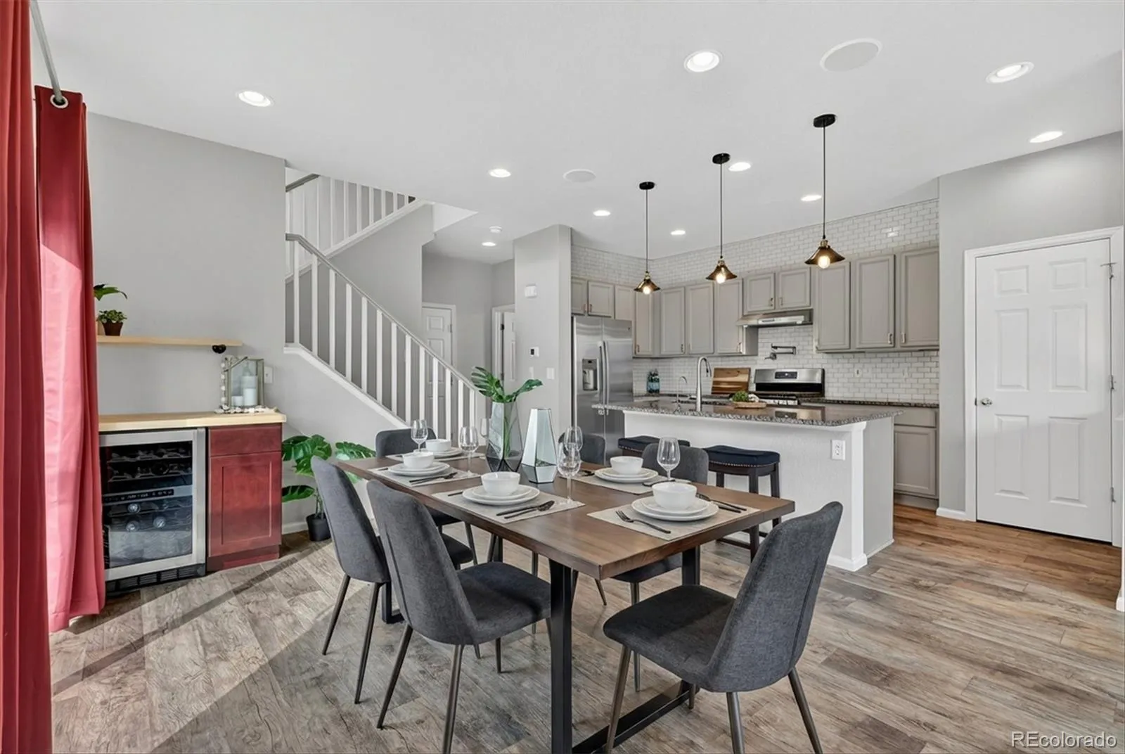 From the moment you step inside, you’ll notice the attention to detail, including professionally installed drapery and rods that elevate each room. The open-concept main level is designed for modern living and entertaining, highlighted by a stylish dining area featuring a custom beverage bar—perfect for hosting or everyday convenience.