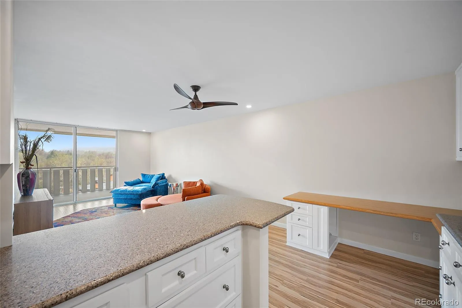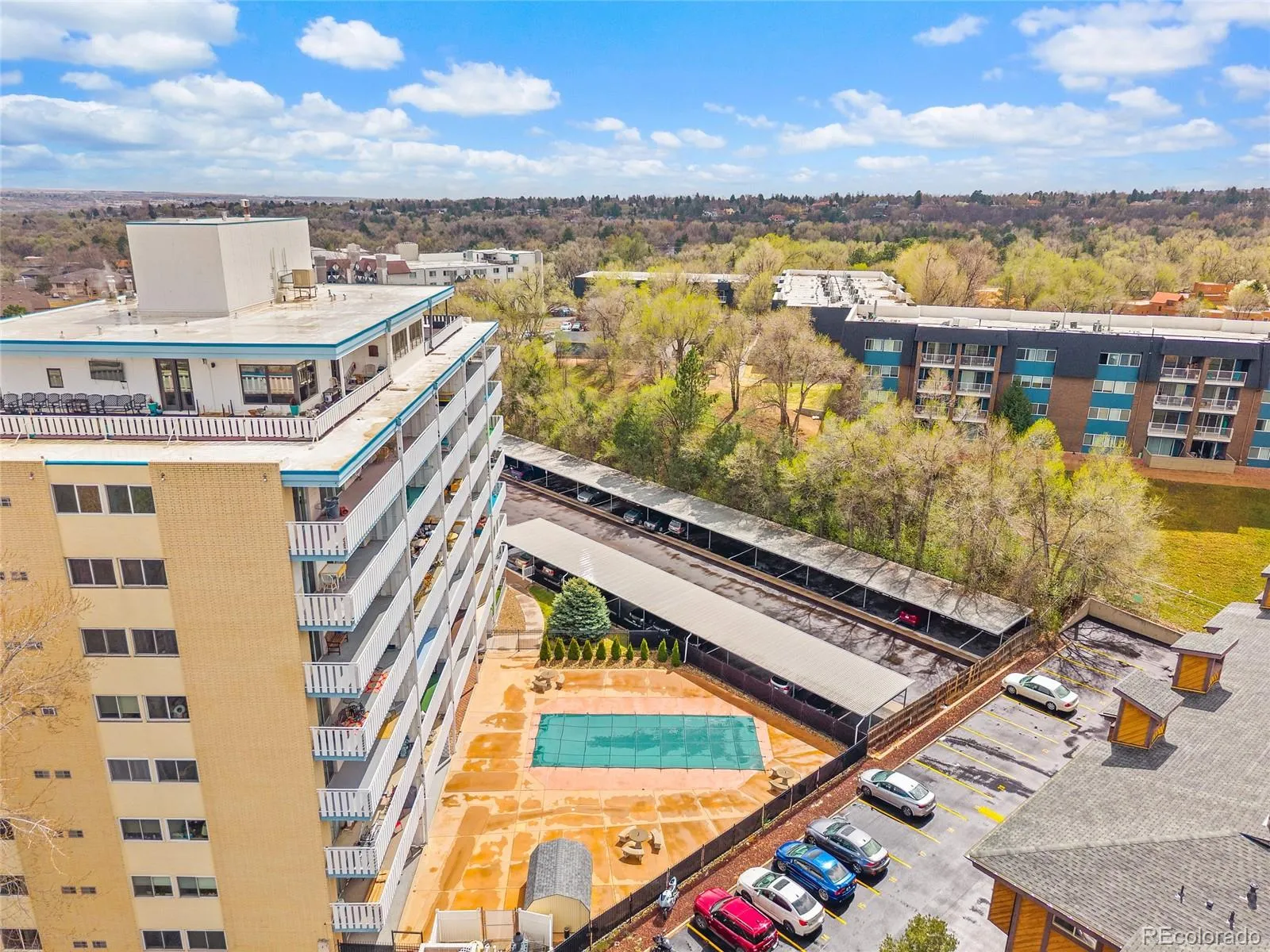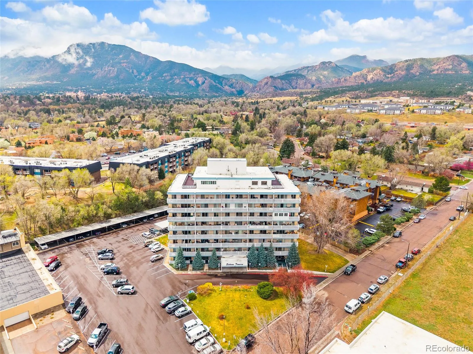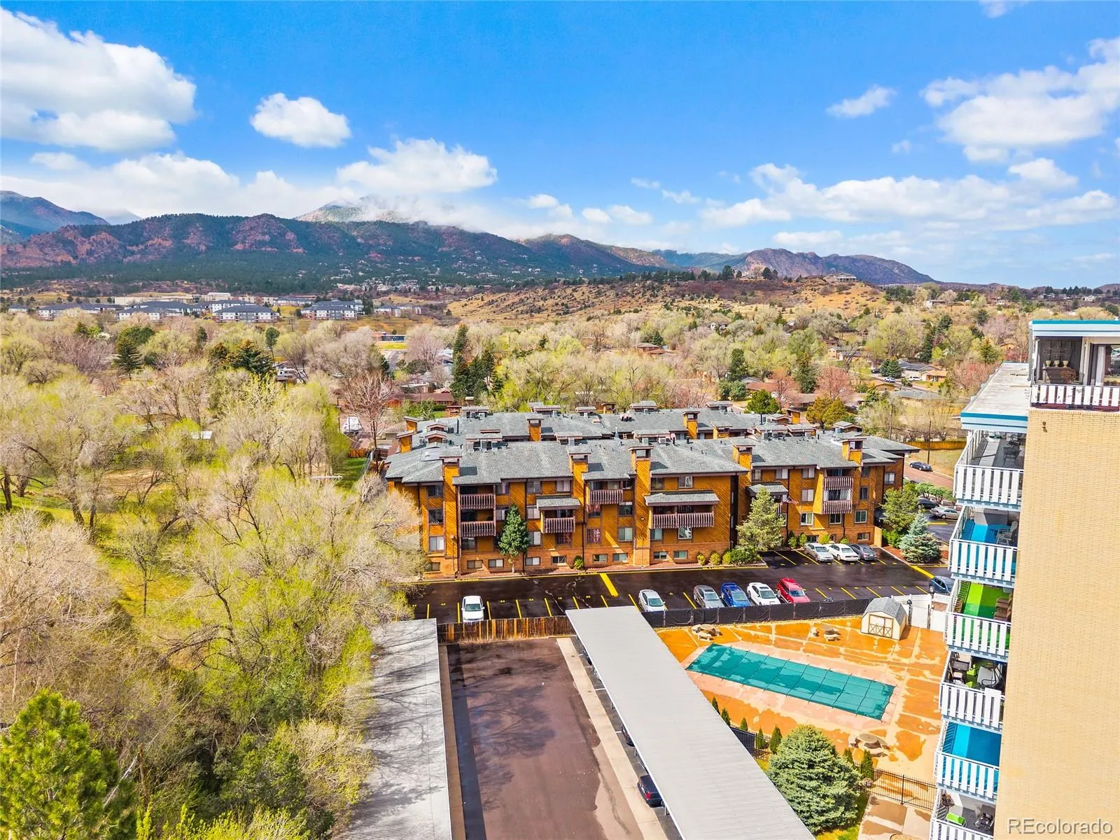 VIEWS for days! This beautifully remodeled 7th floor condo in Saturn Towers showcases breathtaking Front Range and Pikes Peak views that truly steal the show. Step inside to a bright, open layout where floor to ceiling sliding glass doors fill the space with natural light and lead to a spacious covered balcony complete with built in shades perfect for enjoying Colorado sunsets. The thoughtfully updated kitchen features granite countertops, stainless steel appliances, soft close cabinetry, and a functional island with seating. A built in desk area adds flexibility for work or organization, while abundant cabinetry and a large pantry provide excellent storage. The bedroom is comfortable and well designed with direct access to the balcony and custom built in closet systems for efficient storage. The full bathroom has been tastefully remodeled, and an additional vanity area makes the layout ideal for both everyday living and guests. Updated flooring, fresh interior paint. This building offers true low maintenance living with HOA dues covering heat, water, cable, and more. Residents enjoy access to a pool, clubhouse, secured entry, elevator, basement storage, and even a beauty salon located on the ground floor. Dedicated owner parking adds to the ease of living. Ideally located near parks, trails, and within Cheyenne Mountain School District 12, this move in ready condo combines style, convenience, and incredible views in one exceptional opportunity.
