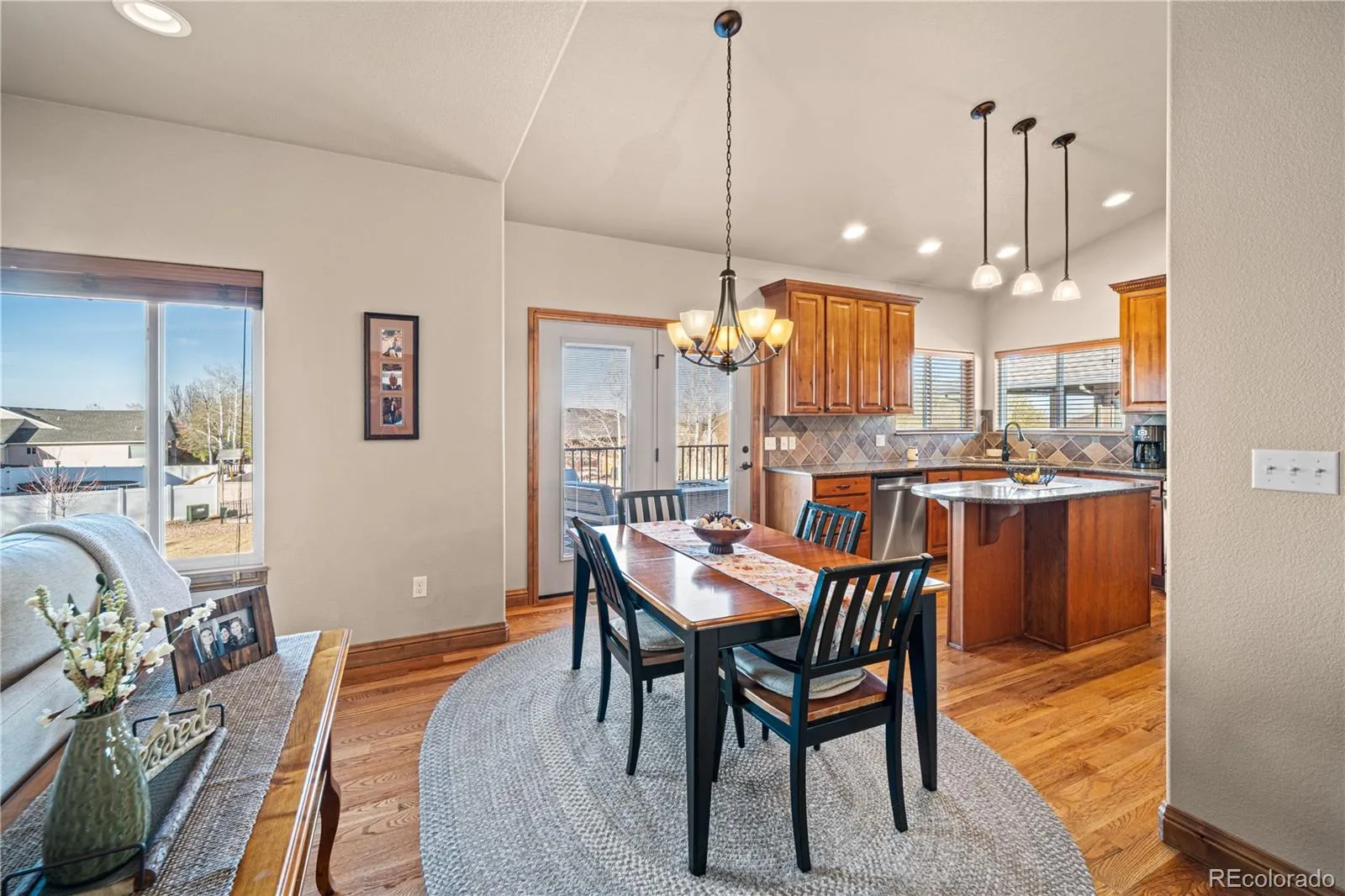 Well-designed two story home with a functional layout, quality finishes, and a finished walk-out basement. The main level offers a vaulted living room with a striking stone fireplace, arched accent window, and strong natural light. A separate family room with built-in shelving provides additional space to gather, while the dining area connects easily to the kitchen for everyday use or entertaining. The kitchen features stainless steel appliances, a center island, tile backsplash, and plenty of upgraded cabinets & storage. Nearby access to the upper deck creates an easy transition for outdoor dining, grilling, or relaxing evenings. Upstairs, the primary suite includes a large walk-in closet and a private bath with dual vanities and an oversized tiled shower with glass block detail. Two additional bedrooms and a full bath complete the upper level. The walk-out basement adds flexibility with two more bedrooms, a 3/4 bath, and a spacious rec room that opens directly to the covered patio. This level works well for guests, multi-use living, or additional entertainment space. Wood accents, solid doors, and a mix of hardwood, tile, and carpet flooring carry throughout the home. The main level laundry room adds convenience. Outside, the fully fenced backyard offers open space, established lawn, views and room to enjoy. Three car attached garage provides space for vehicles, storage, or projects.