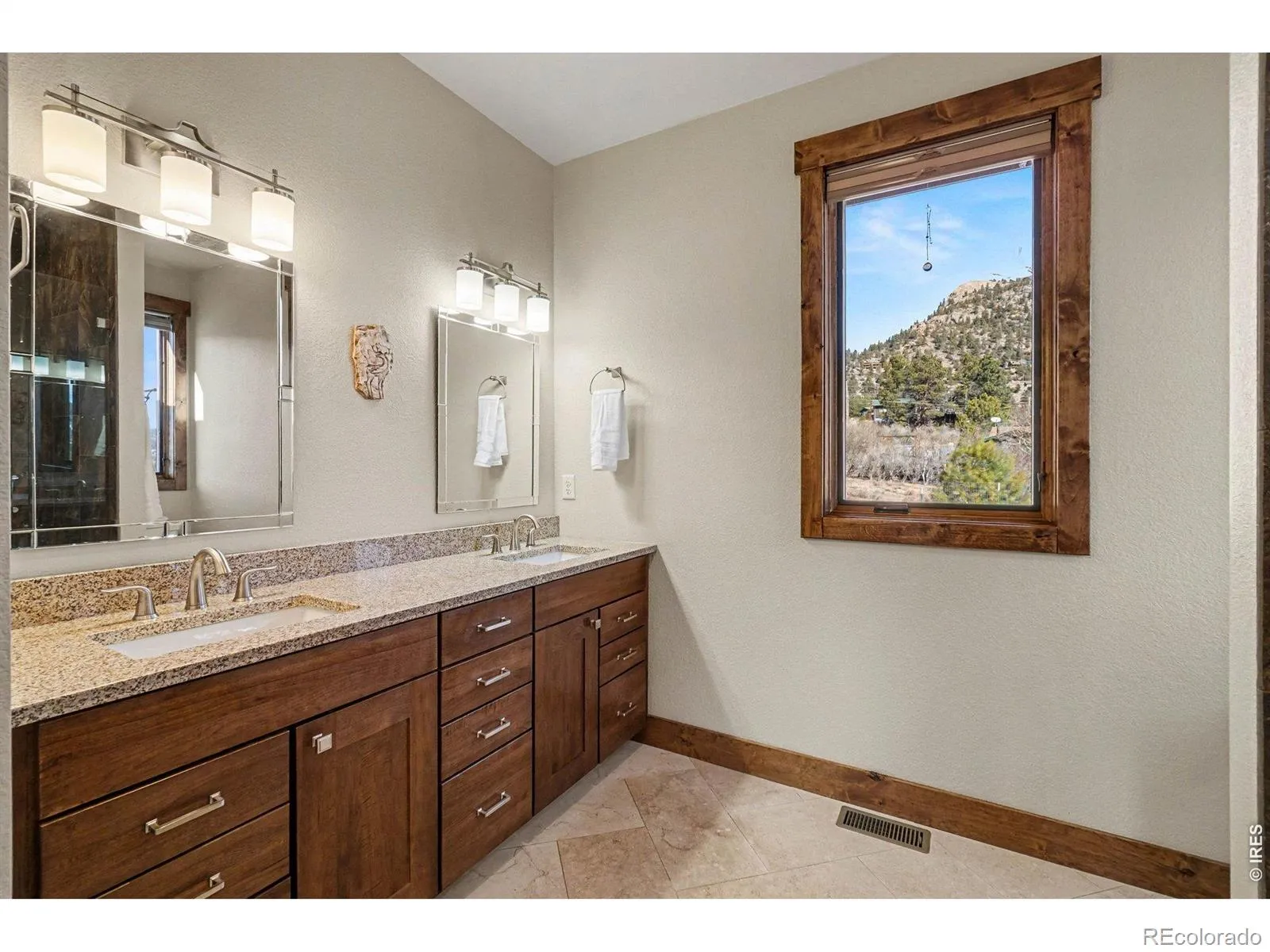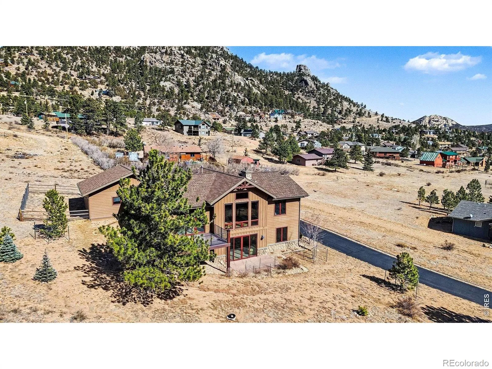 Wake to sunrises over Estes Valley with sweeping views. Located in Cherokee Meadows on a quiet street, is this thoughtfully designed house with 2822 square feet of living space on a 1.12 acre lot. Built in 2018, the open-concept main level is filled with natural light & ideal for gathering, featuring a spacious great room that is highlighted by a soaring vaulted ceiling with a striking stone fireplace and hardwood floors that flows seamlessly onto a large deck, perfect for everyday living & entertaining with a stunning mountain backdrop. At the heart of the home is the kitchen with high-end appliances, cooking island with downdraft cooktop, built in oven, walk in pantry and an inviting kitchen island making this the natural hub where everyone can gather. The primary suite offers a private sanctuary with a bathroom featuring oversized tile shower, double vanity, and walk-in closet with built ins. There is a private office on the main level that provides a quiet workspace. On the lower level there are 2 generous sized bedrooms, full tile bath, and family room with 4 panel sliding doors to the patio, fitness room or 4th bedroom. The outdoor setting is complete, thoughtfully designed for mountain living. Hiking Trails are nearby, along with the private open space of Cherokee Meadows that the Elk and Deer roam freely through. Seller is the Listing Agent and is a licensed Colorado Realtor