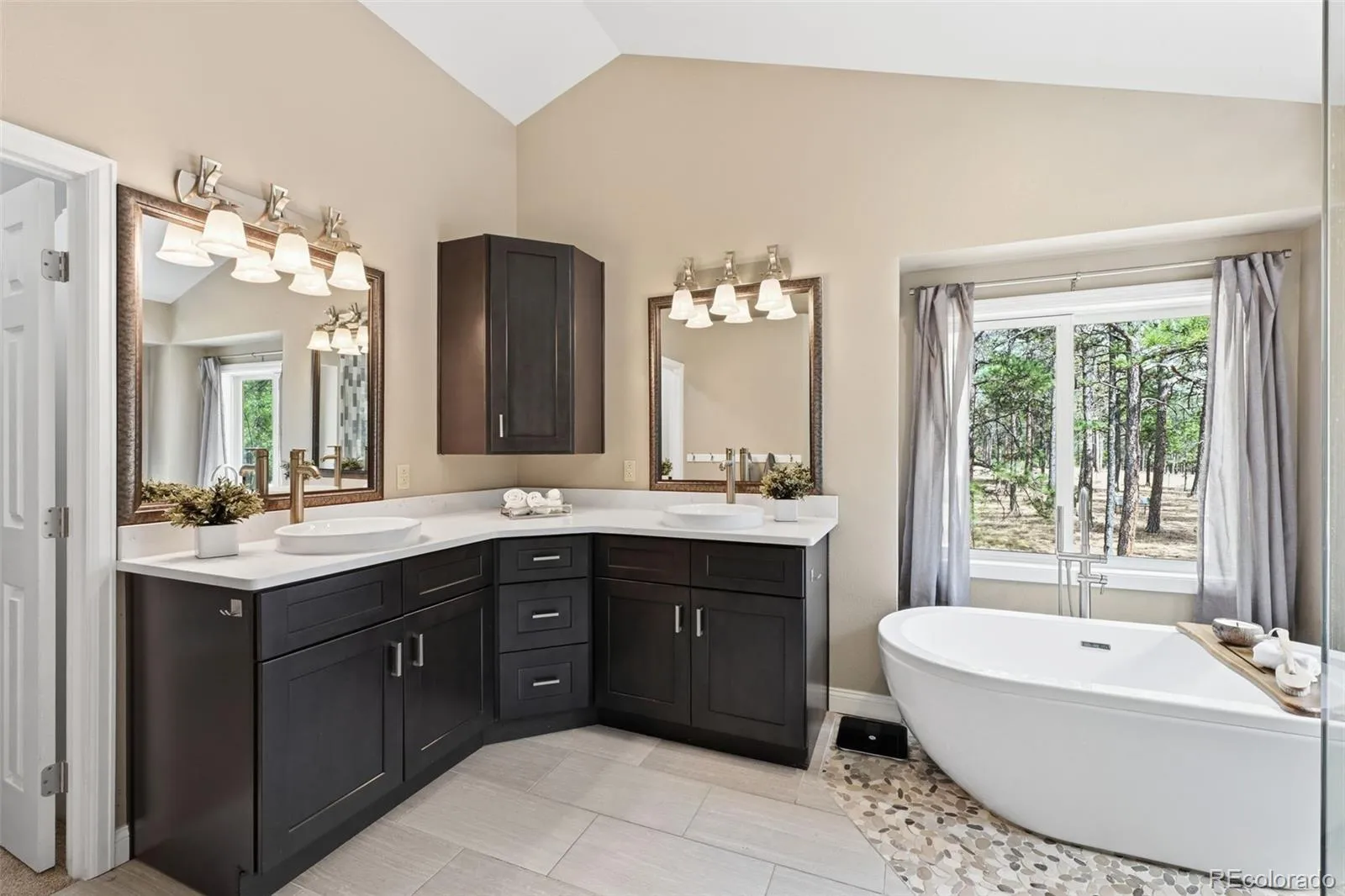 Nestled among the towering pines of Black Forest and set on 4.8 acres, this stunning 5-bedroom, 4-bathroom estate offers a blend of luxury and Colorado charm—all just moments from the Section 16 Trailhead for hiking and horseback riding. The spacious primary suite features vaulted ceilings, sitting area, access to a 25×16 upper deck, a 5-piece bath with soaking tub, and additional connected room provides flexibility as a nursery, office, or private retreat. Designed for both everyday living and entertaining, the home showcases a beautiful gourmet kitchen that features leather-textured granite countertops, a Wolf range top, Sub-Zero refrigerator, and Sub-Zero wine fridge, flowing into a warm family room with fireplace and a formal living room with its own fireplace. Outdoor living is exceptional, highlighted by a partially covered 56×15 lower deck with heaters, and a covered hot tub for year-round enjoyment. A detached 16×16 pavilion with a natural gas fire pit creates the perfect setting for relaxing evenings. The 6×7 greenhouse on the upper deck is perfect for gardening enthusiasts, while multi-level water features in both the front and back yards enhance the natural setting. The finished basement offers a private secondary suite with its own living room and mini bar, complete with sink and refrigerator. Additional features of the property include an insulated 3-car garage with epoxy flooring, heater, refrigerator, workbench, and built-in cabinetry, Acrylic Stucco exterior with new gutters & leaf guards, all new fiberglass windows, a horseshoe pit, and an electric gated entry for added privacy and security. Equestrian-ready, the 60’x40’ barn includes electricity and water, with space for up to four stalls (currently dismantled but included). This one-of-a-kind Black Forest property combines refined indoor living, exceptional outdoor amenities, and nearly five acres of serene, usable land—an extraordinary opportunity to experience Colorado living at its finest.