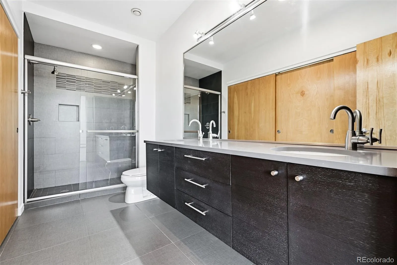 Upstairs, the primary suite showcases expansive windows, Front Range views, and striking 18’ ceilings, creating a bright and open retreat. The en-suite bath offers a clean, contemporary design. A secondary upper-level bedroom is positioned as a distinct, separate sleeping space—functioning similarly to a secondary suite while utilizing the primary bath accessed through the primary suite. An upper-level laundry room adds convenience.