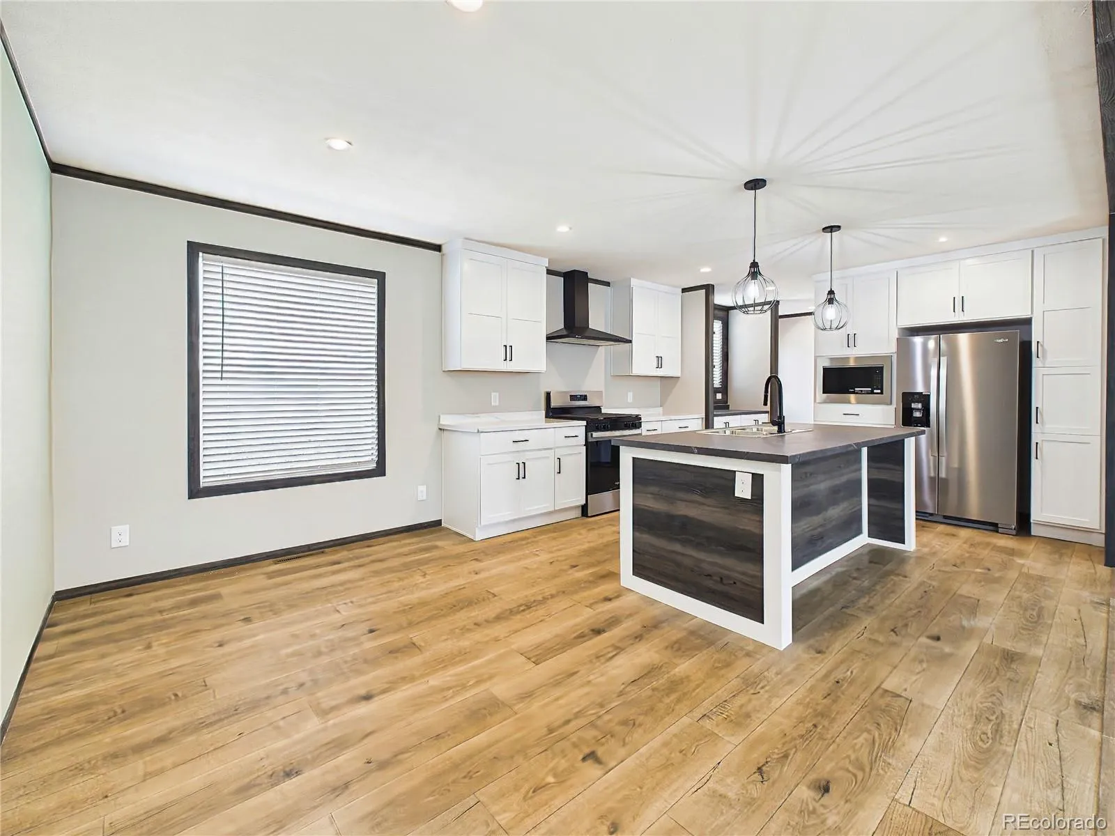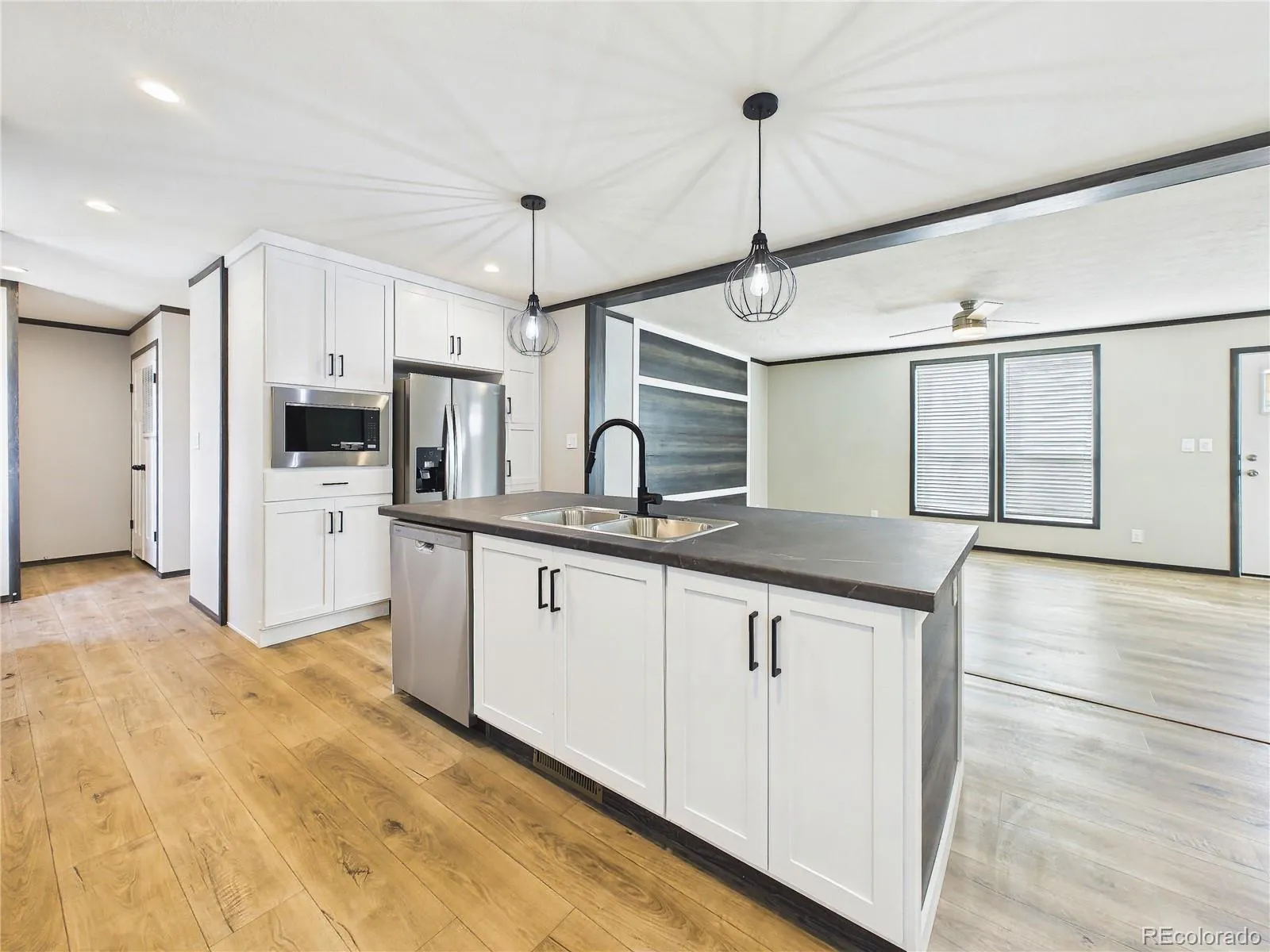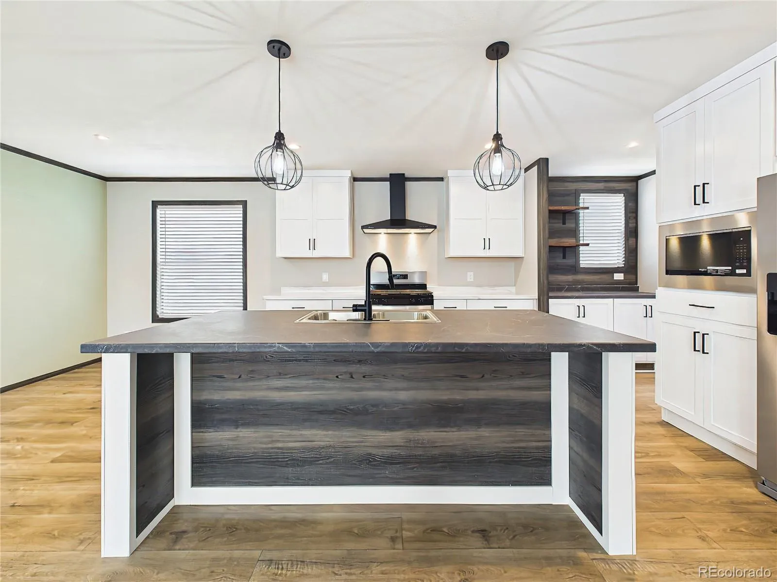 Welcome to this brand-new 4-bedroom, 2-bath ranch-style home located on a spacious corner lot in Pueblo West. Built in 2026, this thoughtfully designed 1,664 square foot home offers a bright and open floor plan with clean lines, modern finishes, and plenty of natural light throughout. The expansive living area features wide-plank wood-style vinyl flooring and flows seamlessly into the kitchen and dining spaces, creating an ideal layout for both everyday living and entertaining. The kitchen is a standout with a large center island, farmhouse-style sink, stainless steel appliances, shaker cabinetry, and pantry for added storage. Just off the kitchen, the cozy dining area is filled with natural light and complemented by a soft green accent wall. The private primary suite includes a walk-in closet and a well-appointed en-suite bath with dual vanities, a glass-enclosed shower, and a private water closet. Three additional bedrooms provide flexibility for guests, a home office, or hobbies, while a second full bathroom features stylish black matte fixtures and a tub/shower combo. A dedicated laundry room with wall-mounted shelving adds convenience and organization. Outside, the home offers excellent curb appeal with its charming red siding, front porch, and mature shade trees. With central air, natural gas heating, and vinyl windows, this home combines comfort and efficiency. Situated in Pueblo West School District 70 and just minutes from local amenities, this move-in ready property is an exceptional opportunity.