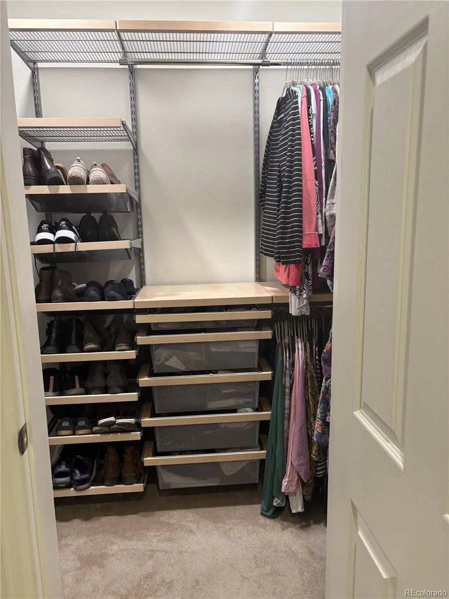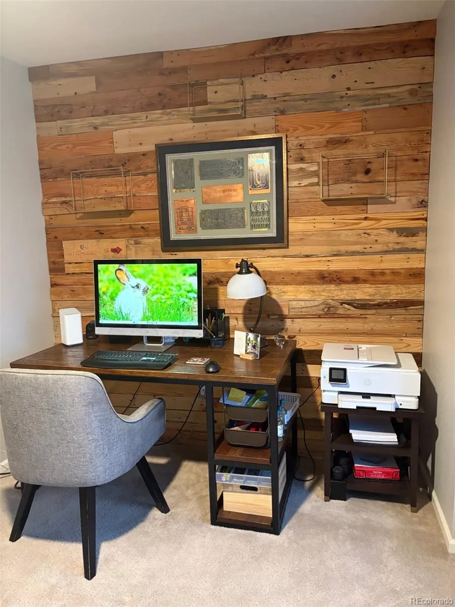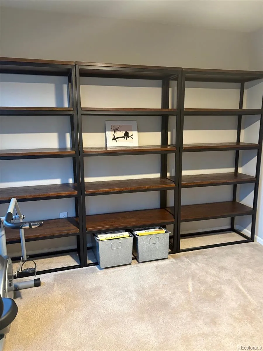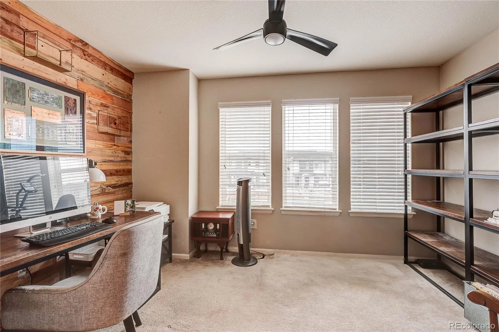 On the upper level, office and bedrooms are carpeted, but wood floors or tile are elsewhere. Office has glass pocket doors with a desk and shelves from Arhaus (negotiable with seller). The master suite includes a large tiled shower, double sinks, and a walk-in closet with custom-built Elfa shelves. The second bedroom has a full bath and walk-in closet. Third bedroom is perfect for gym equipment or a guest room.