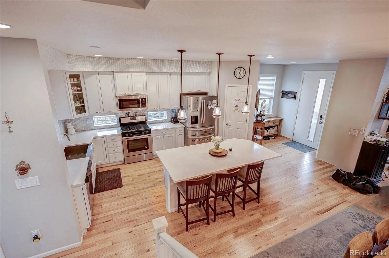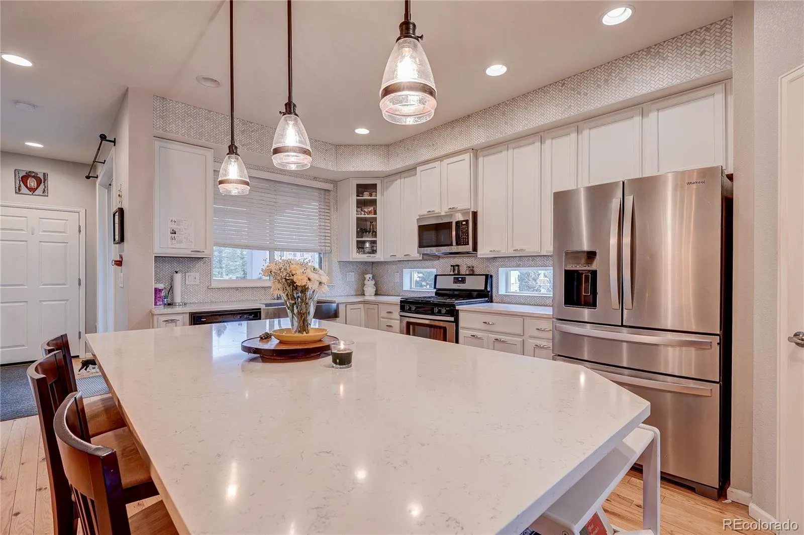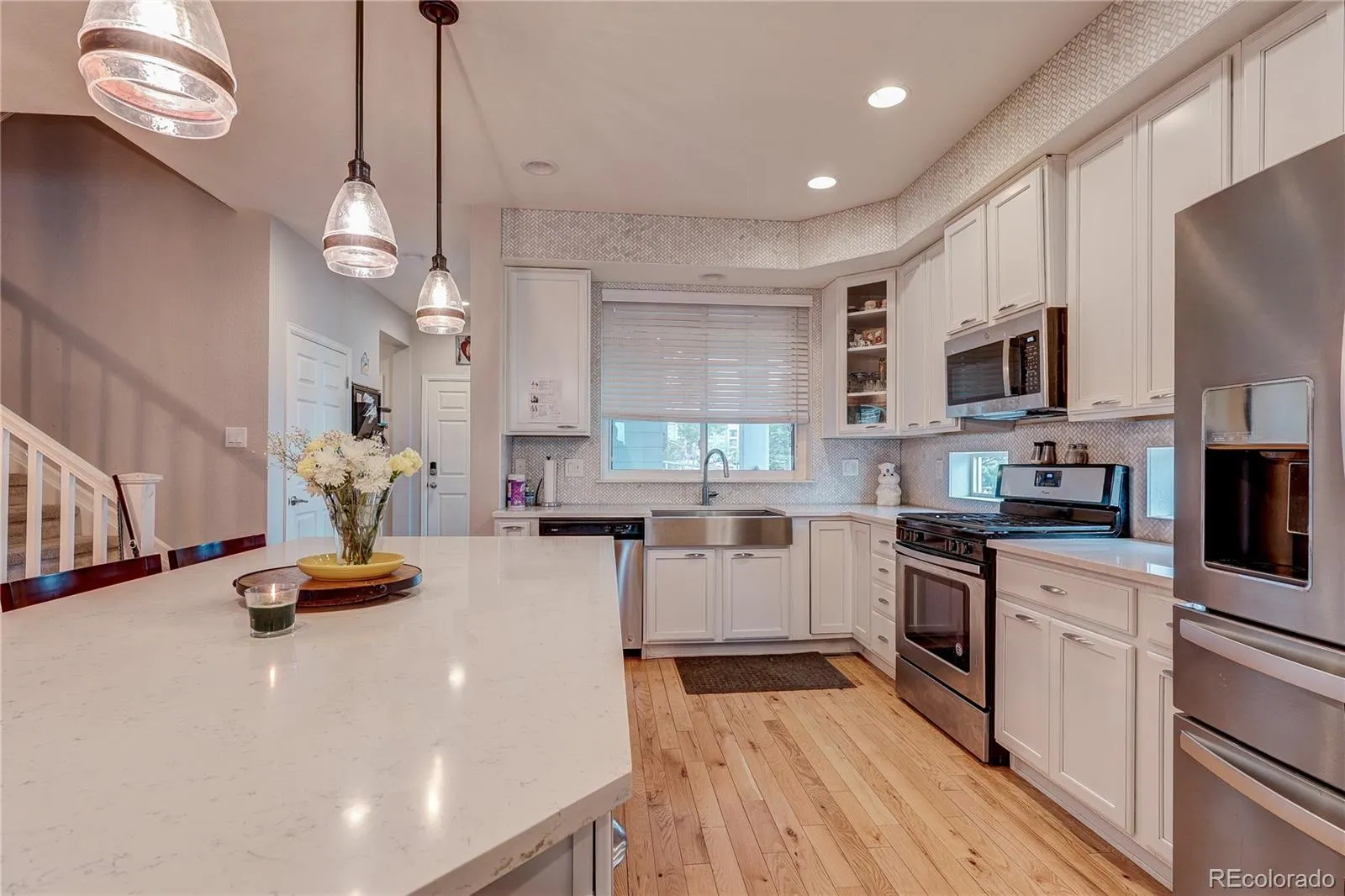 This unique end-unit townhome on a greenbelt is one of the few in the highly sought-after Green Gables Community. Its generous open floor plan has hardwood floors throughout the first floor. Spacious bright kitchen includes white wood cabinets, pendant lighting above a large island, stainless steel appliances, a brand new LG dishwasher under warranty, gas stove and oven, quartz counters with white and grey hued herringbone tiles along the backsplash and above the kitchen cabinets. Eyebrow windows and a south-facing window flood the area with bright light – perfect for plants. Powder room is off the kitchen.