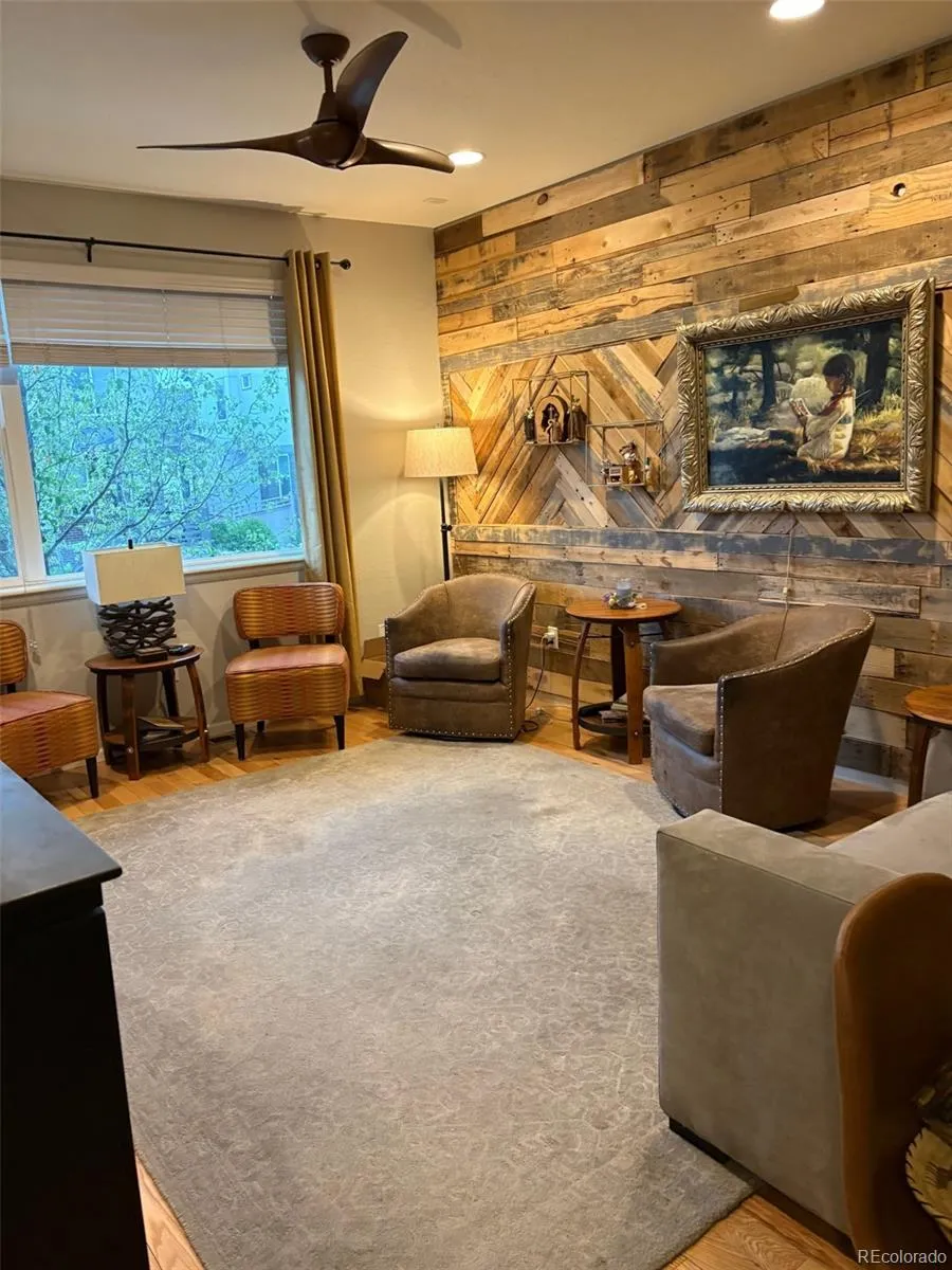 In dining area, hangs a rectangular industrial antiqued light fixture as well as a beveled oval mirror. Living area adjacent to dining room has large window facing trees and green belt. Gas fireplace with a blower provides extra heat. Above the fireplace, is a hand-carved wooden mural of a Native American buffalo hunt. Light, mirror, and mural are included in sale.