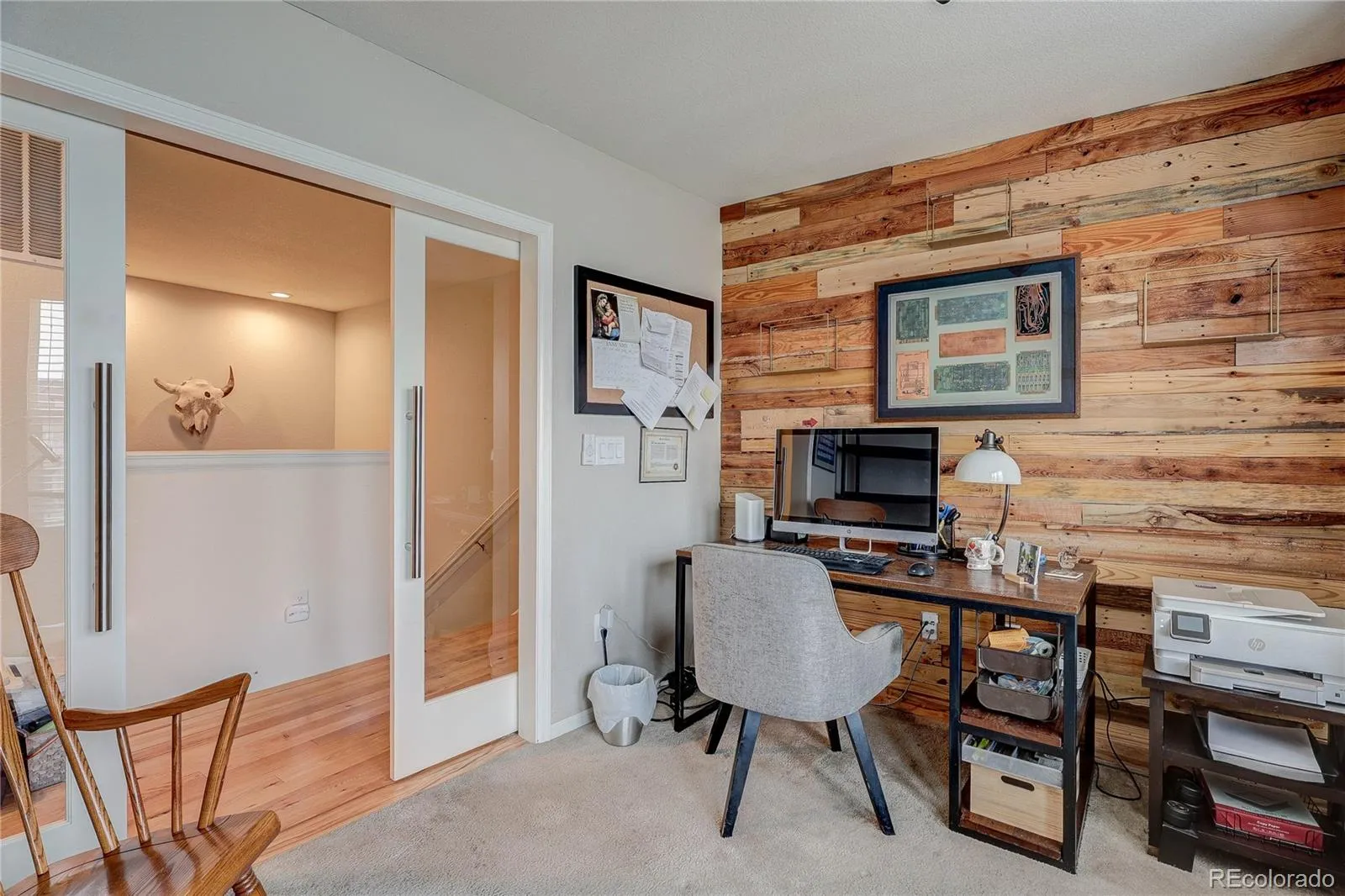 Three bedrooms and three bathrooms on the second floor, along with an office with glass pocket doors.