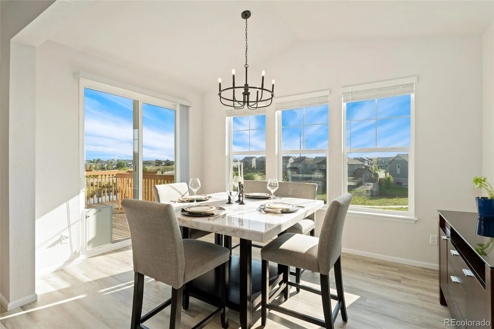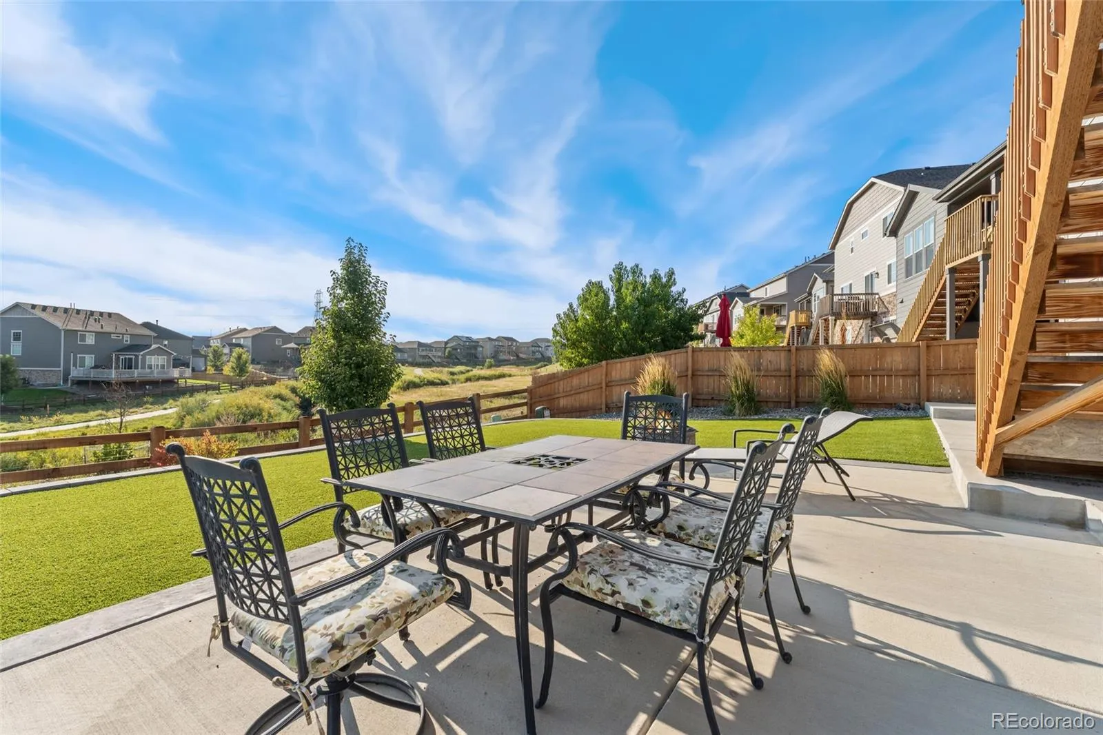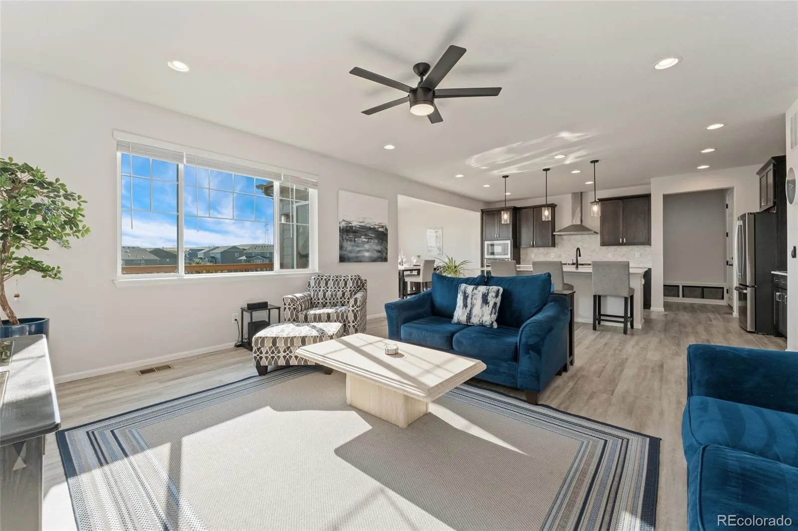Gorgeous two-story home set on a private lot in southeast Aurora, where open space and wide views create a sense of room to breathe from the moment you arrive. Natural light pours through oversized windows, filling the home with warmth and highlighting the clean lines, bright tones, and tasteful finishes throughout. Thoughtfully designed and extremely well-maintained, this home offers a layout that feels both elevated and easy to live in. The main level flows seamlessly from the living area into a beautifully appointed kitchen, featuring quartz countertops, stainless steel appliances, a striking backsplash, a walk-in pantry, and a large island with breakfast bar seating. Pendant lighting adds a touch of style while LVP flooring runs throughout the main level, creating a cohesive look that is both durable and refined. The open design makes everyday living effortless, and entertaining feels natural. Upstairs, a spacious loft provides flexible living space ideal for a second lounge, home office, or play area. The primary suite is bright and inviting, complete with a five-piece bathroom and a large walk-in closet, offering a comfortable retreat at the end of the day, while additional bedrooms are well-sized and thoughtfully positioned. The finished basement expands the home even further with a large open area perfect for a media room, home gym, or additional flex space. Outdoor living is just as impressive. An elevated deck overlooks nearby open space and walking trails, creating a peaceful backdrop with added privacy. The backyard is designed for ease and enjoyment with low-maintenance turf, clean landscaping, and a patio ready for relaxing or entertaining. Additional features include an increased-capacity water heater installed in 2022. Located in a desirable community with friendly neighbors and close proximity to Southlands Mall, Aurora Reservoir, and miles of trails, this home offers the perfect balance of space, style, and convenience.