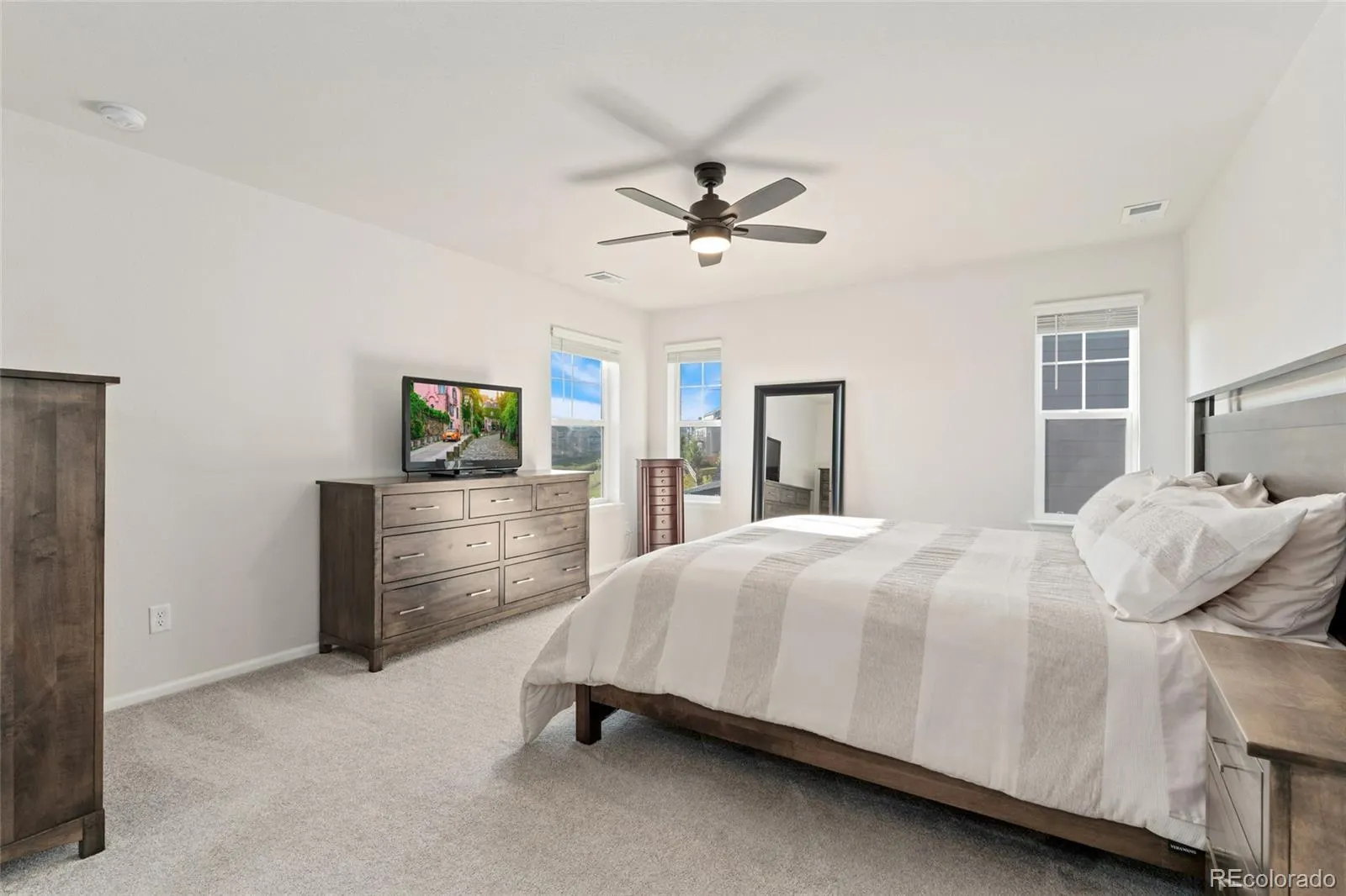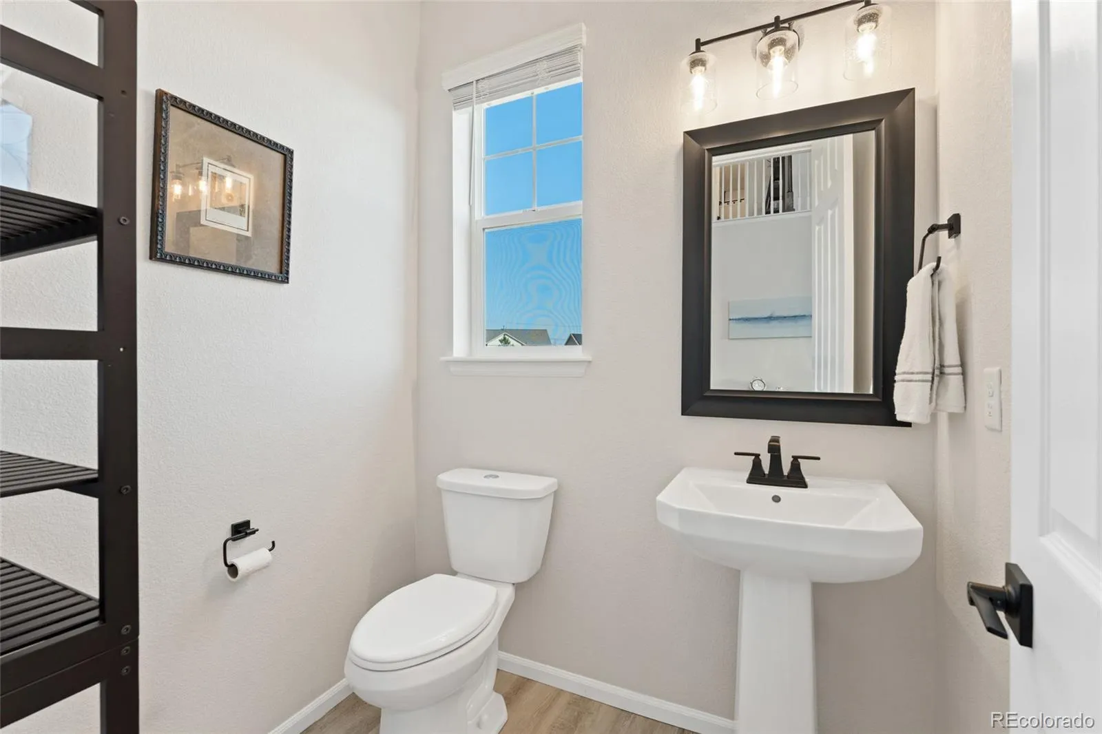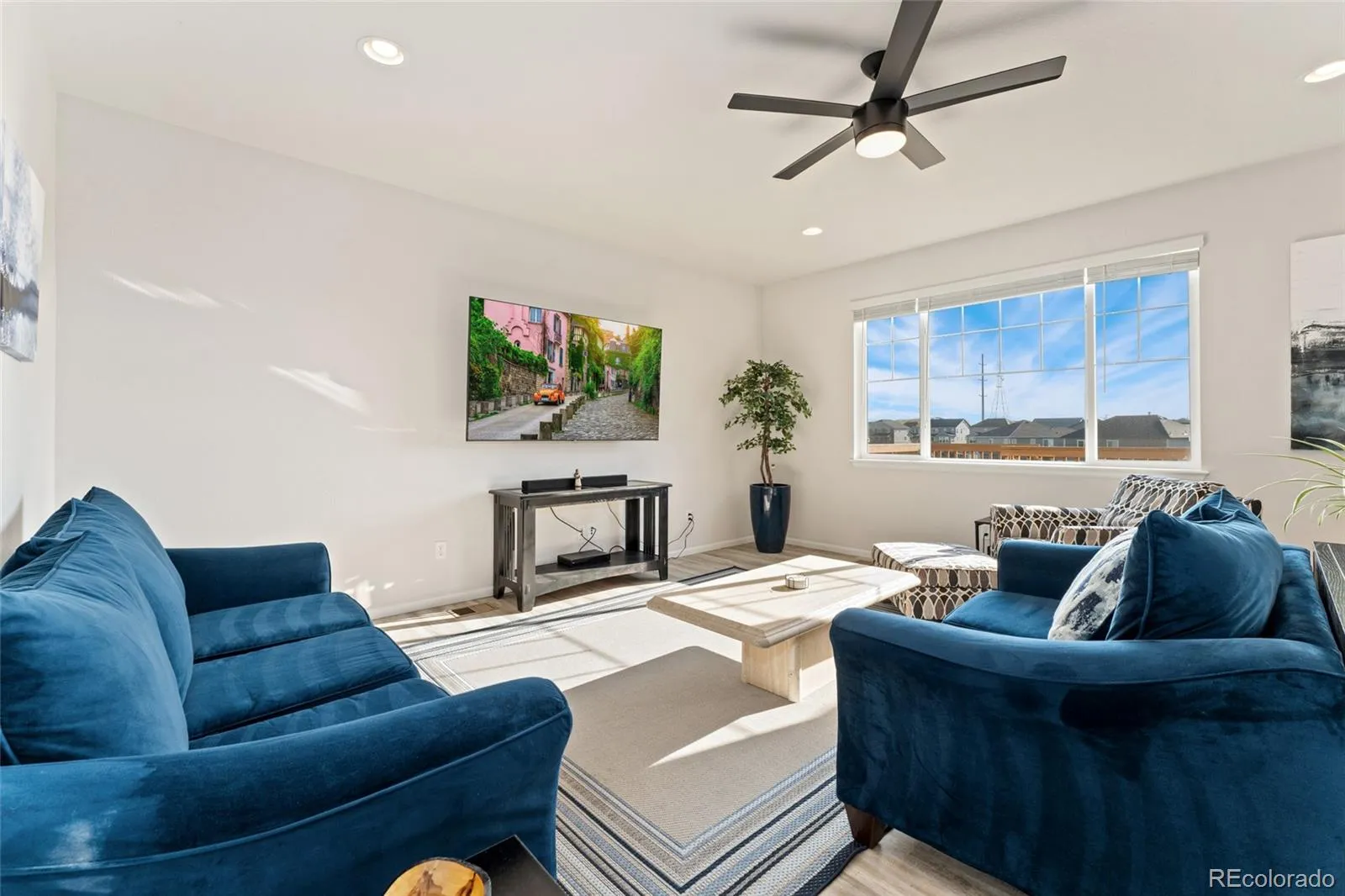 Gorgeous two-story home set on a private lot in southeast Aurora, where open space and wide views create a sense of room to breathe from the moment you arrive. Natural light pours through oversized windows, filling the home with warmth and highlighting the clean lines, bright tones, and tasteful finishes throughout. Thoughtfully designed and extremely well-maintained, this home offers a layout that feels both elevated and easy to live in. The main level flows seamlessly from the living area into a beautifully appointed kitchen, featuring quartz countertops, stainless steel appliances, a striking backsplash, a walk-in pantry, and a large island with breakfast bar seating. Pendant lighting adds a touch of style while LVP flooring runs throughout the main level, creating a cohesive look that is both durable and refined. The open design makes everyday living effortless, and entertaining feels natural. Upstairs, a spacious loft provides flexible living space ideal for a second lounge, home office, or play area. The primary suite is bright and inviting, complete with a five-piece bathroom and a large walk-in closet, offering a comfortable retreat at the end of the day, while additional bedrooms are well-sized and thoughtfully positioned. The finished basement expands the home even further with a large open area perfect for a media room, home gym, or additional flex space. Outdoor living is just as impressive. An elevated deck overlooks nearby open space and walking trails, creating a peaceful backdrop with added privacy. The backyard is designed for ease and enjoyment with low-maintenance turf, clean landscaping, and a patio ready for relaxing or entertaining. Additional features include an increased-capacity water heater installed in 2022. Located in a desirable community with friendly neighbors and close proximity to Southlands Mall, Aurora Reservoir, and miles of trails, this home offers the perfect balance of space, style, and convenience.
