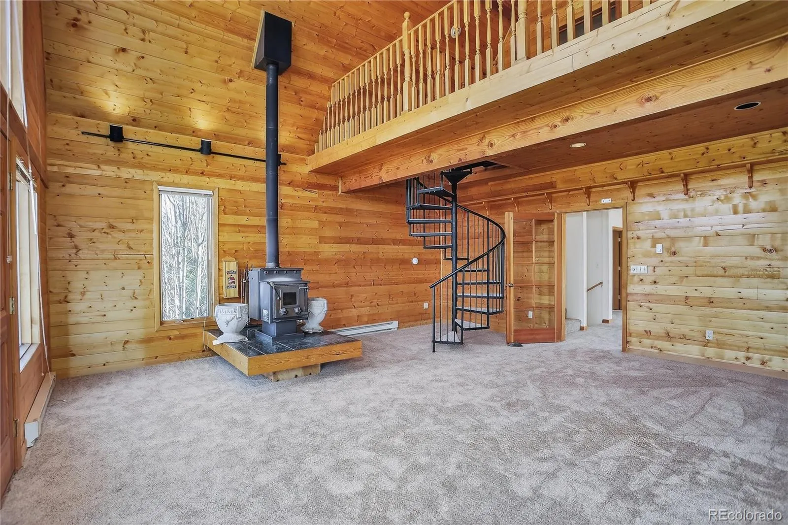The elegant family room showcases knotty pine walls and ceilings, expansive windows, a cozy wood-burning stove, and a striking spiral staircase leading to a lofted space above.