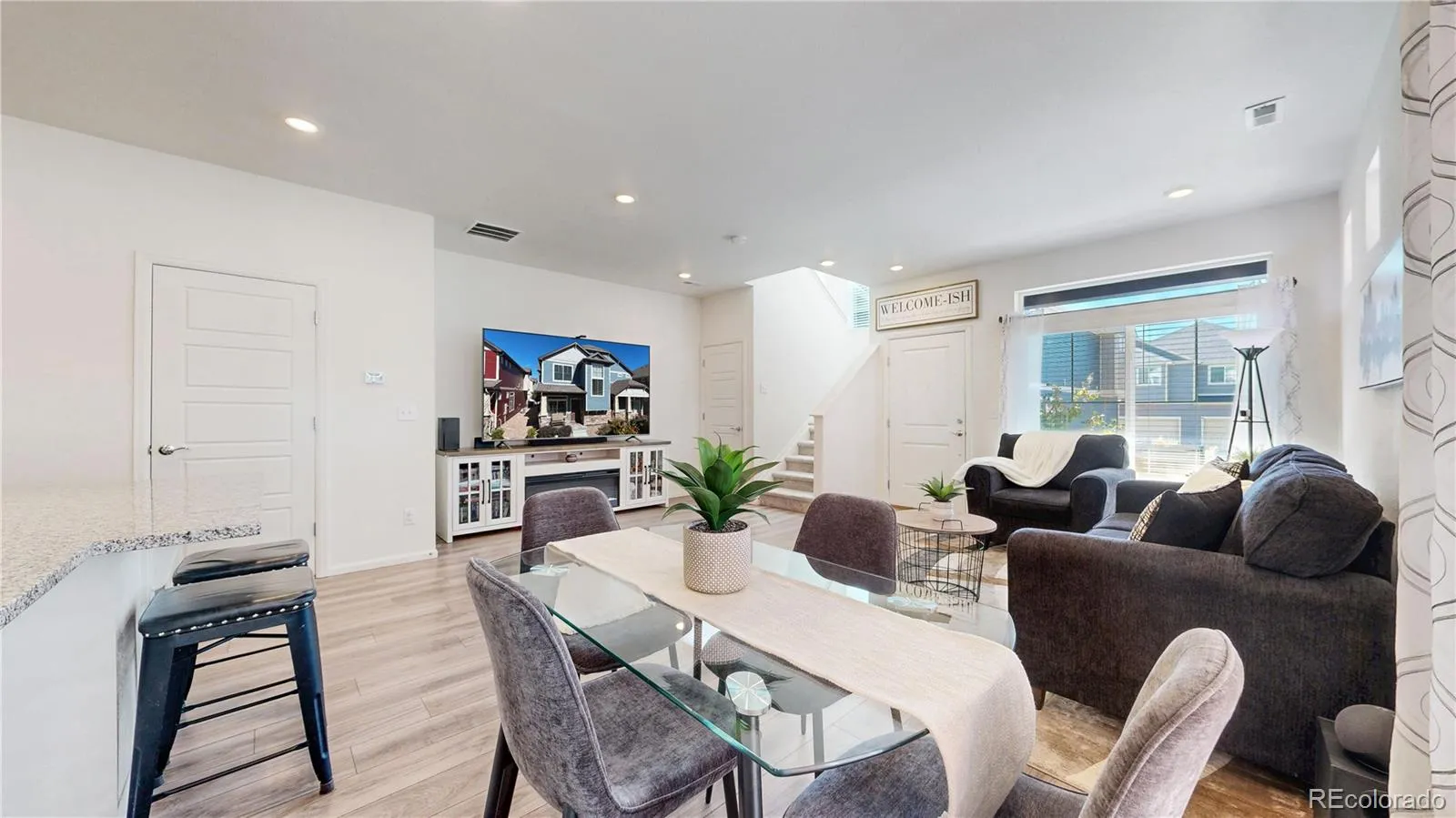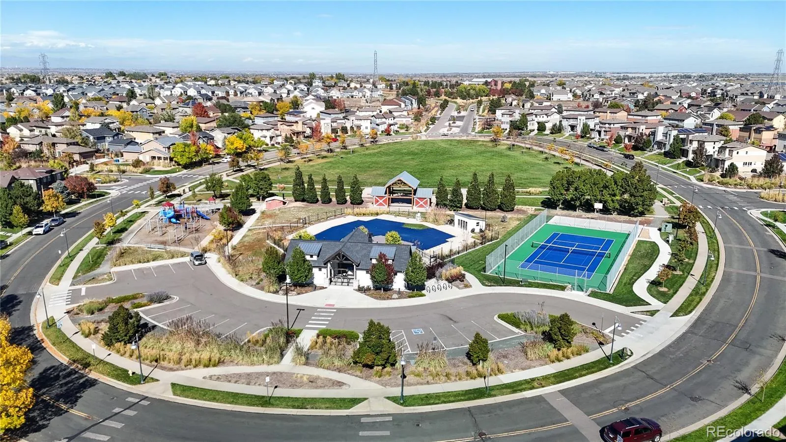 Wow — a nearly new 3-bedroom paired home with a 2-car garage, a rare loft, and a floorplan that stands out among similar homes in the neighborhood. Inside, the bright and open great-room layout is designed for modern living, with luxury vinyl plank flooring that flows from the spacious living area through the dining space and into the kitchen, anchored by an extended granite island with pendant lighting. Clerestory windows bring in abundant natural light throughout. The kitchen blends style and function with shaker cabinets with pull-out drawers, a subway tile backsplash, stainless appliances, a pantry, and a built-in refrigerator nook—offering both everyday convenience and thoughtful upgrades throughout. The main level also includes a powder bath, access to the attached 2-car garage, and additional storage in closets and the crawl space. Upstairs, the large loft is what truly sets this home apart—offering flexible space for a home office, second living area, or playroom, and easily converted into a fourth bedroom. A layout like this offers more usable living space than similar paired homes currently available in the area. The primary suite features a walk-in closet and an ensuite bath with a granite double vanity and tiled walk-in shower. Two additional bedrooms, a full bath, and a convenient laundry room complete the upper level. Reunion offers one of the most amenity-rich lifestyles in the area, including two resort-style pools with slides, a recreation center with gym and basketball courts, over 150 acres of parks and trails, and tennis and pickleball courts. Enjoy a charming front porch, a low-maintenance xeriscaped yard, and a location that puts you just 15 minutes from DIA, 10 minutes to Buffalo Run Golf Course, 15 minutes to Prairie Center shopping, and about 25 minutes to downtown Denver.